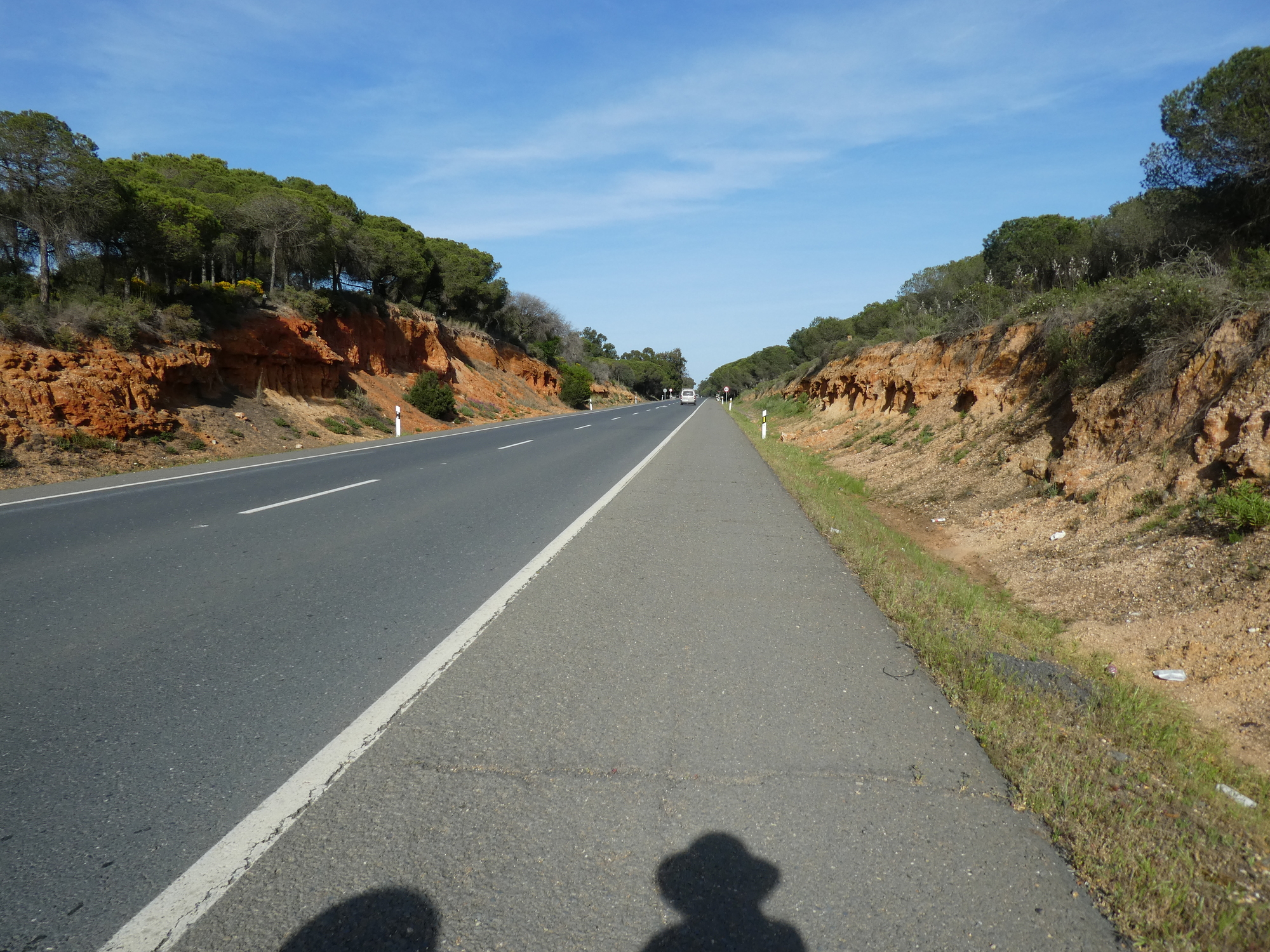 In the photo below you can see that the road included broad red cycleway on either side. As we passed along this, we encountered a local cyclist who asked about our route. He had some good suggestions for getting into or out of Seville. I commented to him that cycling without a shirt in the Portuguese sun was drying out his skin. He shrugged this off, saying this is what his wife is always saying. I am getting Dodie to put sunscreen on my nose now, and I find my lips are cracked and painful. For the first time, I am asking for "chap stick". The sun here really is quite intense. However in honour of our topless confidant, I did take off my windbreaker!