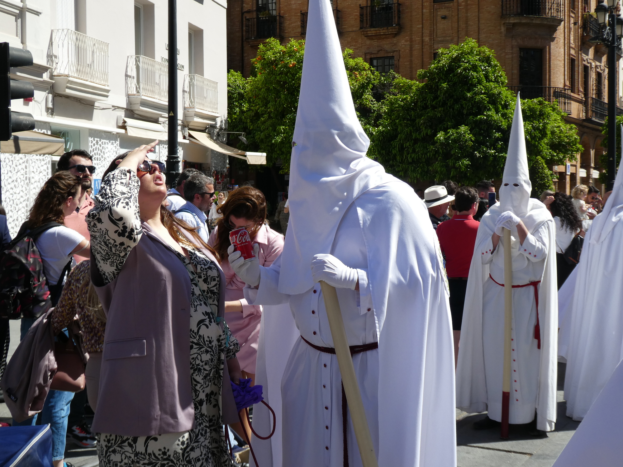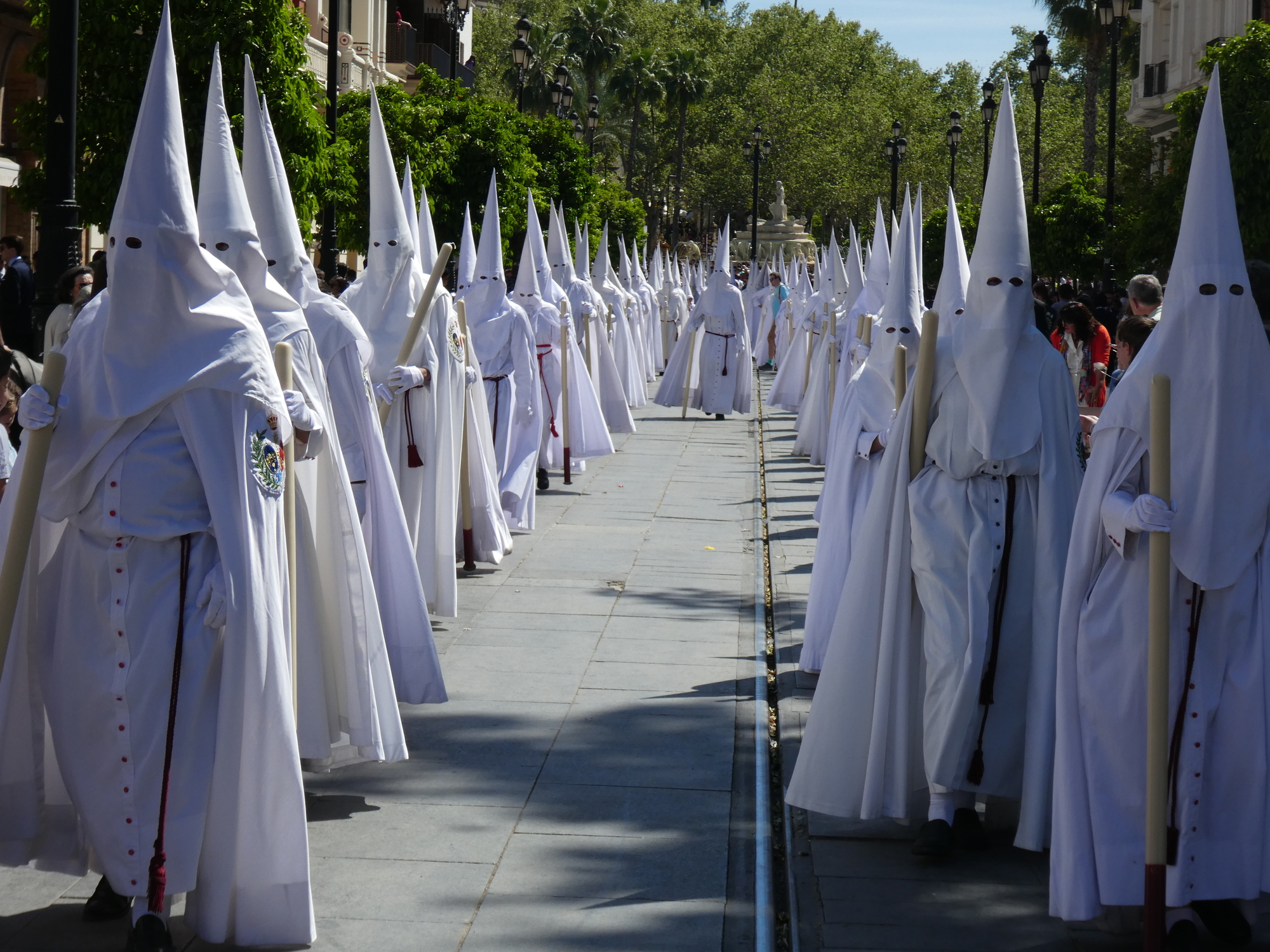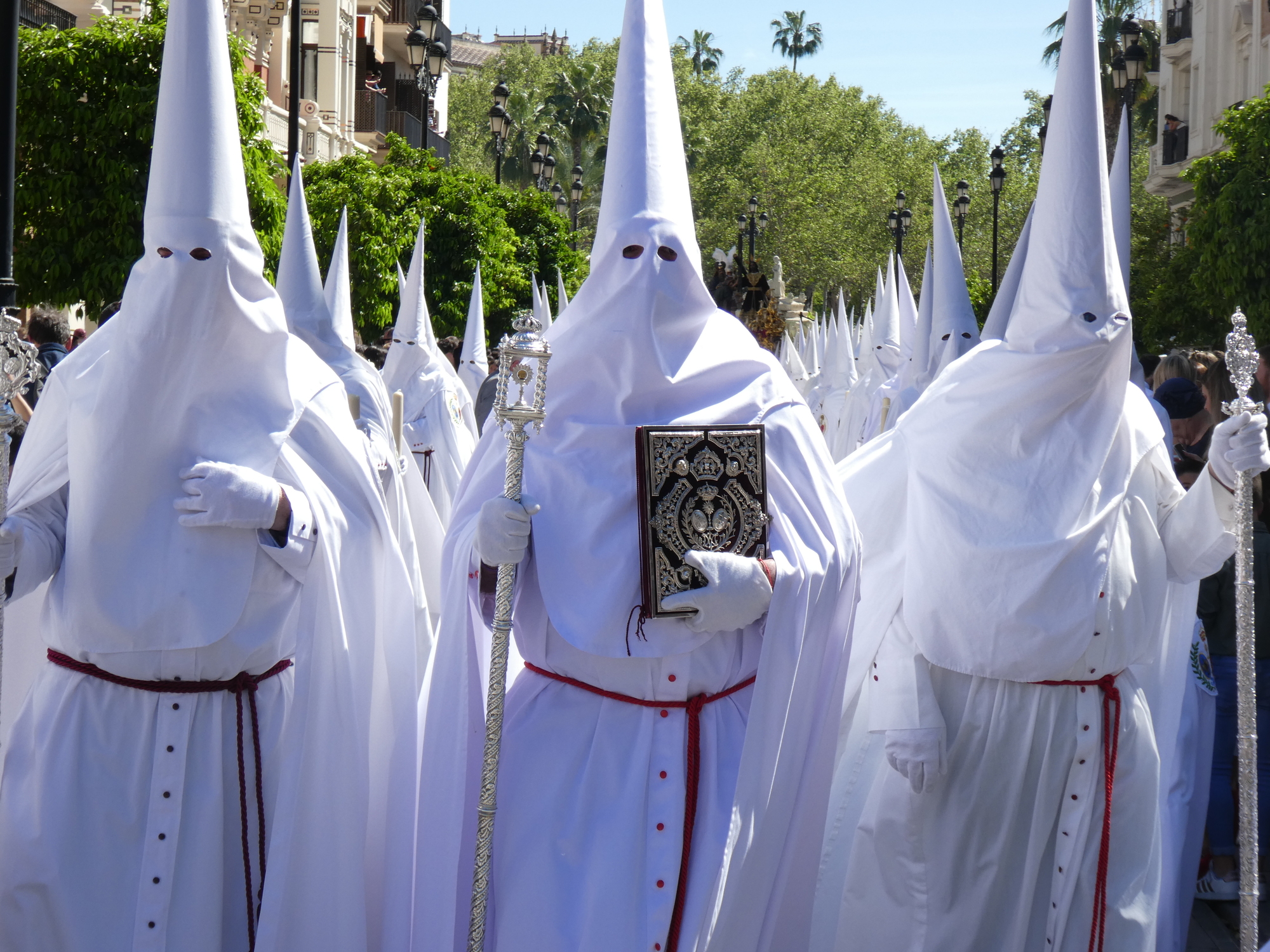 We walked down the avenue near the Cathedral, and stuck a jackpot. There were hundreds, thousands actually, of penitentes (also called Nazarenos), all in robes and hoods (capirotes). (We read there can be 3000!). Some walked in socks, one was barefoot, most in shoes, but the idea of the hoods is that the people are doing their thing anonymously. During the Inquisition, red capirotes were worn by those condemned to death (after their penitence - seems a little harsh?).