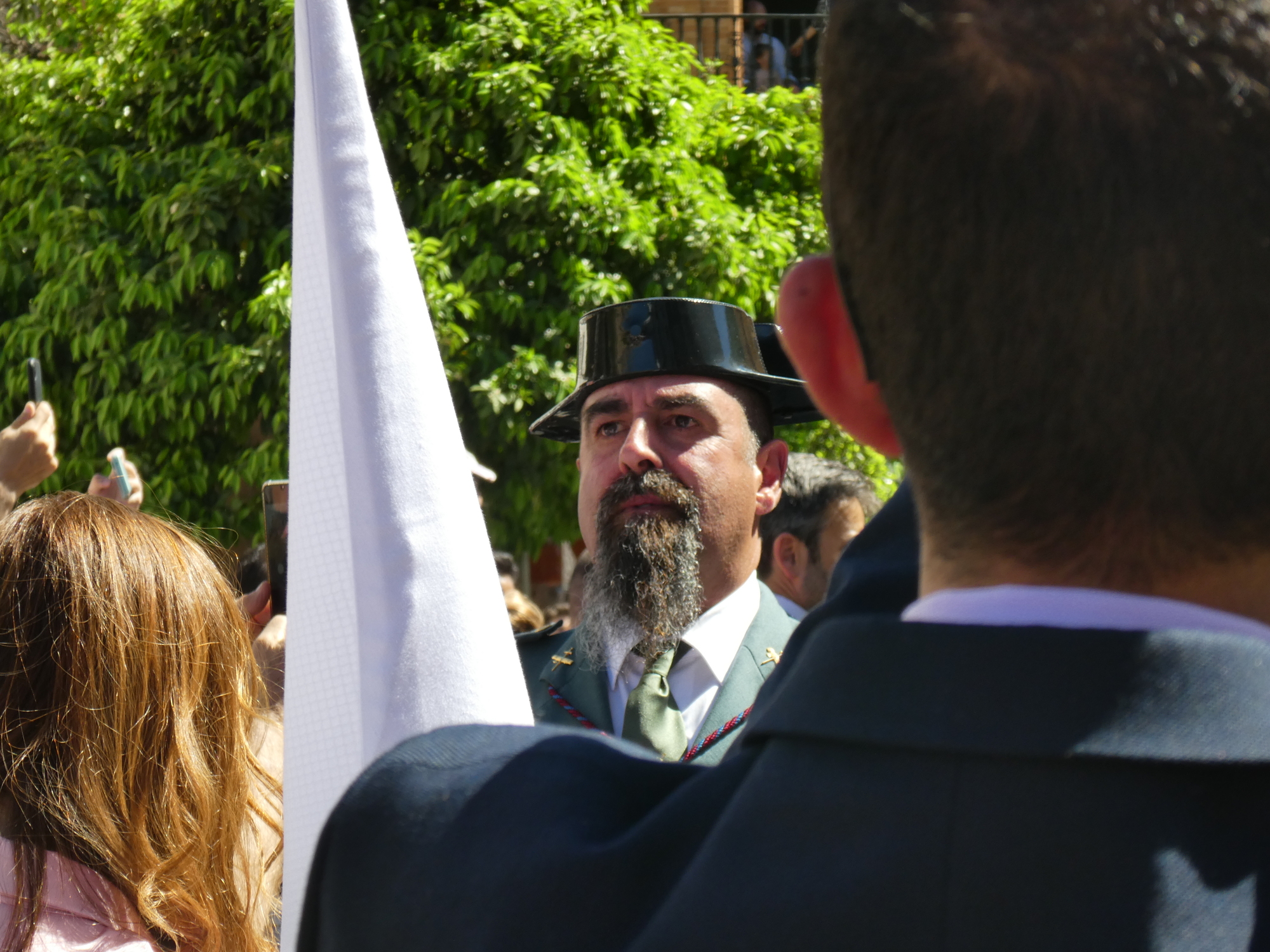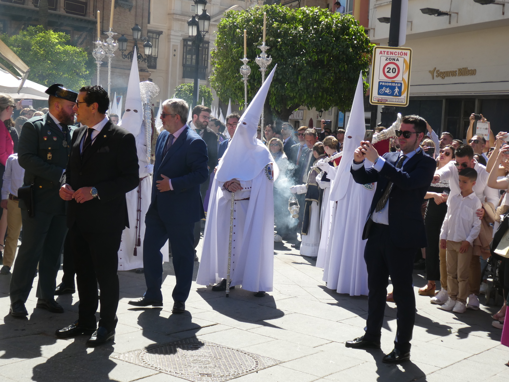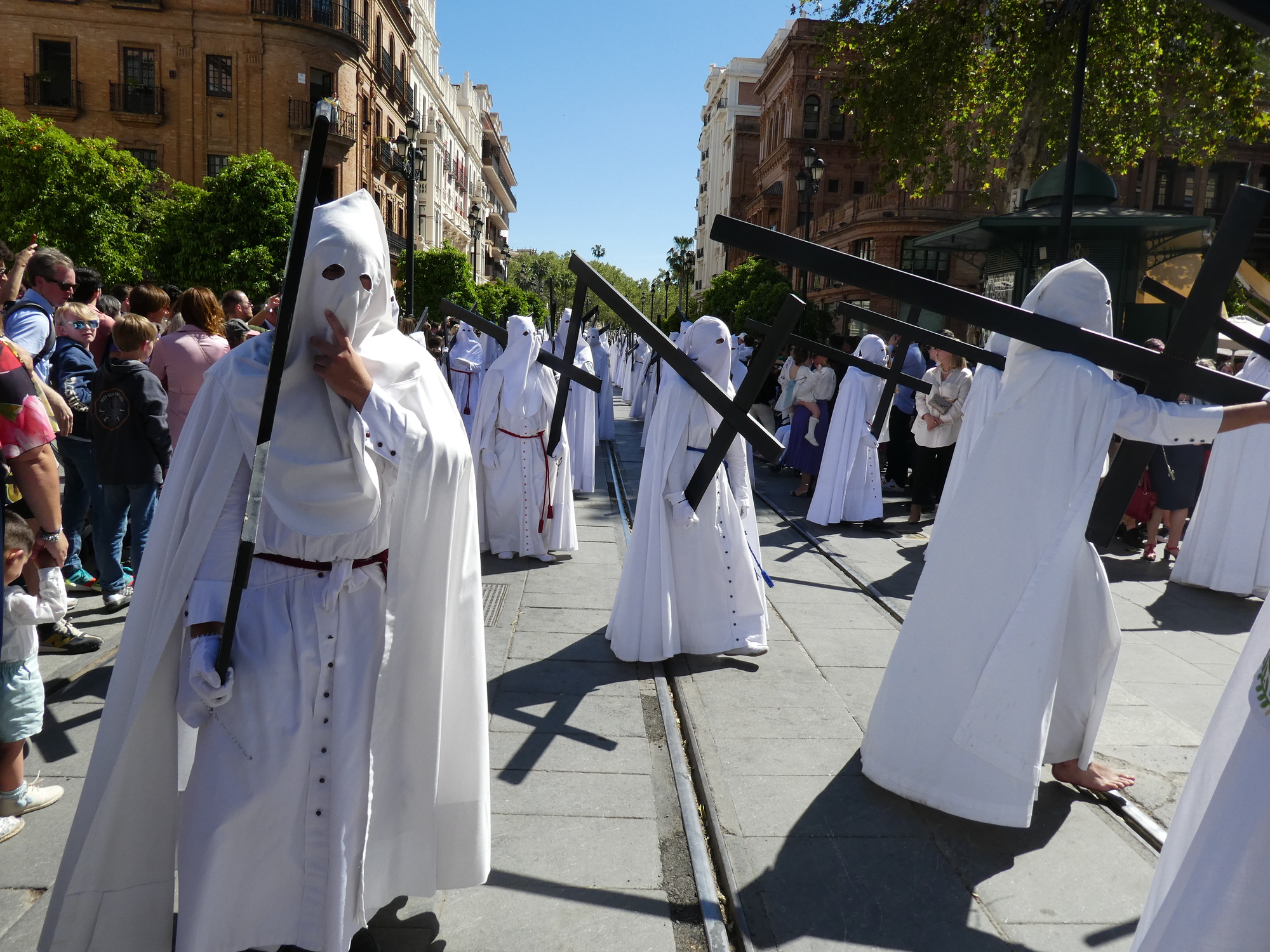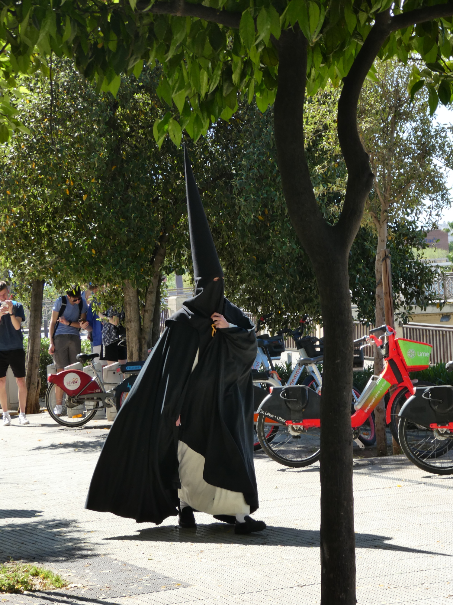 We walked down the avenue near the Cathedral, and stuck a jackpot. There were hundreds, thousands actually, of penitentes (also called Nazarenos), all in robes and hoods (capirotes). (We read there can be 3000!). Some walked in socks, one was barefoot, most in shoes, but the idea of the hoods is that the people are doing their thing anonymously. During the Inquisition, red capirotes were worn by those condemned to death (after their penitence - seems a little harsh?).
