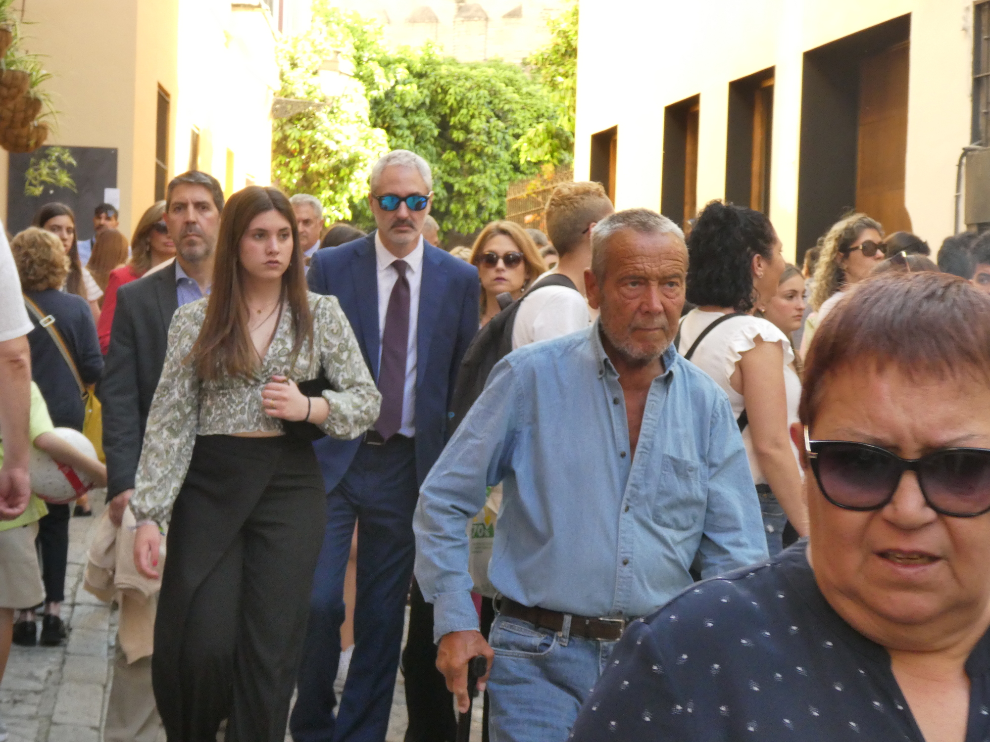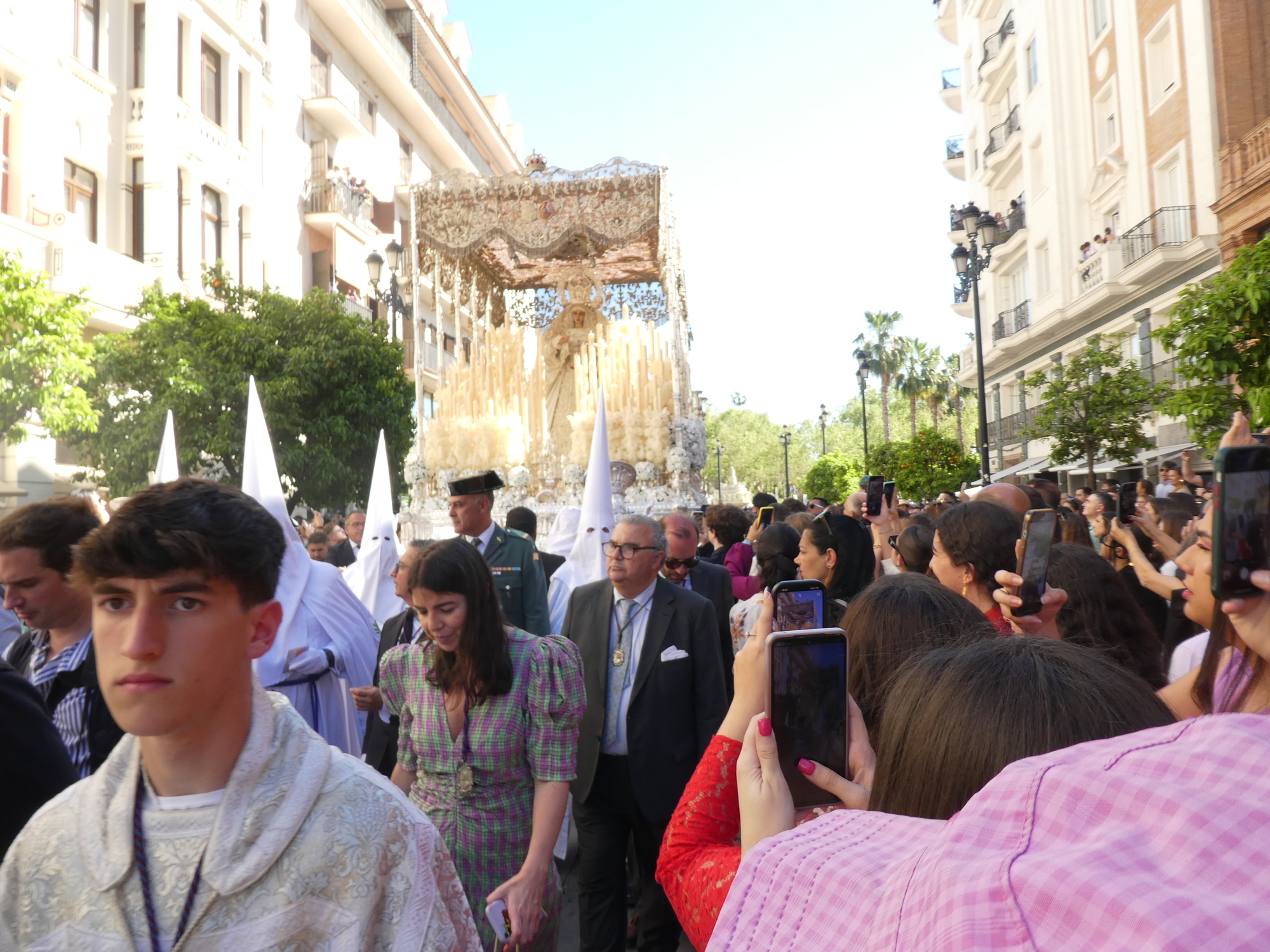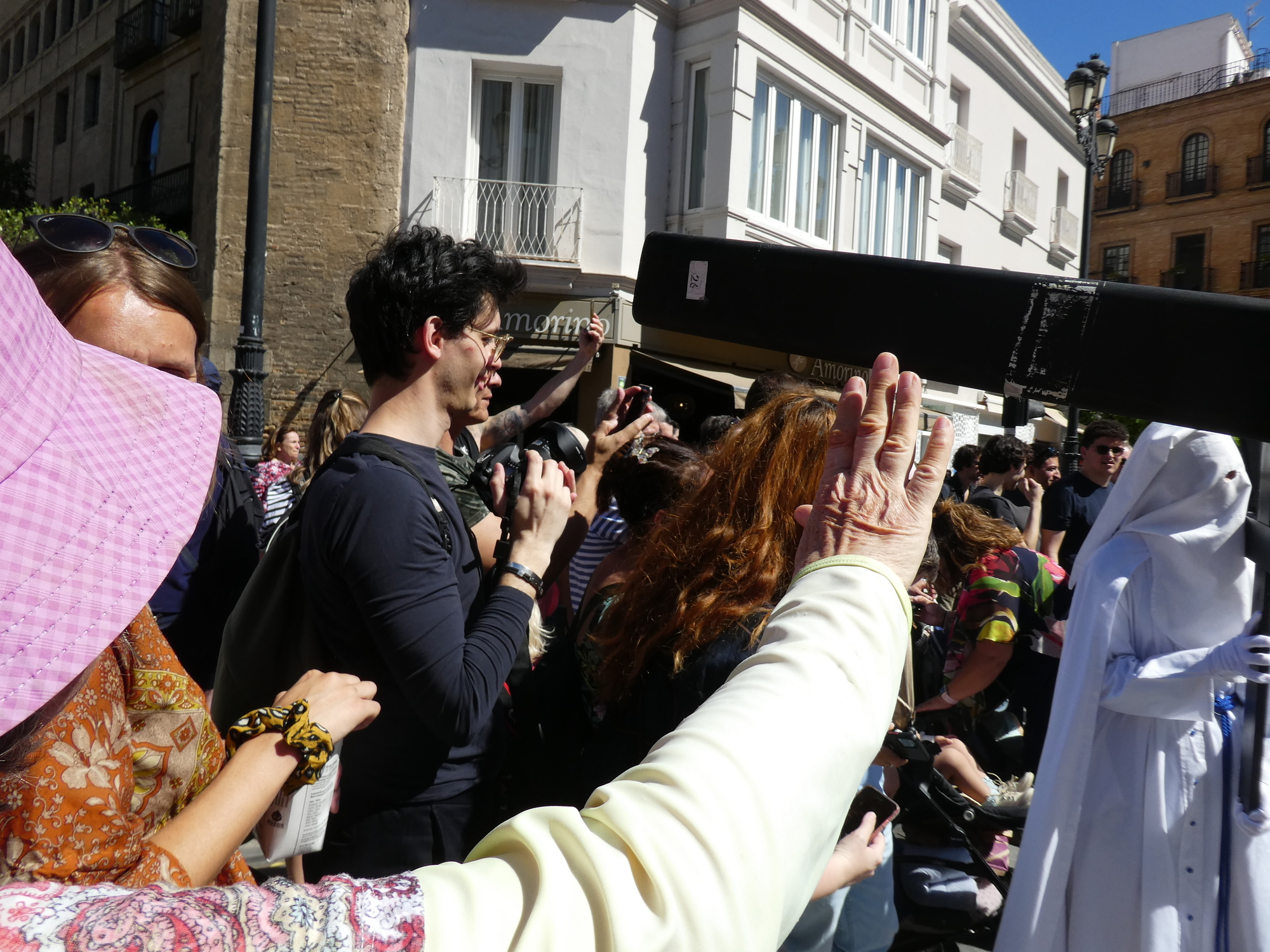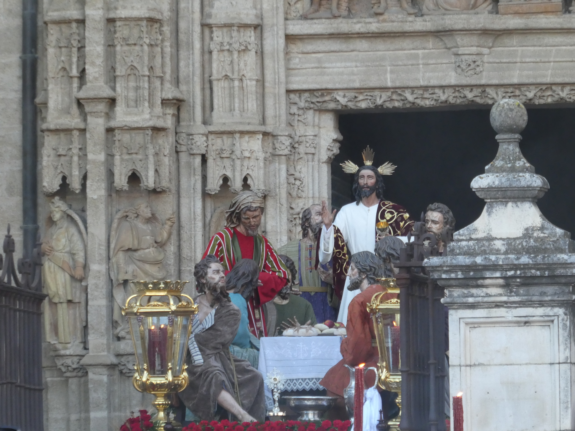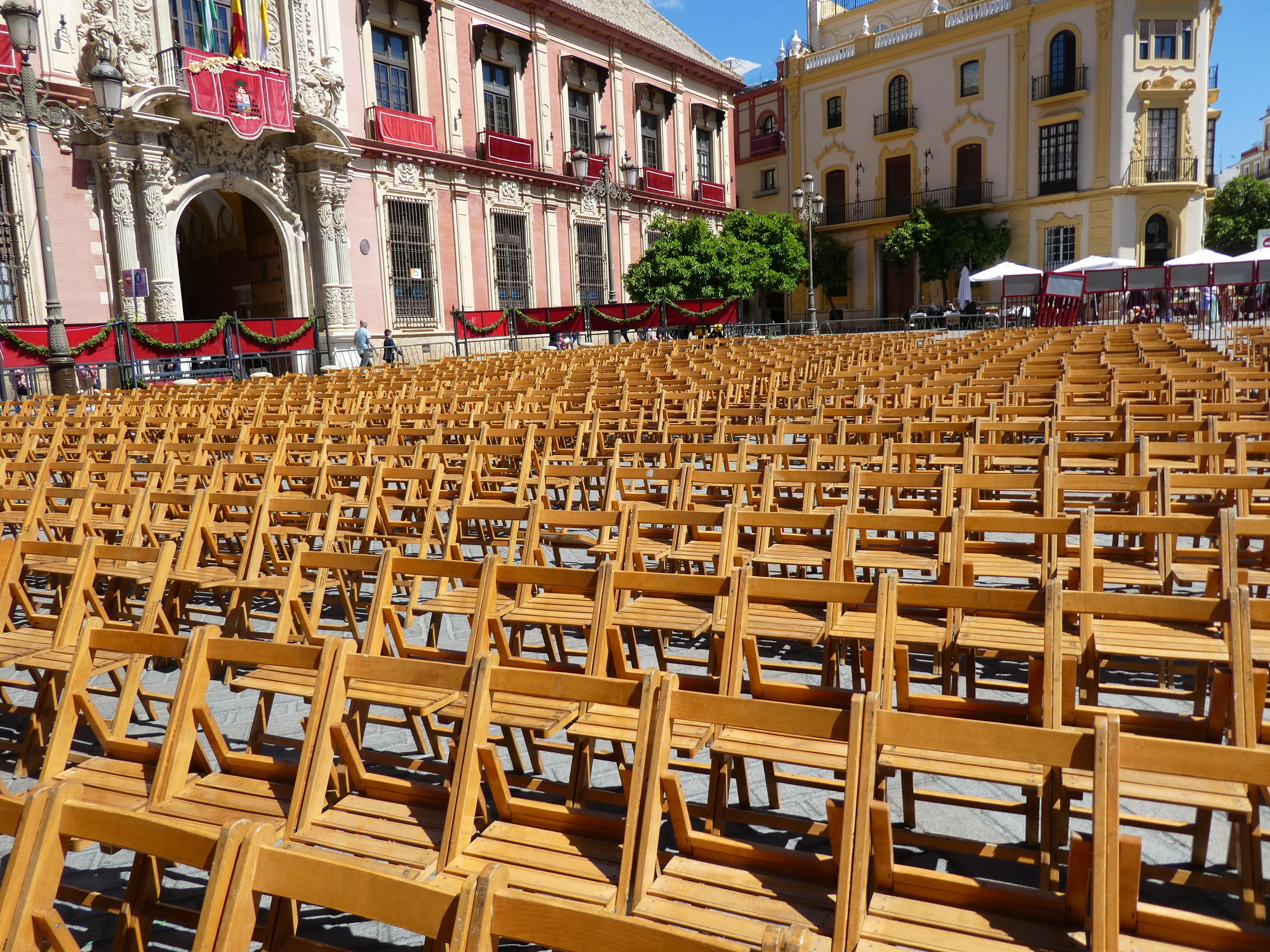 Our main ambition today was to see some Pasos, which are processions of Easter floats, carried underneath by adherents, and heading for the Cathedral. We have seen these floats hiding in "garages" - chambers within churches, waiting for their chance to exit for their walk of glory. Reading the guidebooks, we expected throngs of people, with the best viewing spots, not to mention chairs, snapped up and paid for long ago.