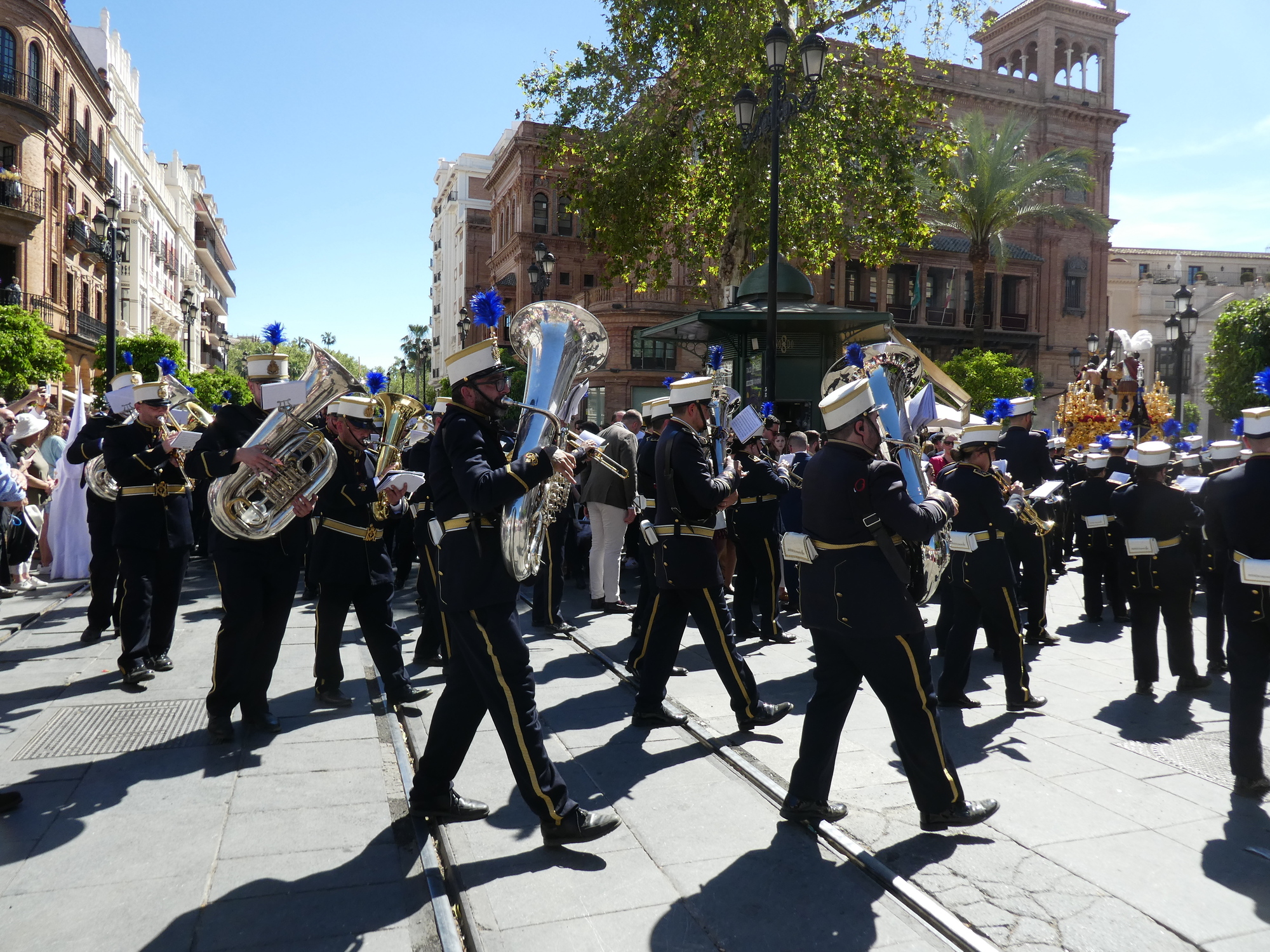 Summary: We have been super impressed with Seville. It is a beautiful city, with a mix of wide open areas and maze like alleys, and greenery everywhere. Today was also just what we hoped for when we planned to come on this weekend. It remains rather mysterious about what the people get out of the floats and parades and the dressing up in tight dresses and blue suits, and all. Does it all have a deep meaning for them, or like for us, is it just great fun?