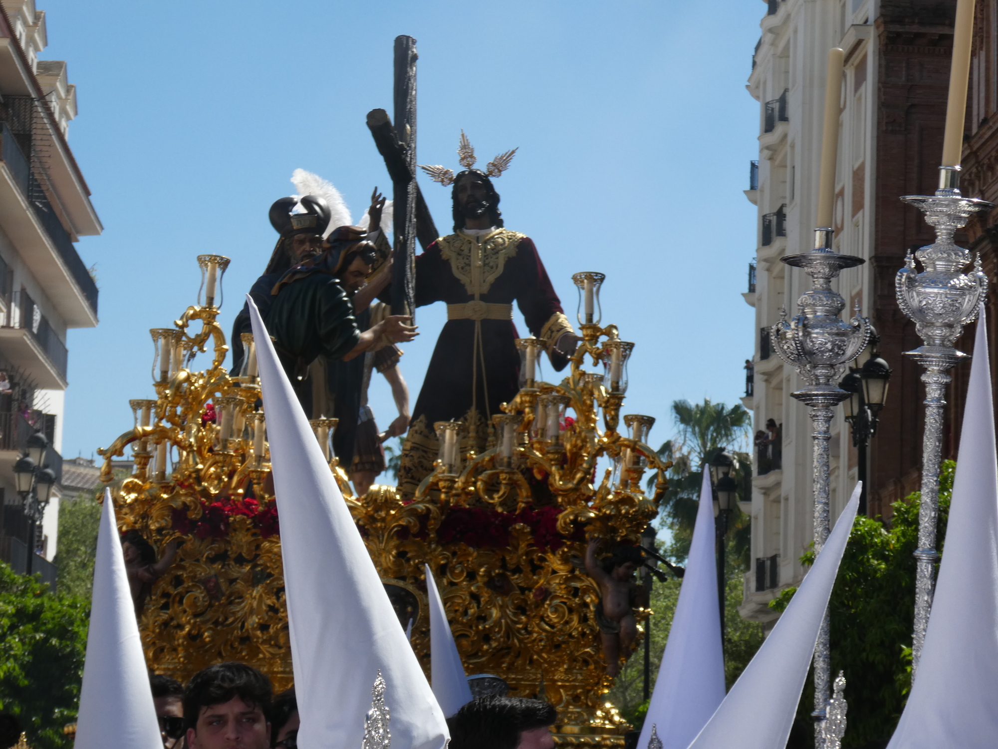 After a long while, the penitentes were followed by their float, and a large band. Amazingly we had a right up front view, so much so that we had to fall back a bit to avoid being run over by the float as it hung a left in front of us. After the float, still rivers of penitentes came, and then another float.