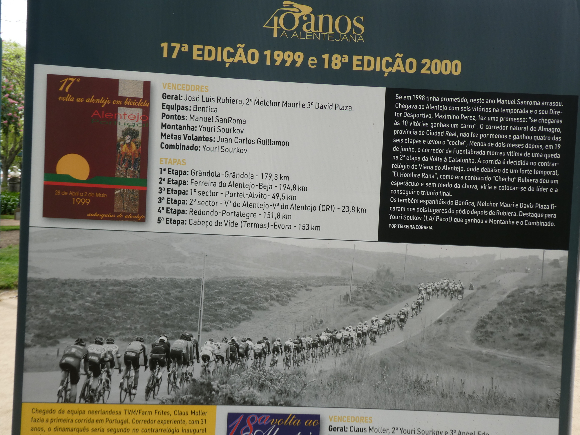 We often look at the statues in roundabouts at the entrances to towns for clues about their self image. After our relatively grueling ride thanks to local drivers, we were surprised to find cycling featured at the entrance to town. But yes, it was homage to a local cyclist. It was not a one off, either, for when we sought out the Jardim Publico to eat our sandwiches in, it had a major retrospective of some cycle race with a 40 year history here.