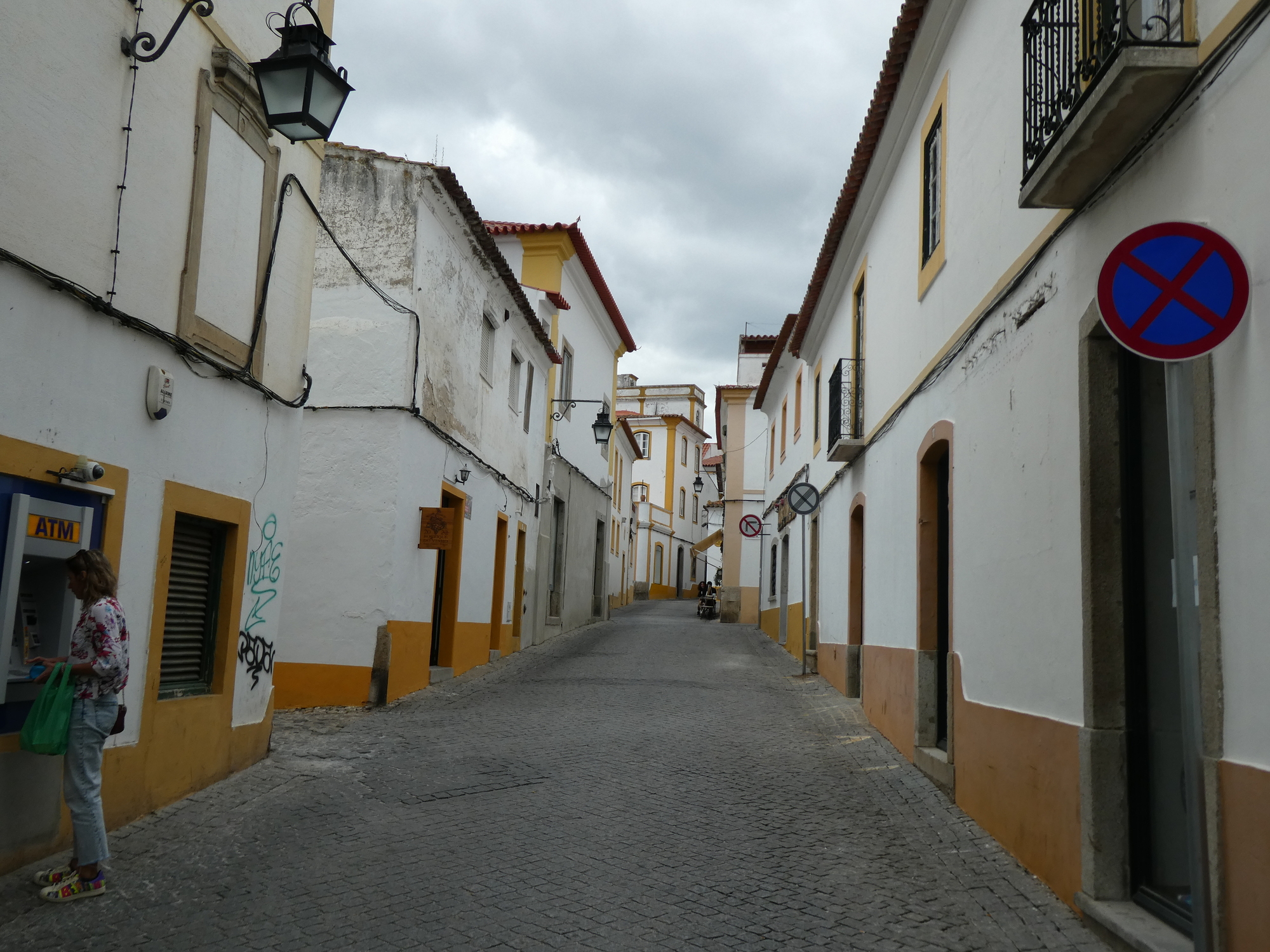 Cars, that had been bugging us during the early part of the day on the highway continued to do so in the narrow streets of Evora. In many cases there was not really room for pedestrians, plus parked cars, plus moving cars, and certainly there were no sidewalks. At one point when Dodie advised me to "get out of the road" I was quite snarly about it. But have a look at the shot below. Cars should not be here. I would have loved to see that thing lose a mirror!