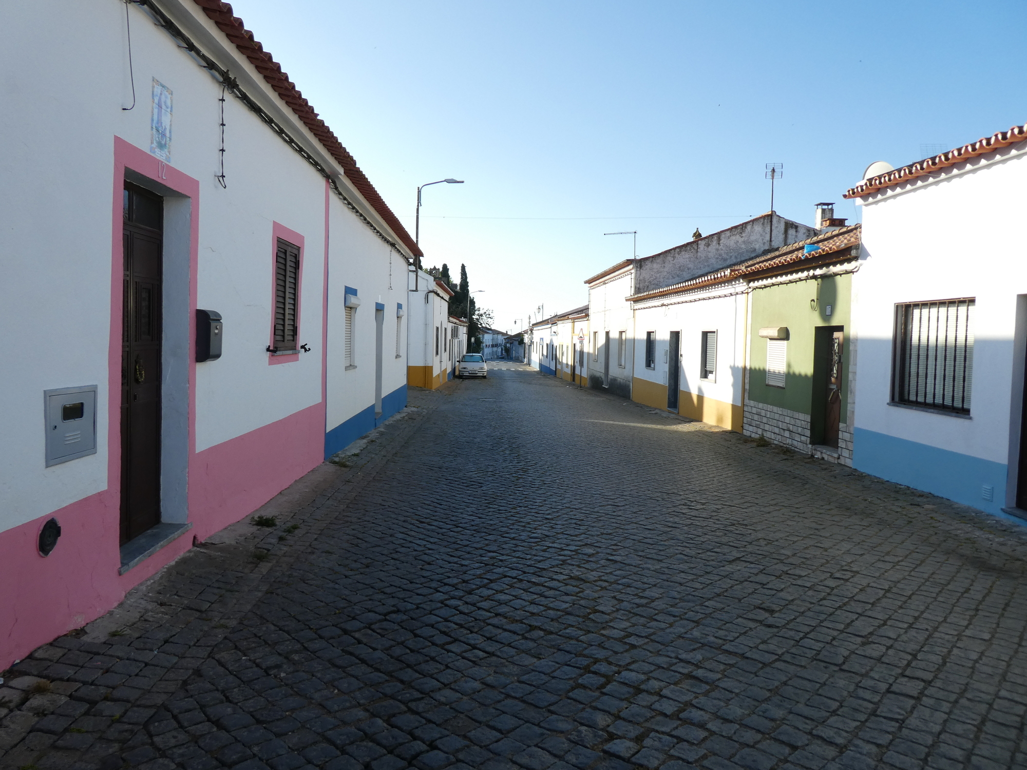 Our way from Alvito toward Evora did not take us through Alvito town, such as it may have been, but we did peek at the outskirts. It was a typical scene for these parts - low lying, joined together buildings, very plain but with some pastel touches.