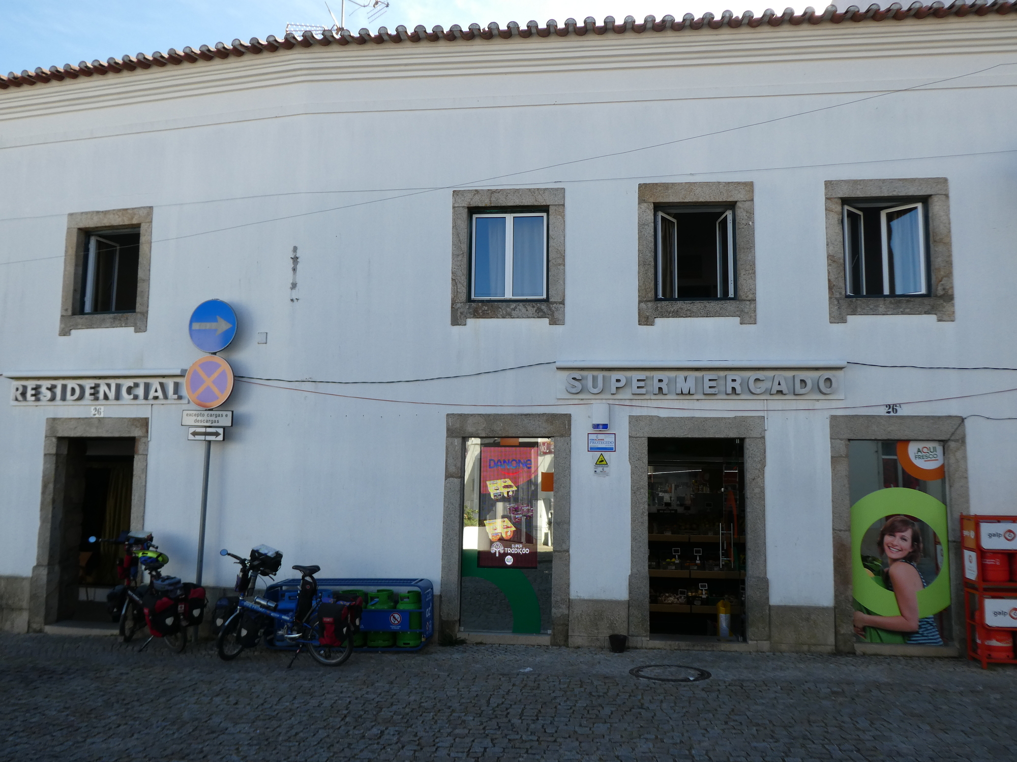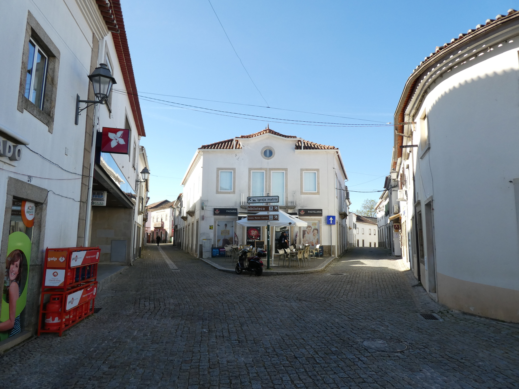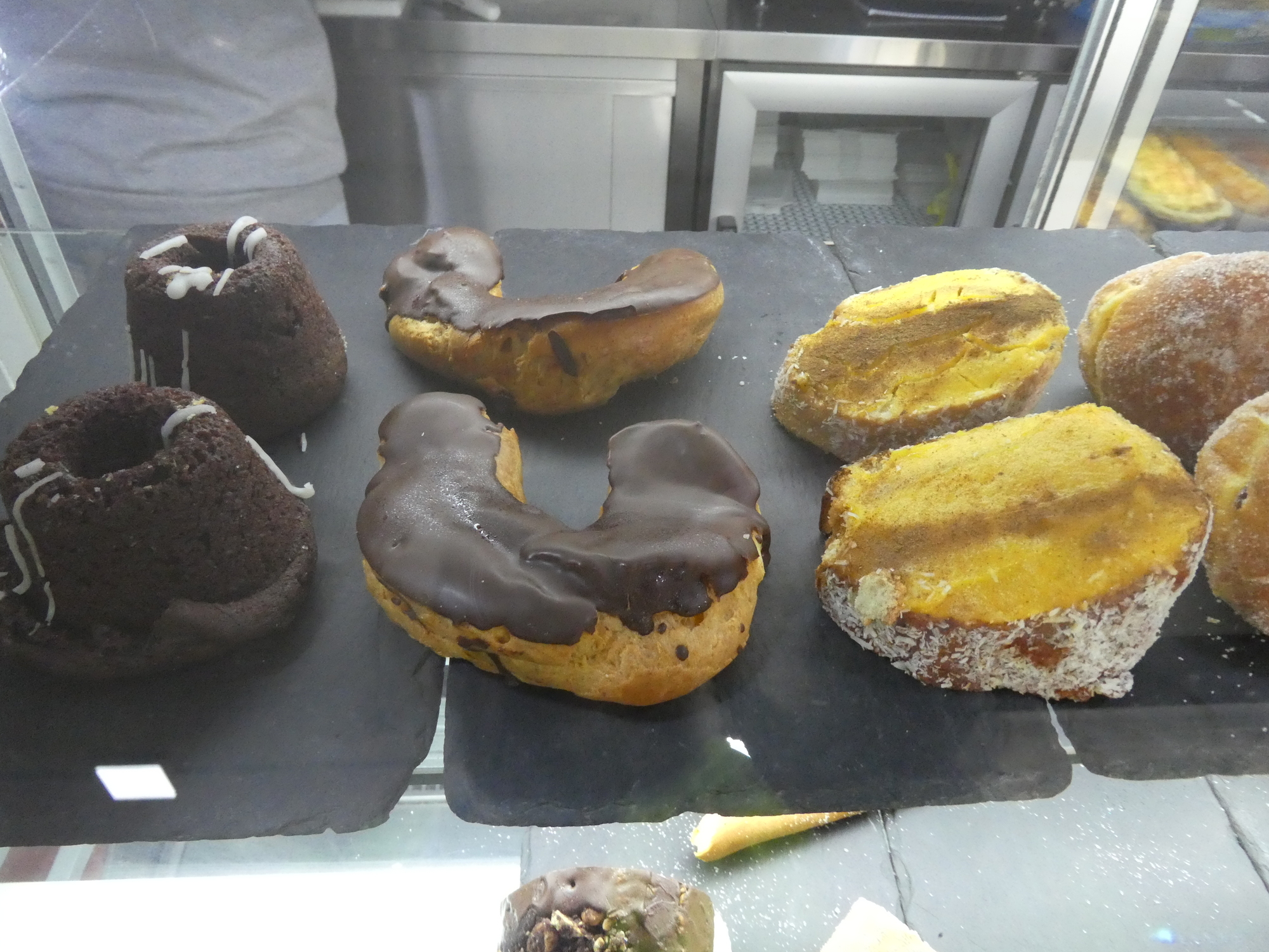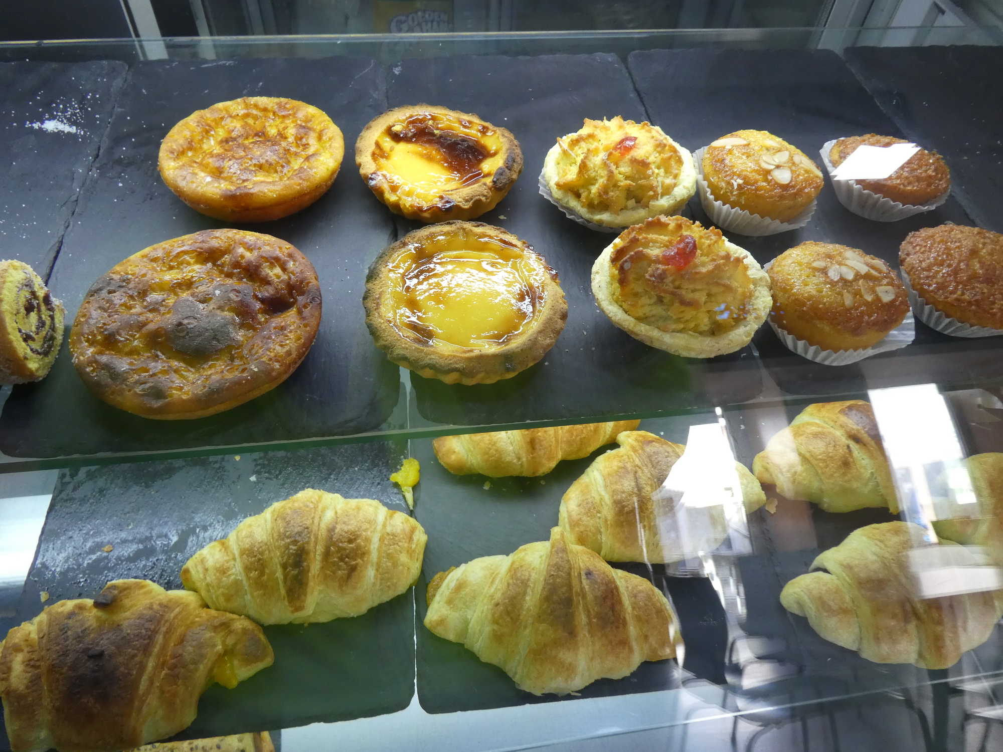 We found the Supermercado easily and sent Dodie in to see what snacks they might have. This allowed me to look around, and so to spot the bakery across the way. When Dodie came out (with nuts and raisins, which are good) I proposed a visit to the bakery, just to see what they might have. I did mention "eclair" which is my goto item, and Dodie had to strongly remind me that this is not France. As it happens they did have eclair, but having been cautioned, and given that the eclairs did look a little weird, I went for some other darn thing. Of course they also had pastel de nata, which could have been a good standard choice for here.