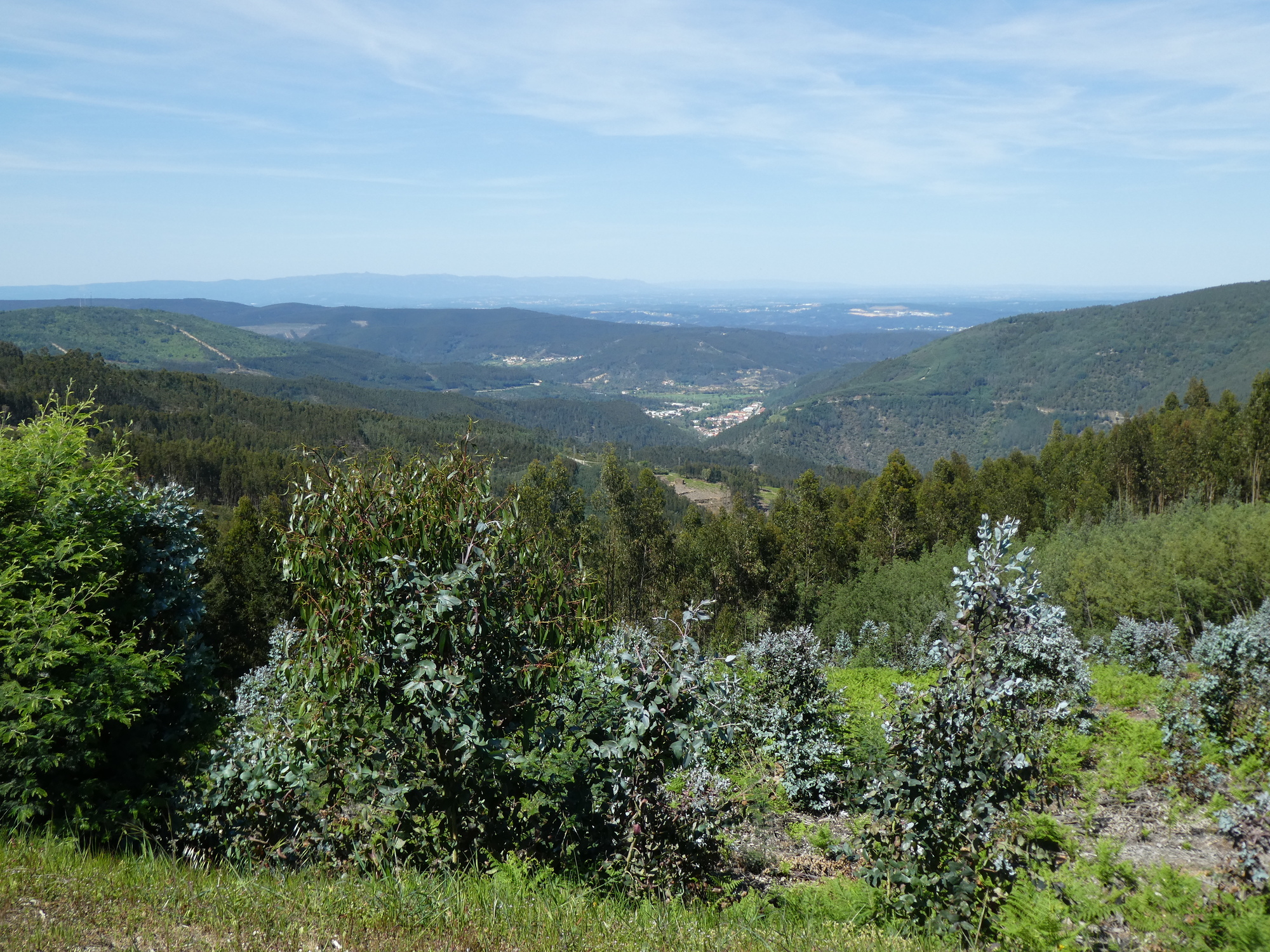 Now the tables were turned, and it was unrelenting down, down. We had to stop periodically to rest our brake fingers. After a while, Gois appeared over the side. From this perspective, you can see that it is in a bowl, and as with other towns we had looked down on during the ride, it seemed like one would not want to live like that, in a "hole". However when we did get into the town, things seemed normal, in the sense of there being nice mountains to look at (everywhere).