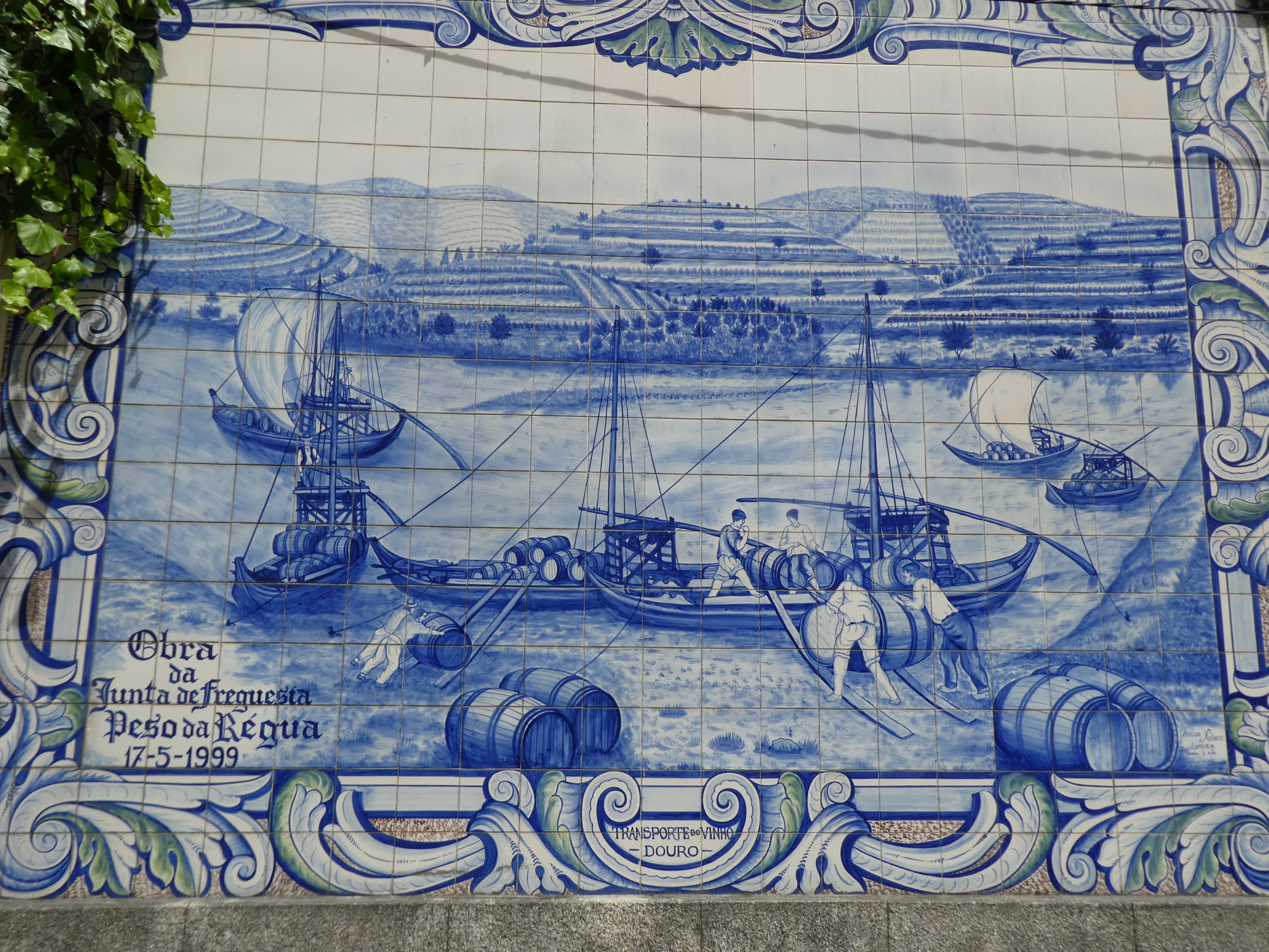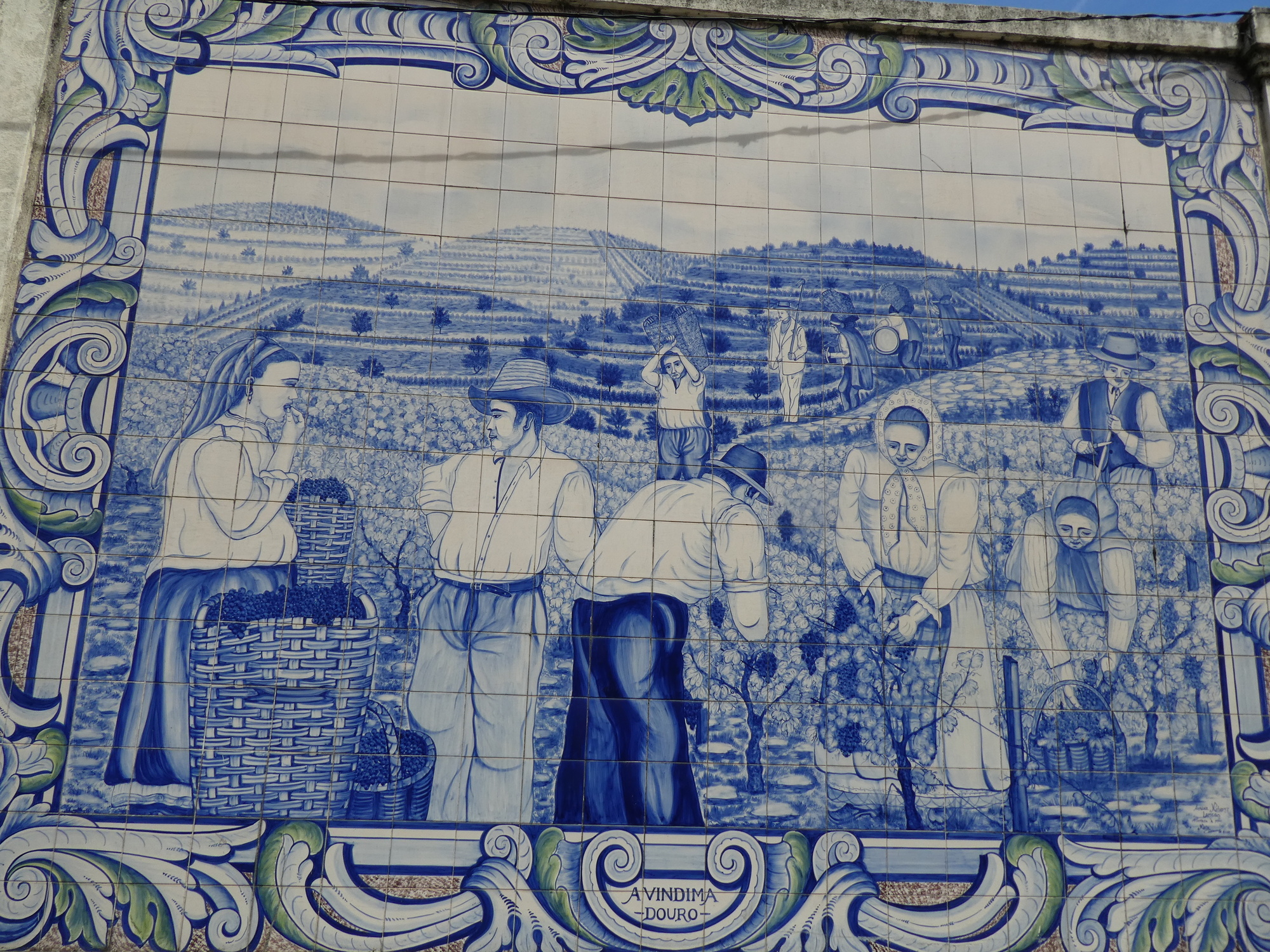 It was too early to quit for the day, so we left our rear bags and the hotel and headed off again, north, in the direction of Vila Real and ultimately, Chaves. We new we would not reach these, but anyway we could scout the road for any possible future attempt. Just down the street from our hotel was the train station, which features some frescoes we had read about. They are in the blue tile, azulejos, so common in the country, and they depict scenes from the wine industry here. There are perhaps six panels, but I only shot two, at random.