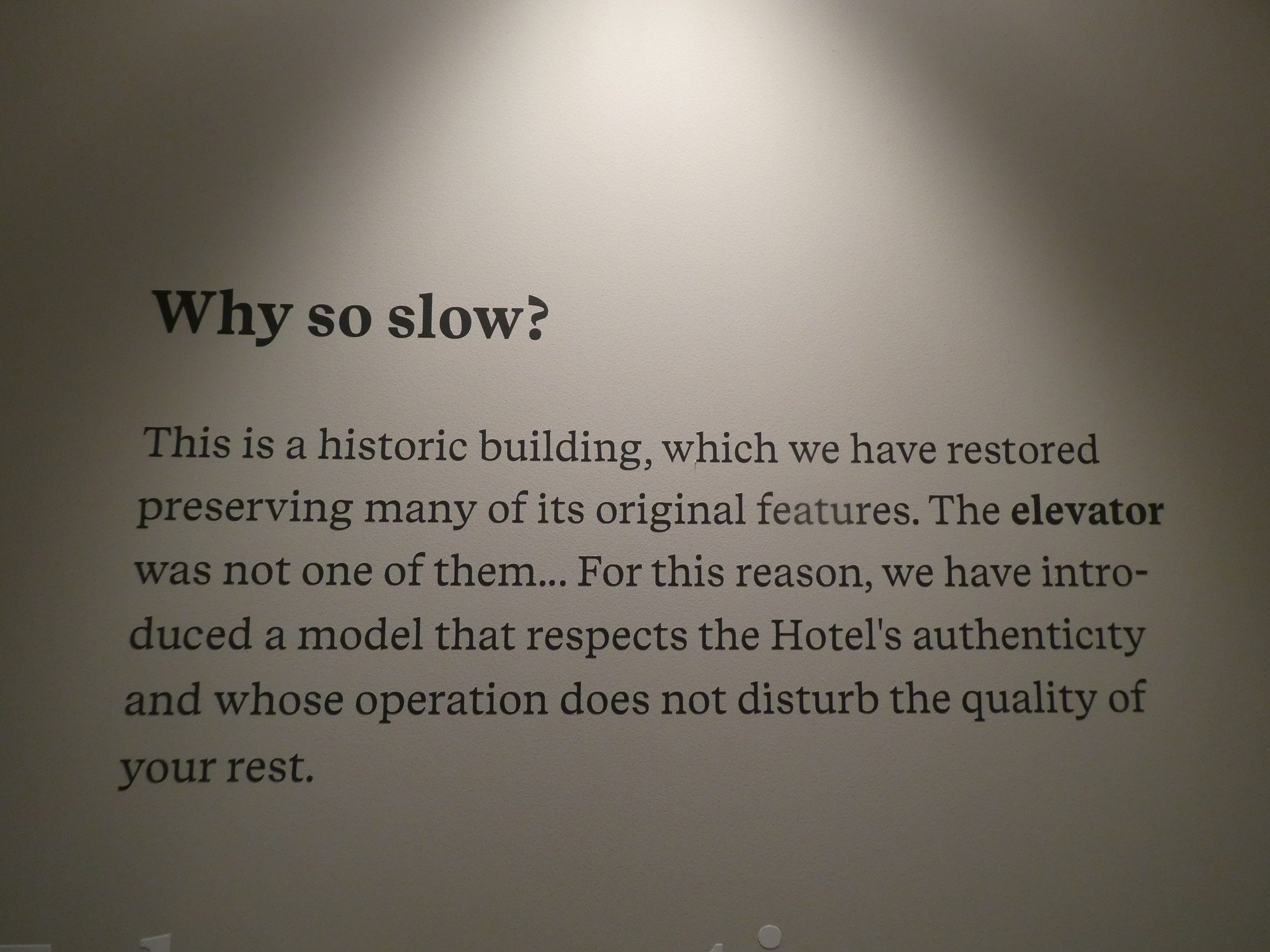 On the other hand our get up and go attitude is countered by any laid back vacation spirit that may be lurking about. For example the elevator - the slowest one on the planet! Inside they have following messages to calm down any Grampies: