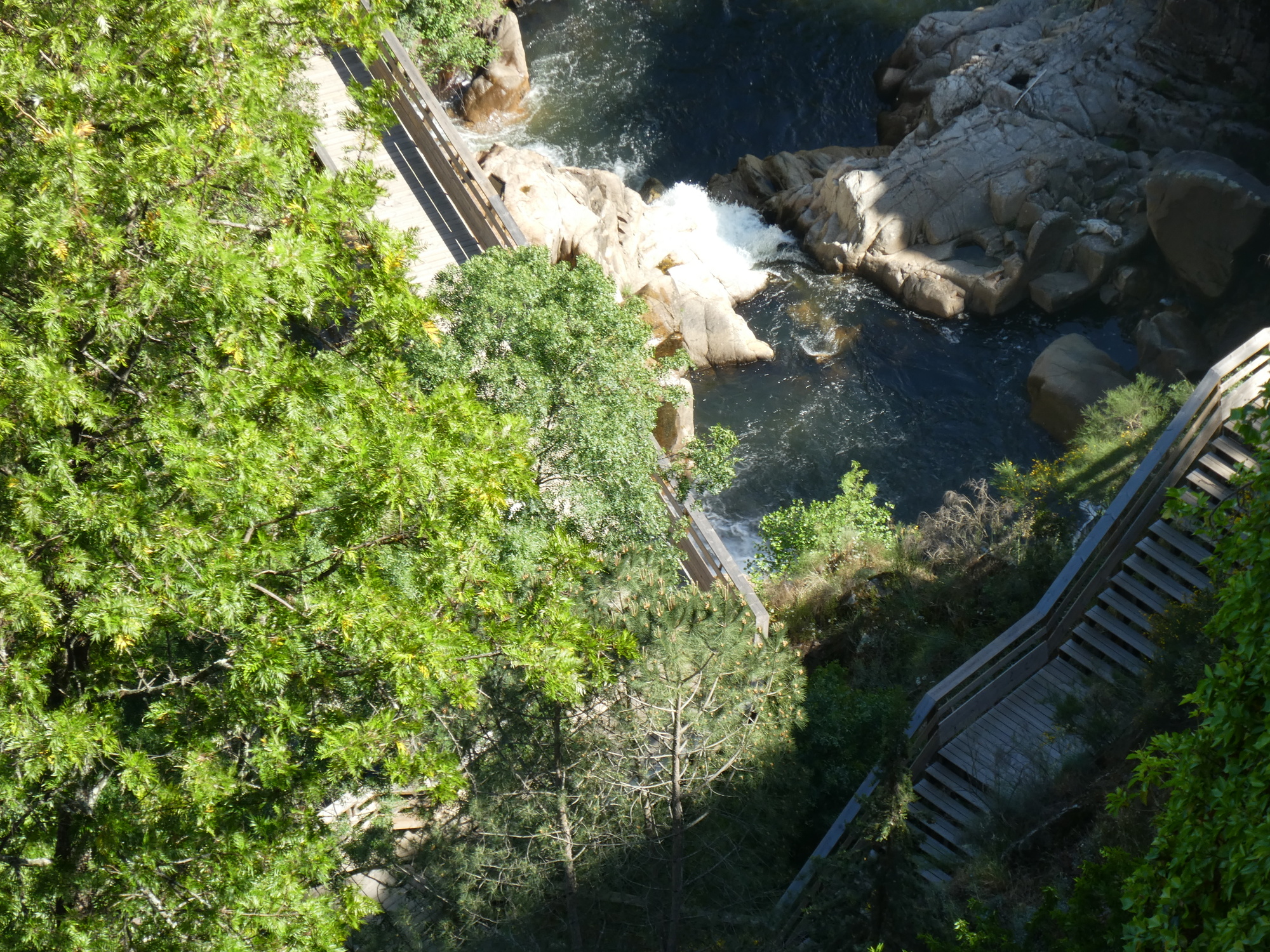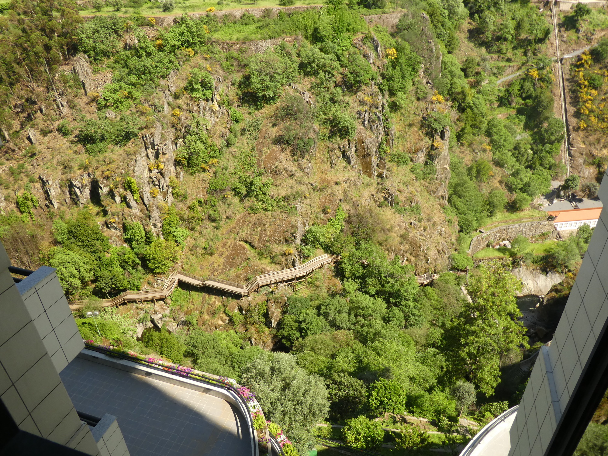 Our hotel is called the Miracorgo - or Corgo view. Boy is it ever! At least here, the Corgo runs through a small rough gorge, and the hotel is built right on the edge. Below are views from our window. Apparently that Corgo trail runs right by here! If that wooden stairway is part of it, then it would not have worked for bikes! Also, if the Corgo is nearly as rough as this between here and Regua, then there was no chance of us using the trail on the way up. Still, our map for right here enticingly shows the trail. Maybe tomorrow we'll go look for it again.