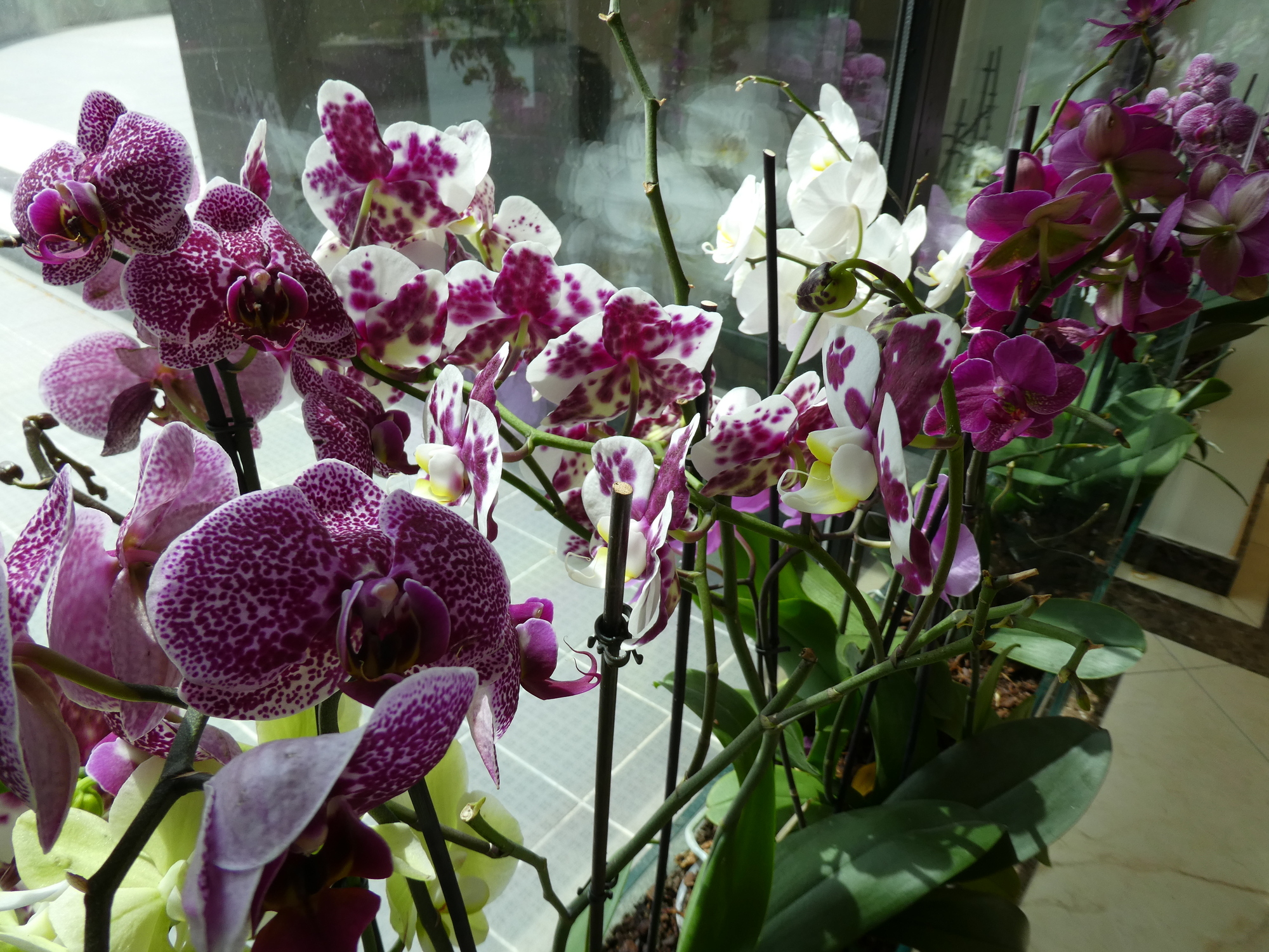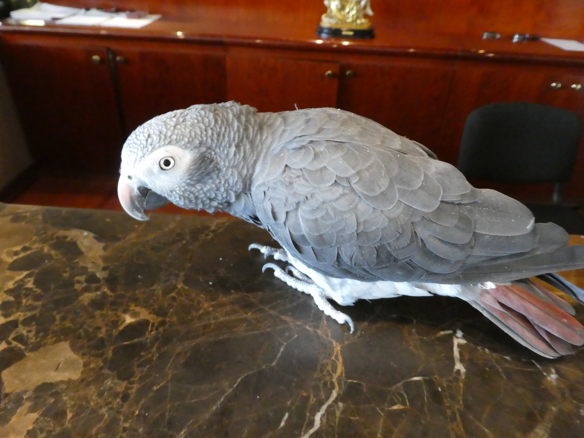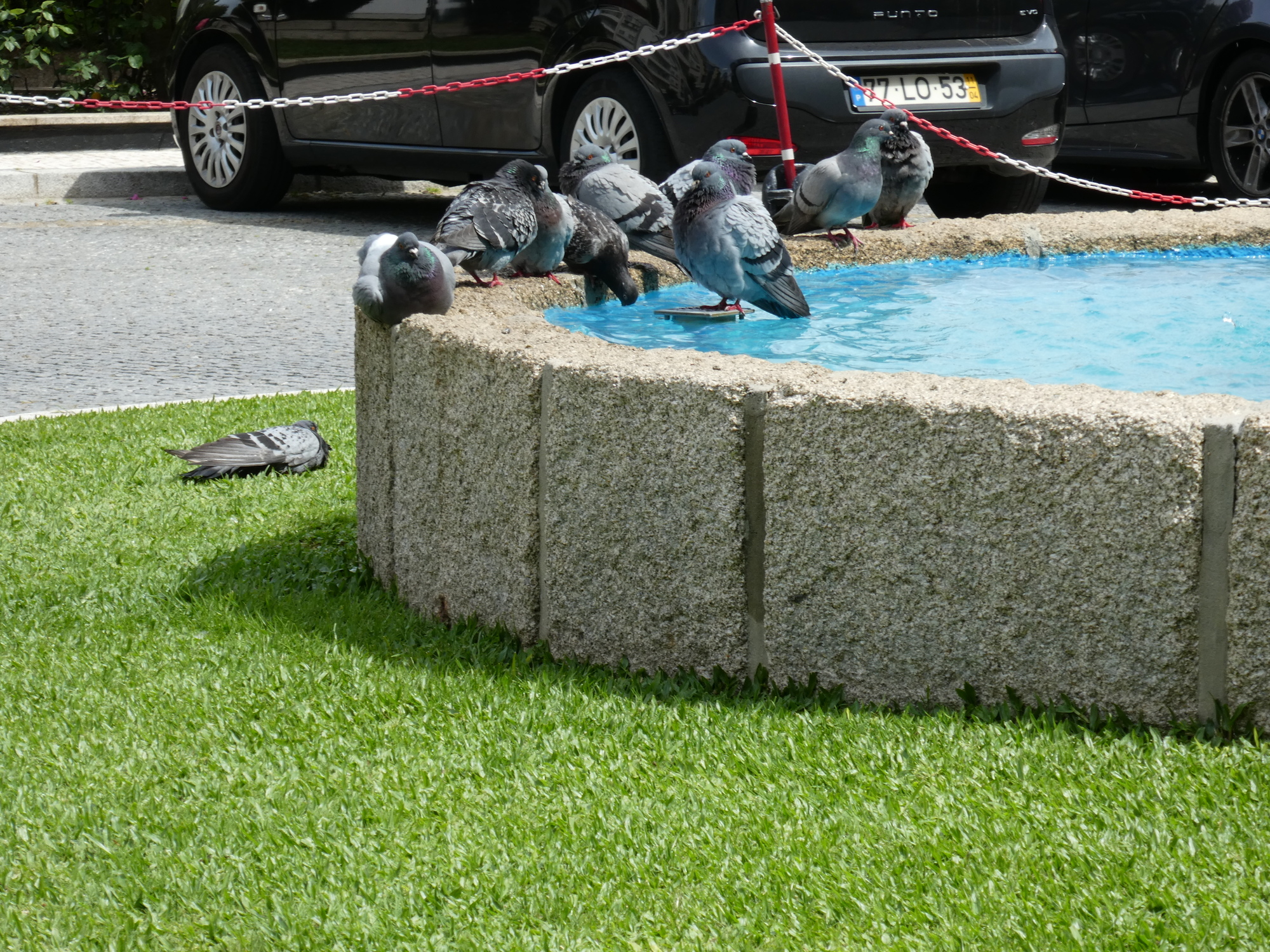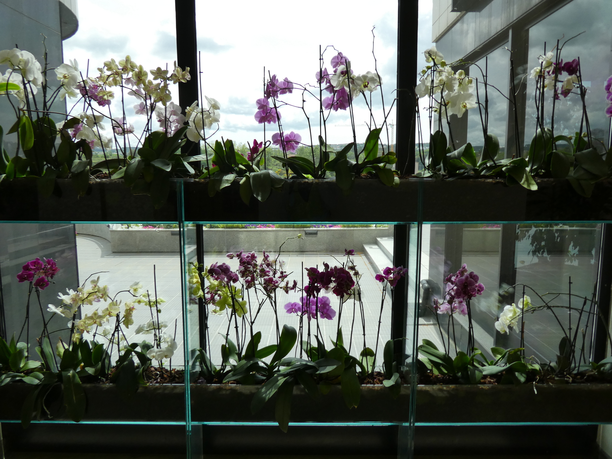 We trudged on back toward the hotel, and enjoyed the cooling sight of pigeons playing in the fountain and resting on the lawn. Inside the hotel we also had the nice touch of a resident Grey Parrot, messing up the formal decor, plus an impressive display of orchids. We took our chances with the elevator, and were rewarded by being delivered without fuss to our floor and suite, for a well deserved nap!