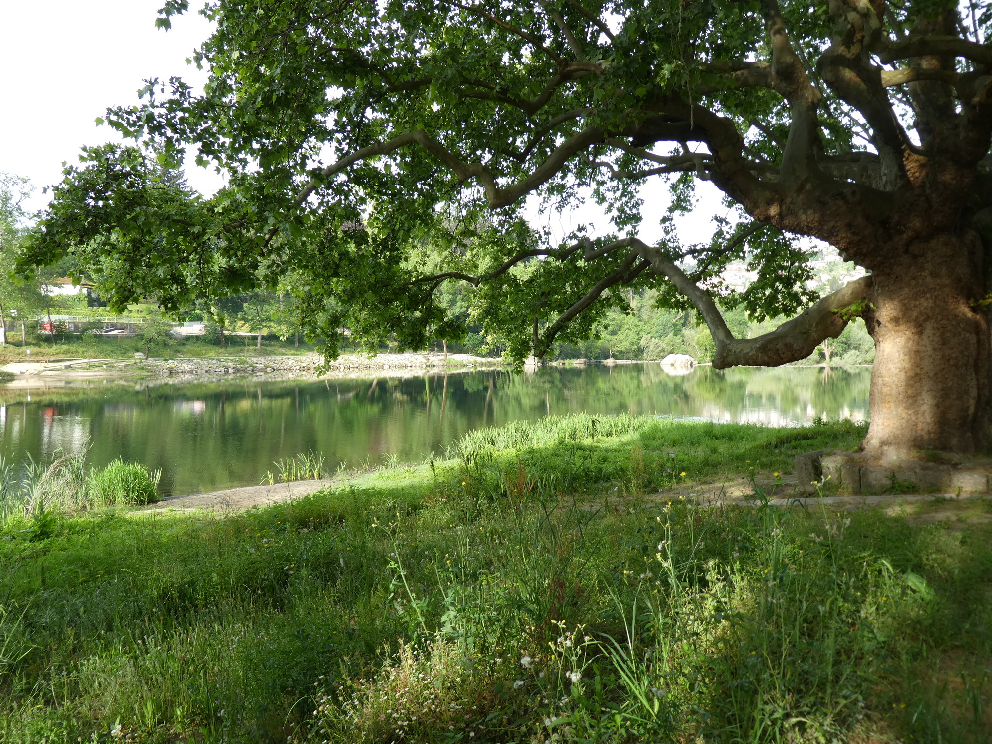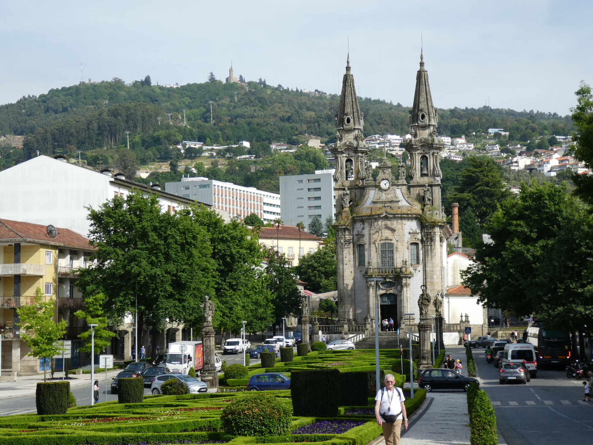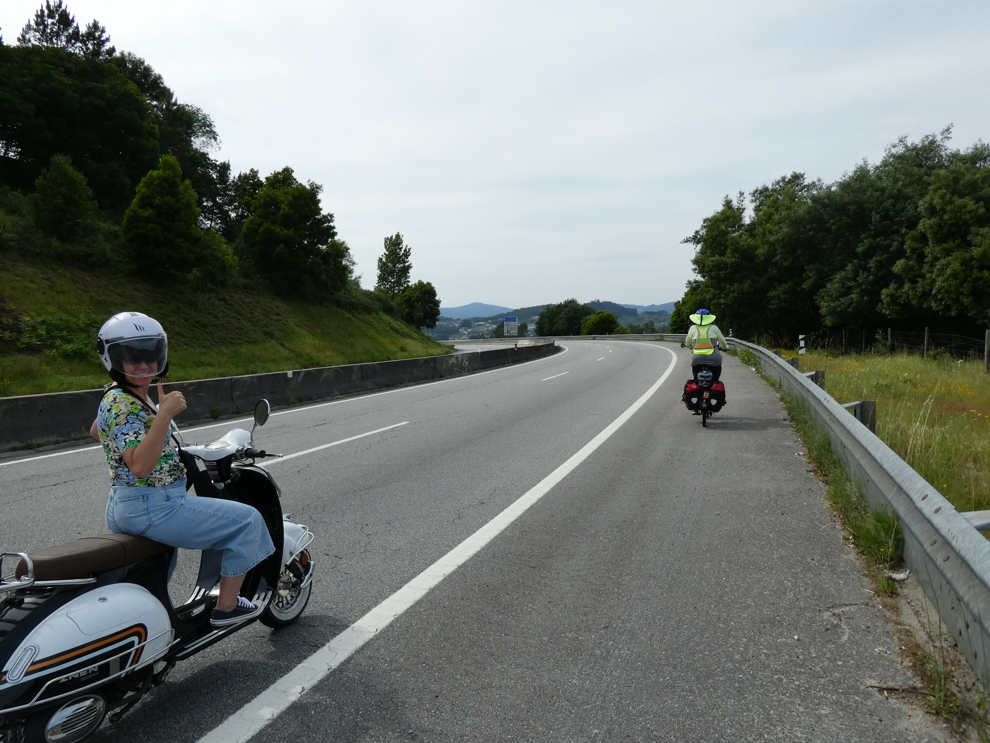 The route we had plotted out to Guimaraes involved mostly the N15-N101, but the track did seem to try leaving the highway whenever it could, only to return later. It knew something that we would find out: the highway was terrible. What we had was a witch's brew of factors: Slope too steep for Dodie to comfortably cycle, no shoulder, too much traffic, including goodly number of busses and heavy trucks, curves, temperature over 30 degrees, and nothing really worth looking at. With this combination, we basically walked (pushed) the first 12 1/2 km, and overall, we walked 20 km. That's where my Camino thoughts came in. On the Camino, walking 20 km is fairly respectable.