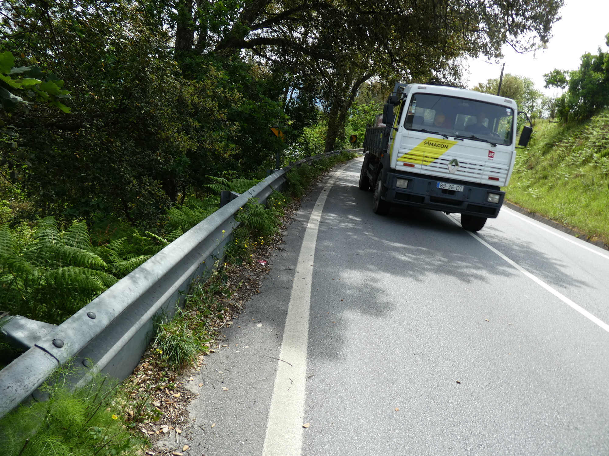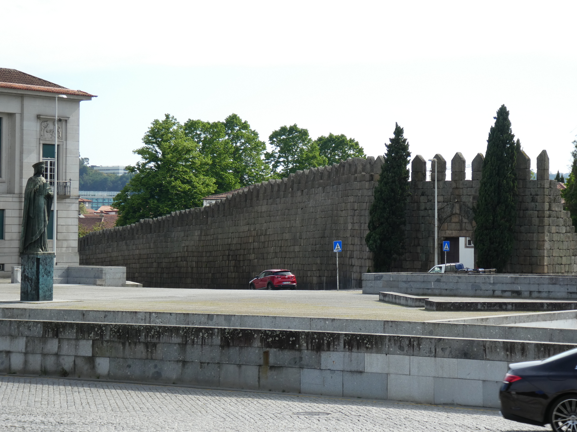 We made it to the Guimaraes off ramp, but that was not the end of the story. Now we were on a multi km city street that descended steeply (and curvily) to the historic centre. Following this one down involved leaning on the brakes, while feeling the pressure of the pursuing traffic. Guimaraes had helpfully painted bicycle symbols in the lane, but show those to the busses that repeatedly tried to edge us off the road!