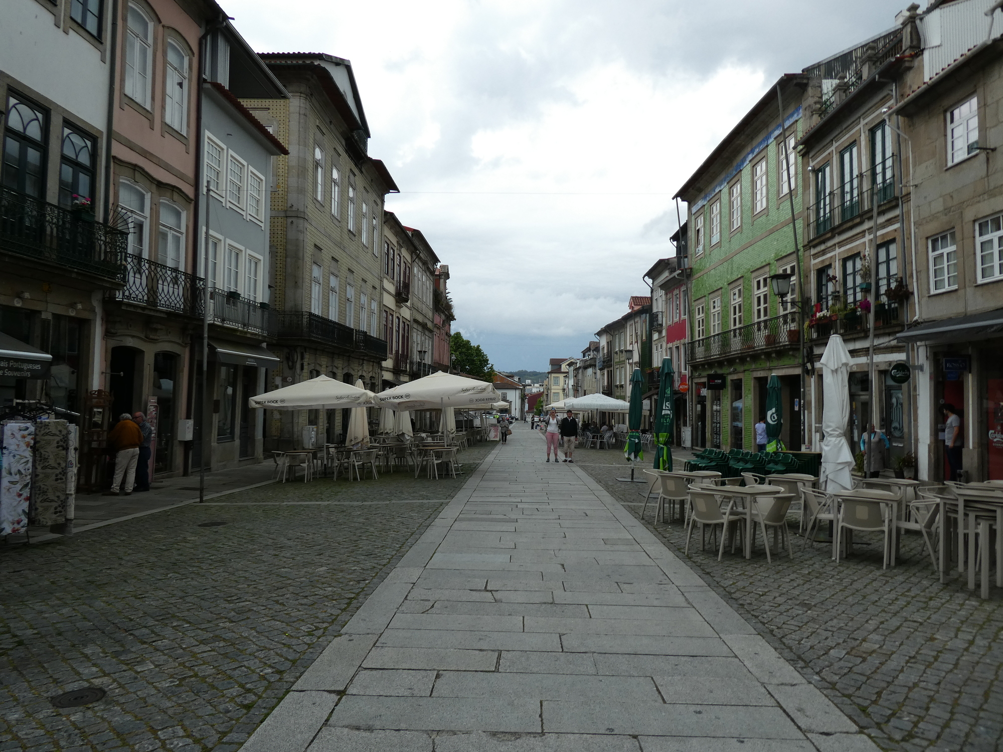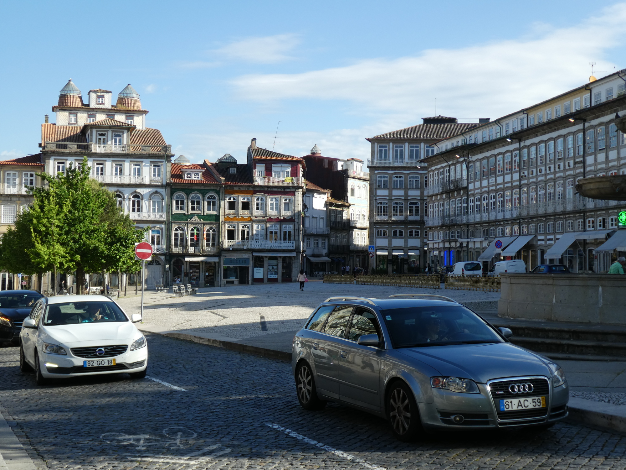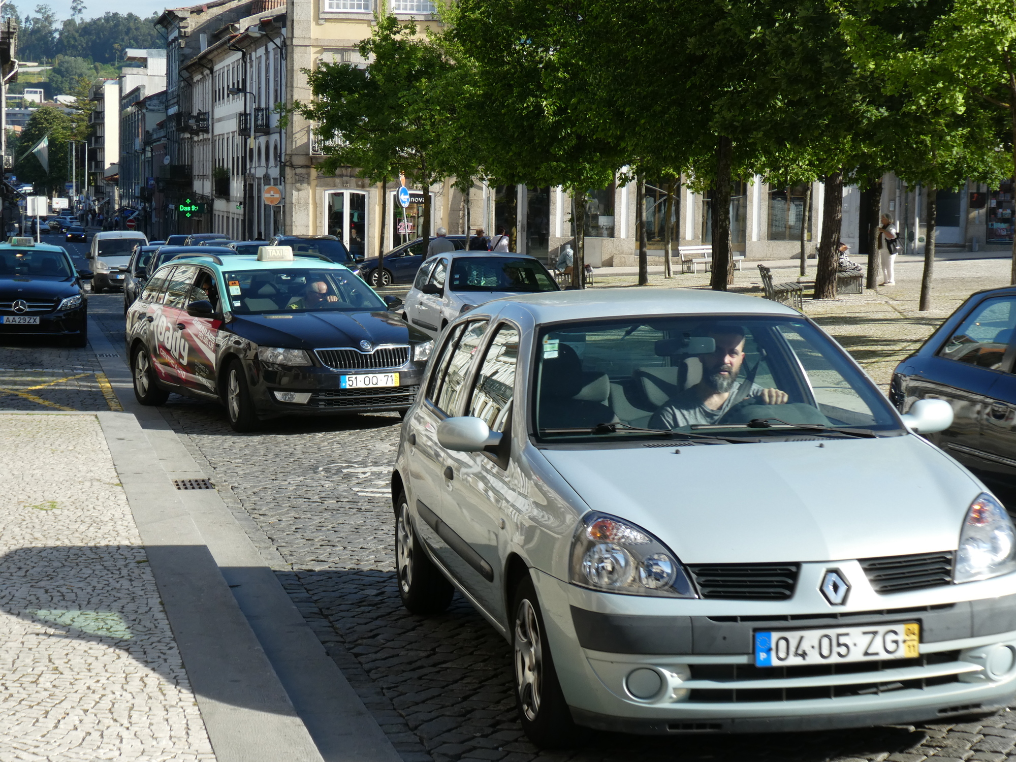 Guimaraes has a very nice historical centre, one we might have toured around a bit more, had we not felt so beat up getting in there. We woud like to think that we are not always grumpy, so that when something does bug us, it might be something of a real phenomenon, that others would also recognize. It was like that this morning too, as both of us noticed the constant flow of cars trundling along the cobbled streets of the old town. Cars moving like that are noisy, and they also shut down cycling on the street, or crossing, except at crosswalks.