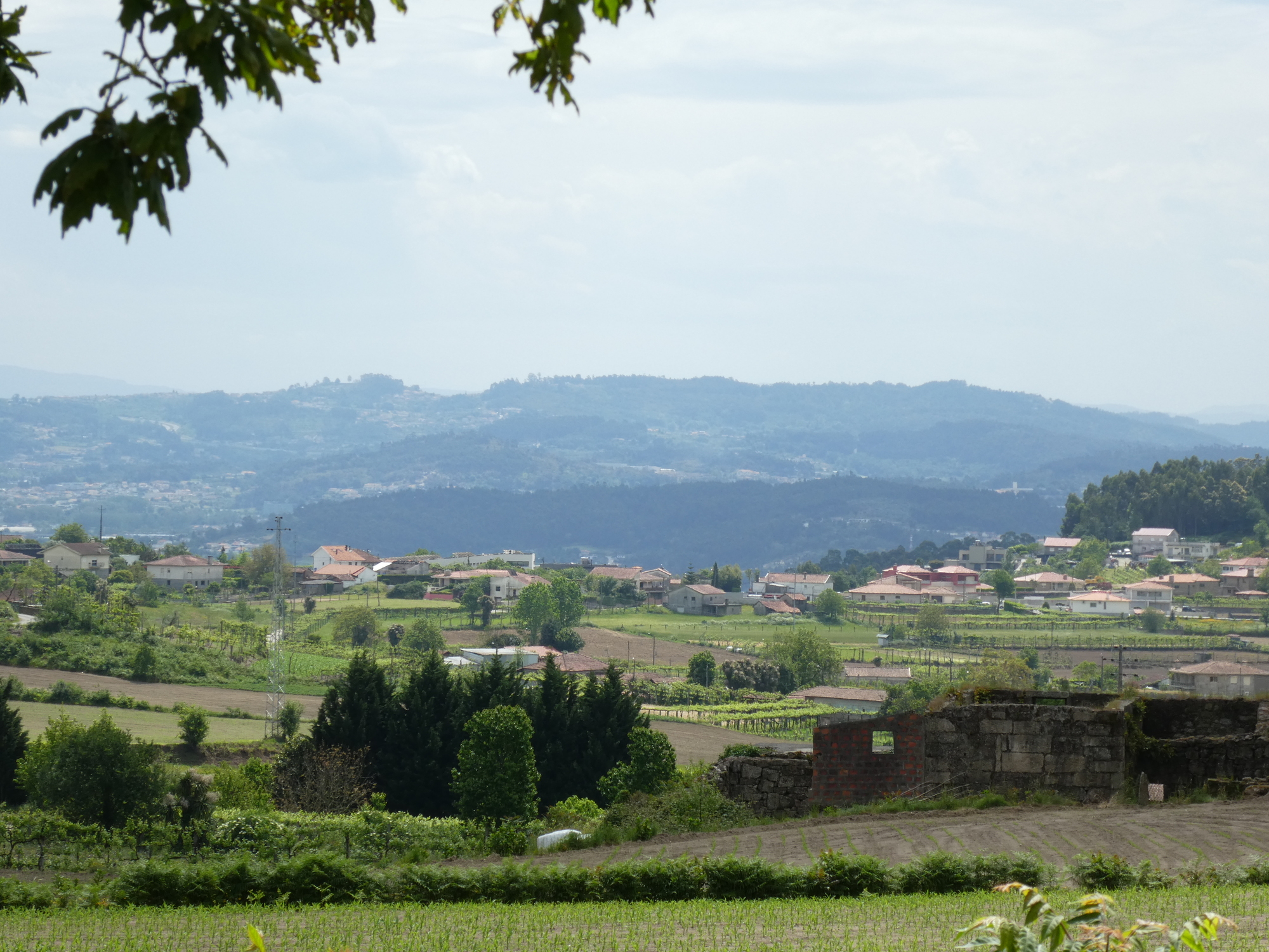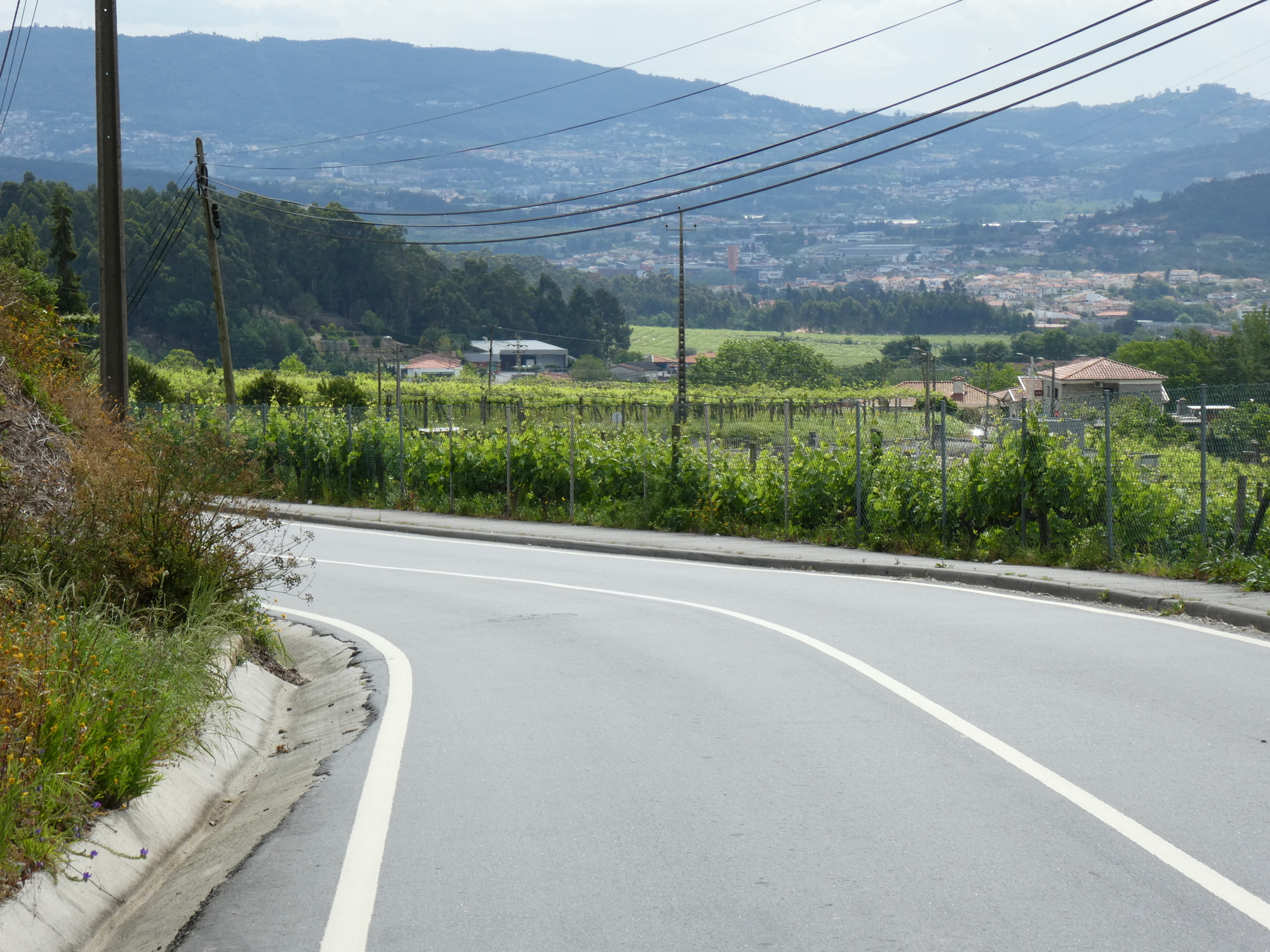 Our route, as one would hope, became more rural as we cycled away from Guimaraes. Now instead of car dealerships we could look at pleasant valleys. The road, as you see in the photo below, remains tricky. A driver ripping around that corner would encounter me, stopped and looking at the valley.