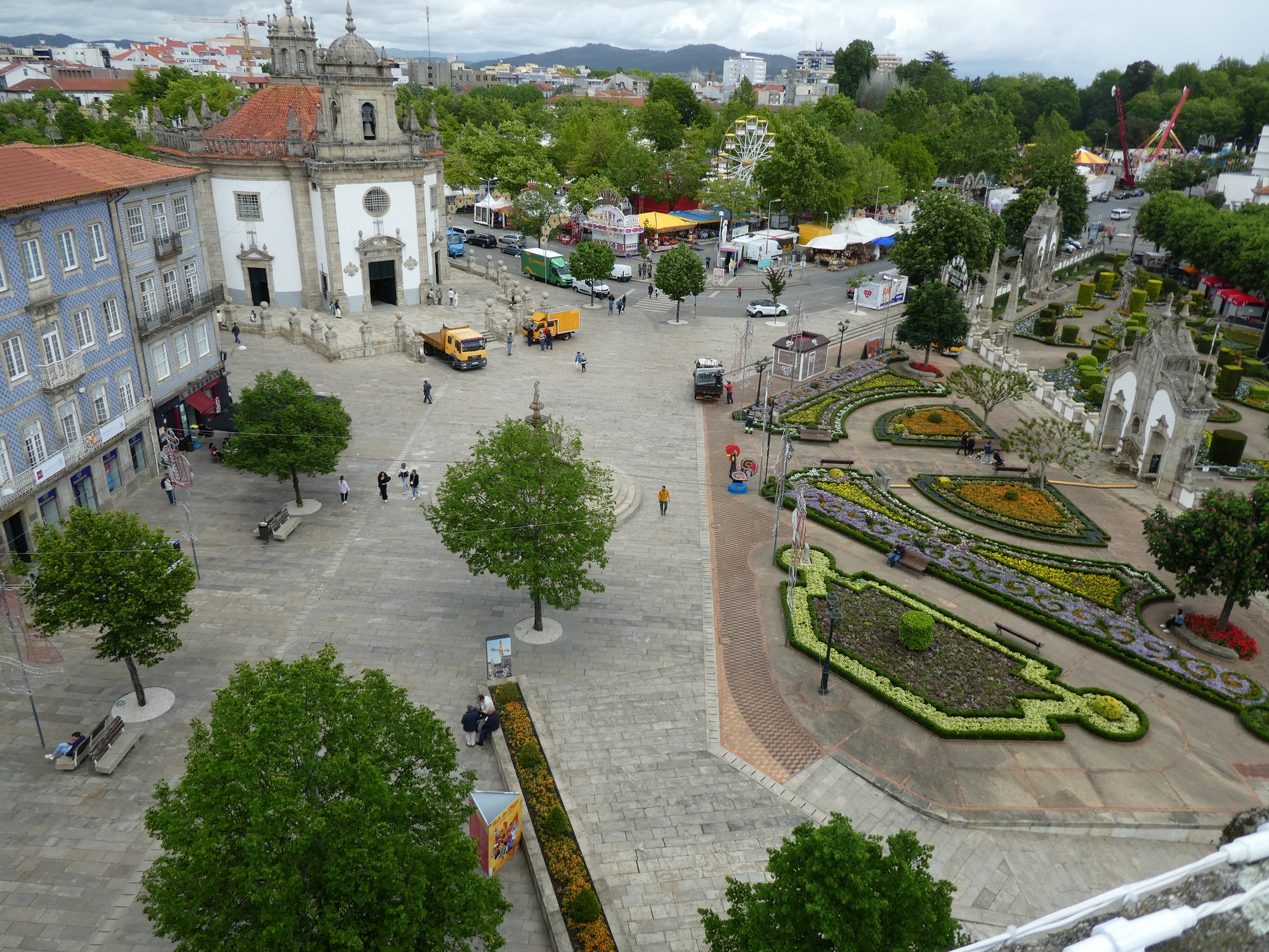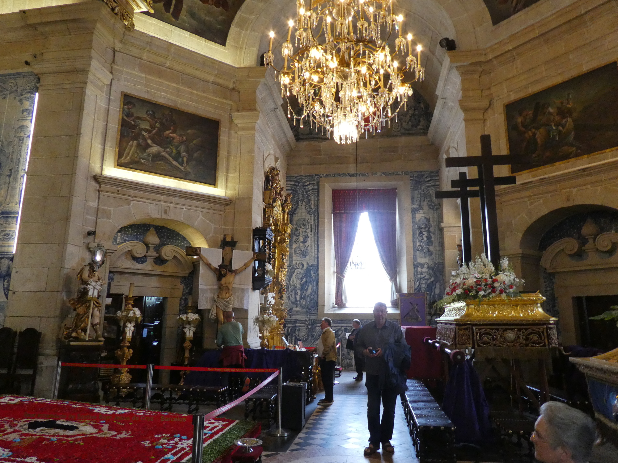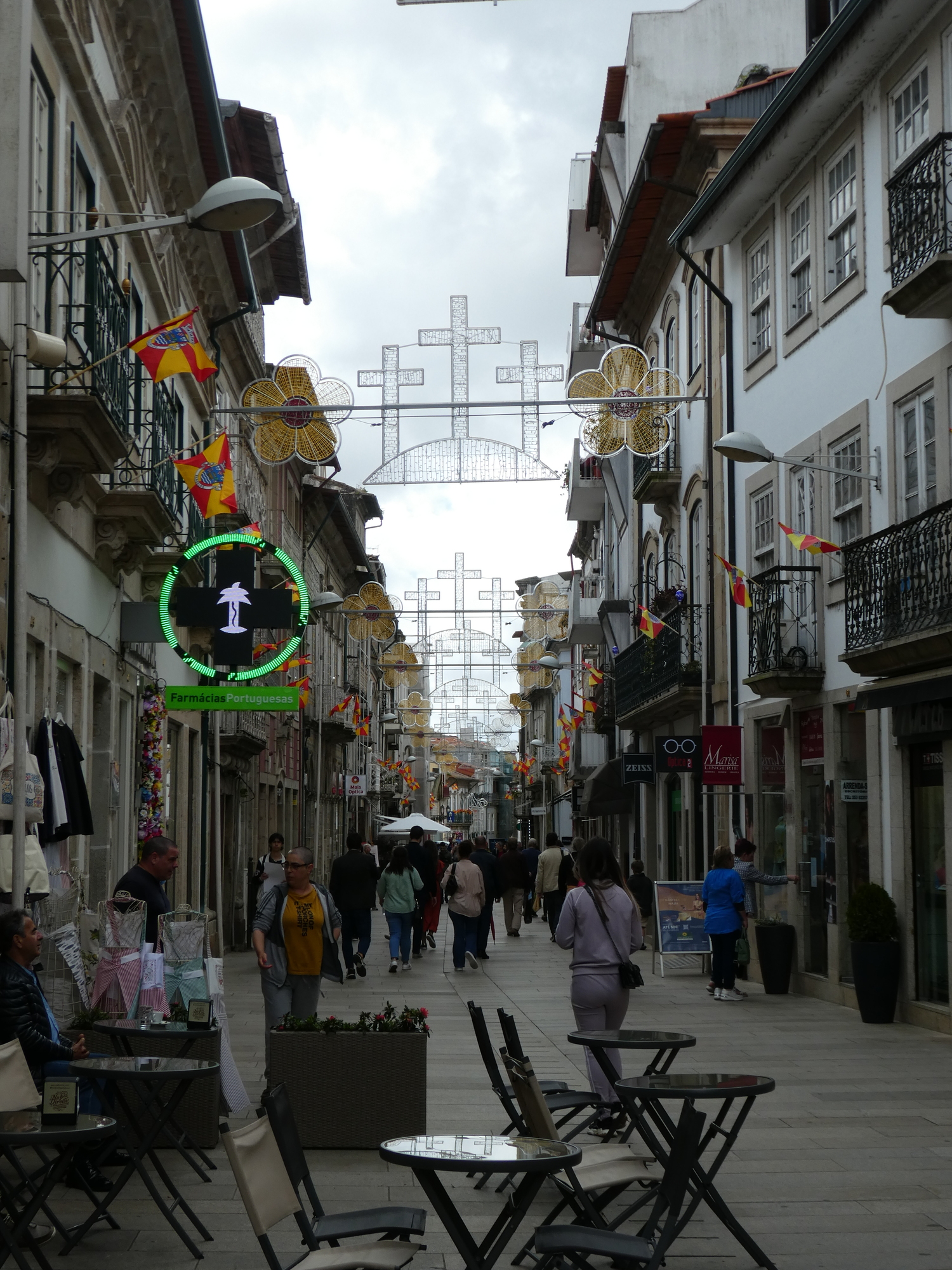 It was now our time to start learning more about what was actually going on in this town. We began at the Bom Jesus da Cruz de Barcelos basilica. Yes, that is the same Bom Jesus (Good Jesus) of the sanctuary in Braga, that we missed visiting. It really is something special, and we recommend checking out Scott Anderson's excellent account of it. The legend is that in 1504 a black earthen cross appeared to a shoemaker next to the fairground in Barcelos. This quickly triggered a procession, the building of a large wooden cross, and soon a chapel. The thing snowballed from there, so now we have the basilica here, with lots of black crosses. But we also have a multi day festival, that included (yesterday) a Semana Santa type procession, and yes, a fun fair. The market, though, might anyway be a regular Thursday thing.