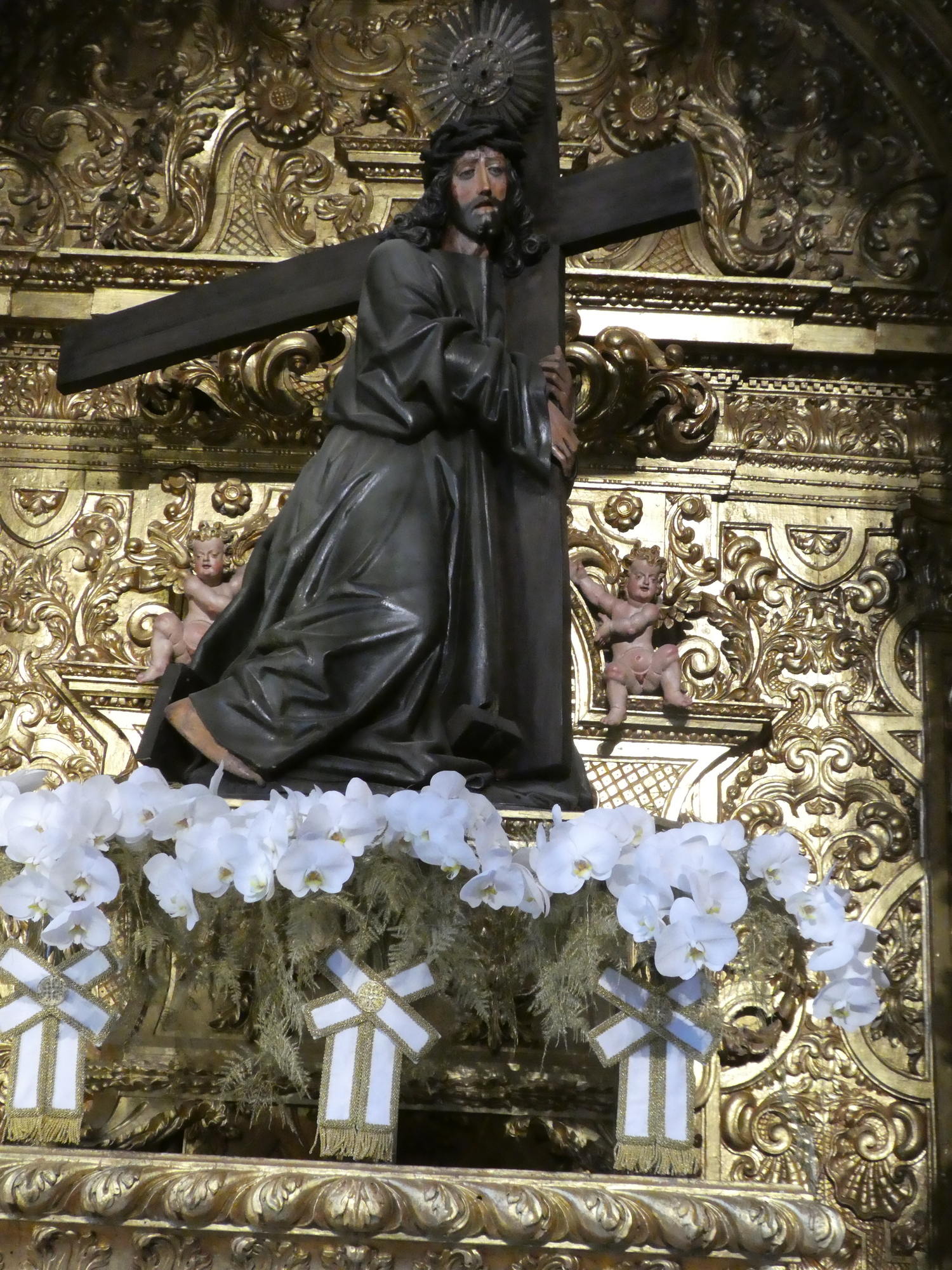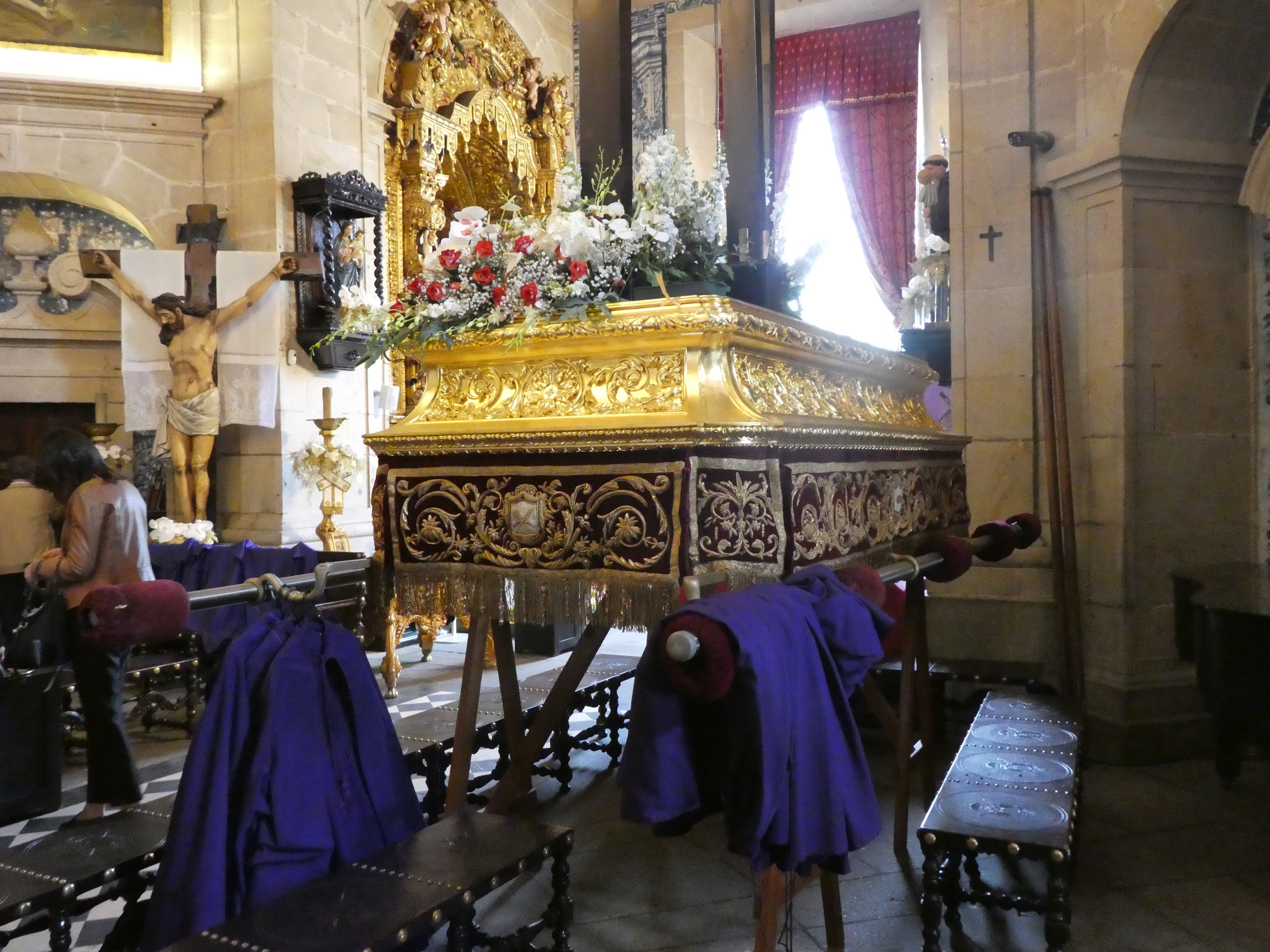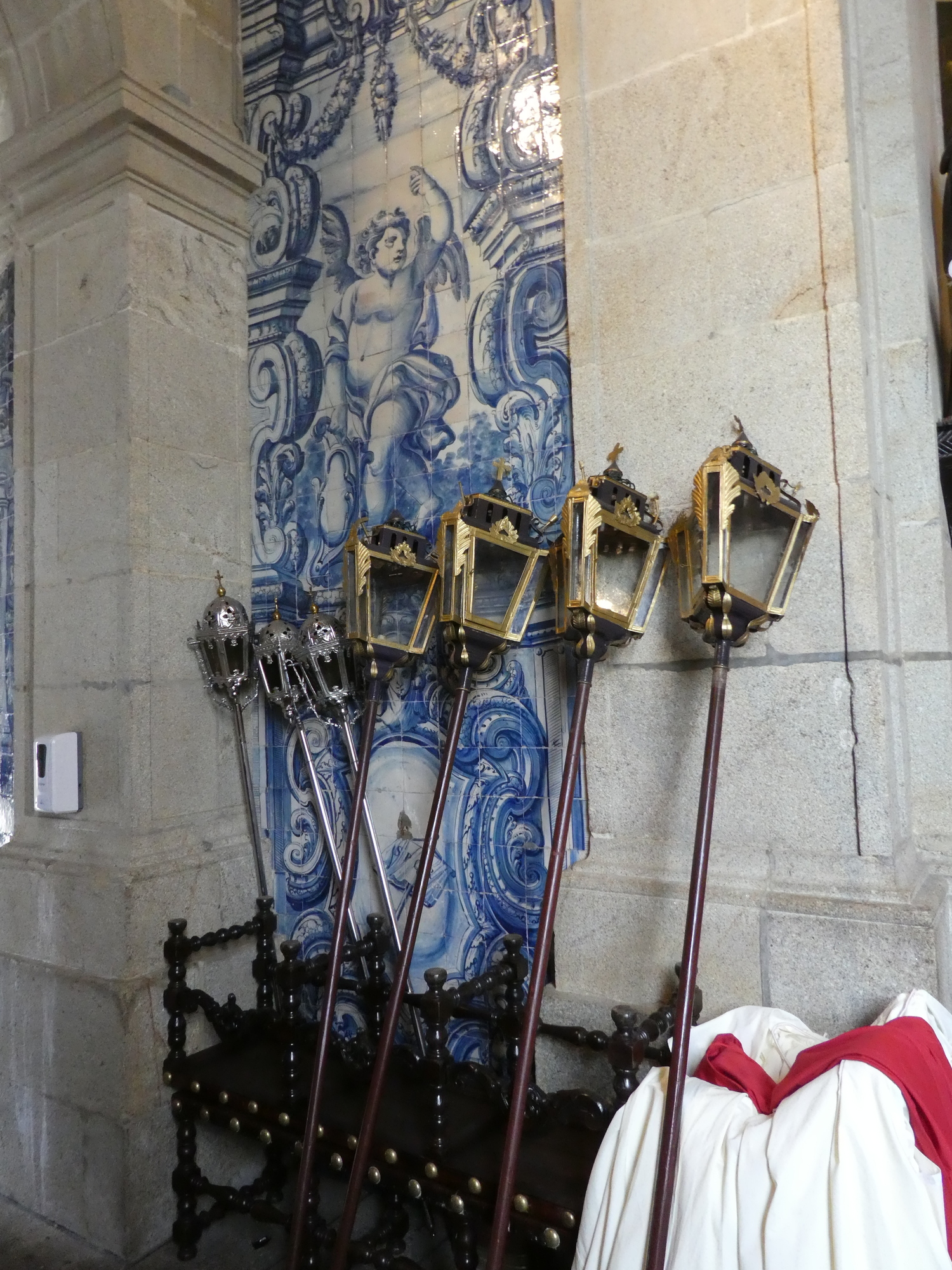 It was now our time to start learning more about what was actually going on in this town. We began at the Bom Jesus da Cruz de Barcelos basilica. Yes, that is the same Bom Jesus (Good Jesus) of the sanctuary in Braga, that we missed visiting. It really is something special, and we recommend checking out Scott Anderson's excellent account of it. The legend is that in 1504 a black earthen cross appeared to a shoemaker next to the fairground in Barcelos. This quickly triggered a procession, the building of a large wooden cross, and soon a chapel. The thing snowballed from there, so now we have the basilica here, with lots of black crosses. But we also have a multi day festival, that included (yesterday) a Semana Santa type procession, and yes, a fun fair. The market, though, might anyway be a regular Thursday thing.