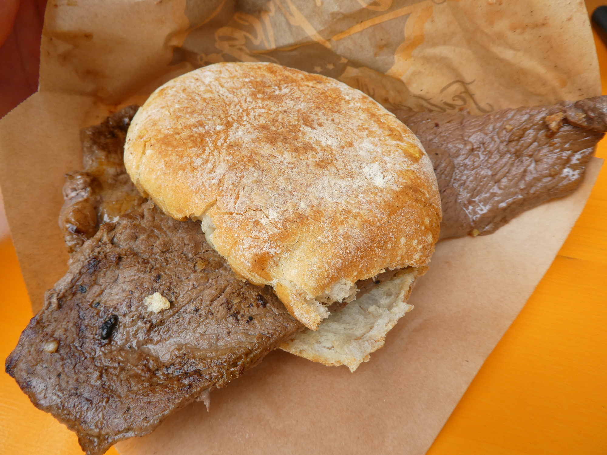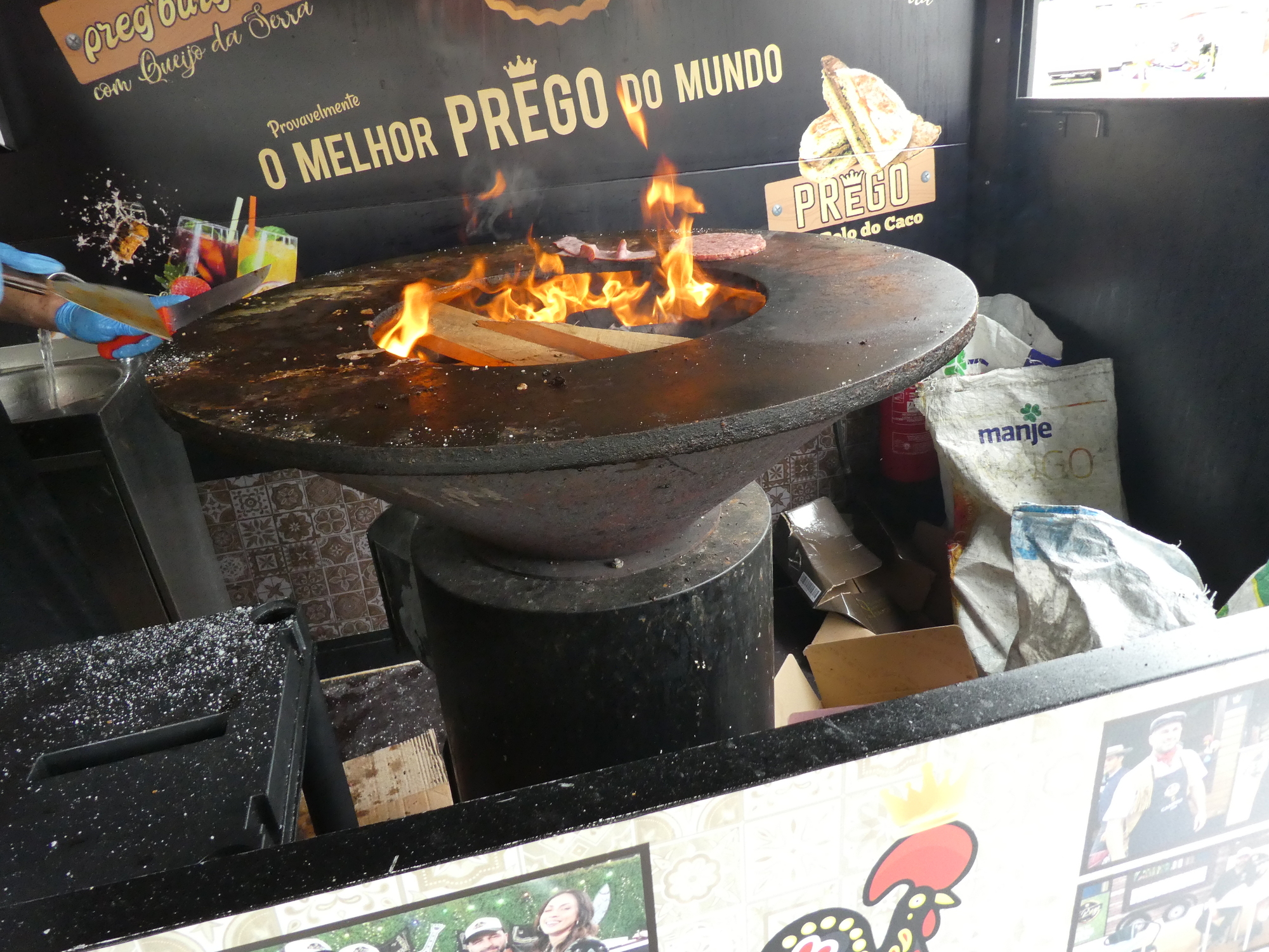 There was one stand that was flame broiling "something", called prego. I looked up prego in my translate program, and it said "nails". What? But Google also said "prego" was famous in Lisbon. ?? Anyway, we lined up, for there was a line for this, but not for any of the kebab stands.