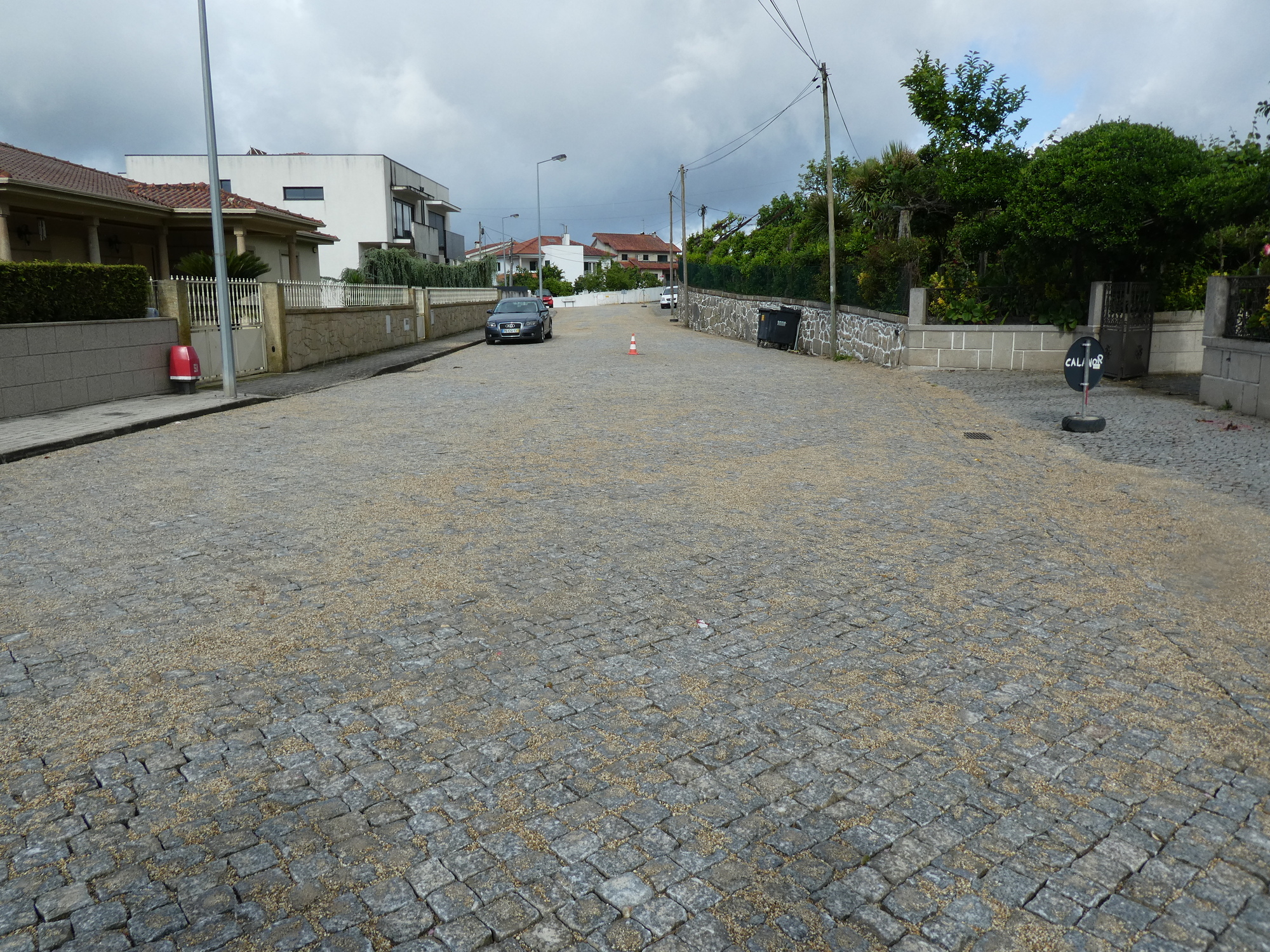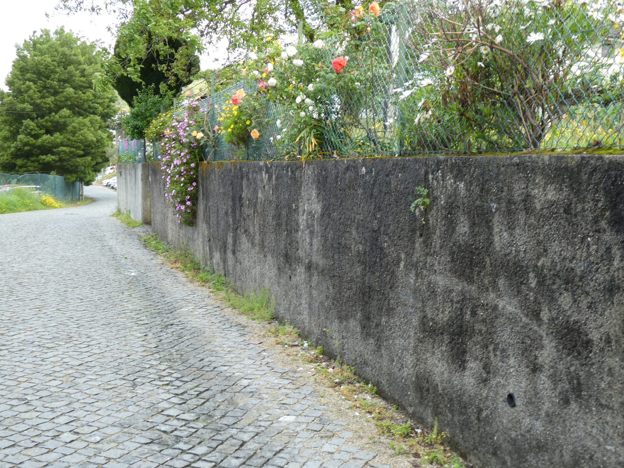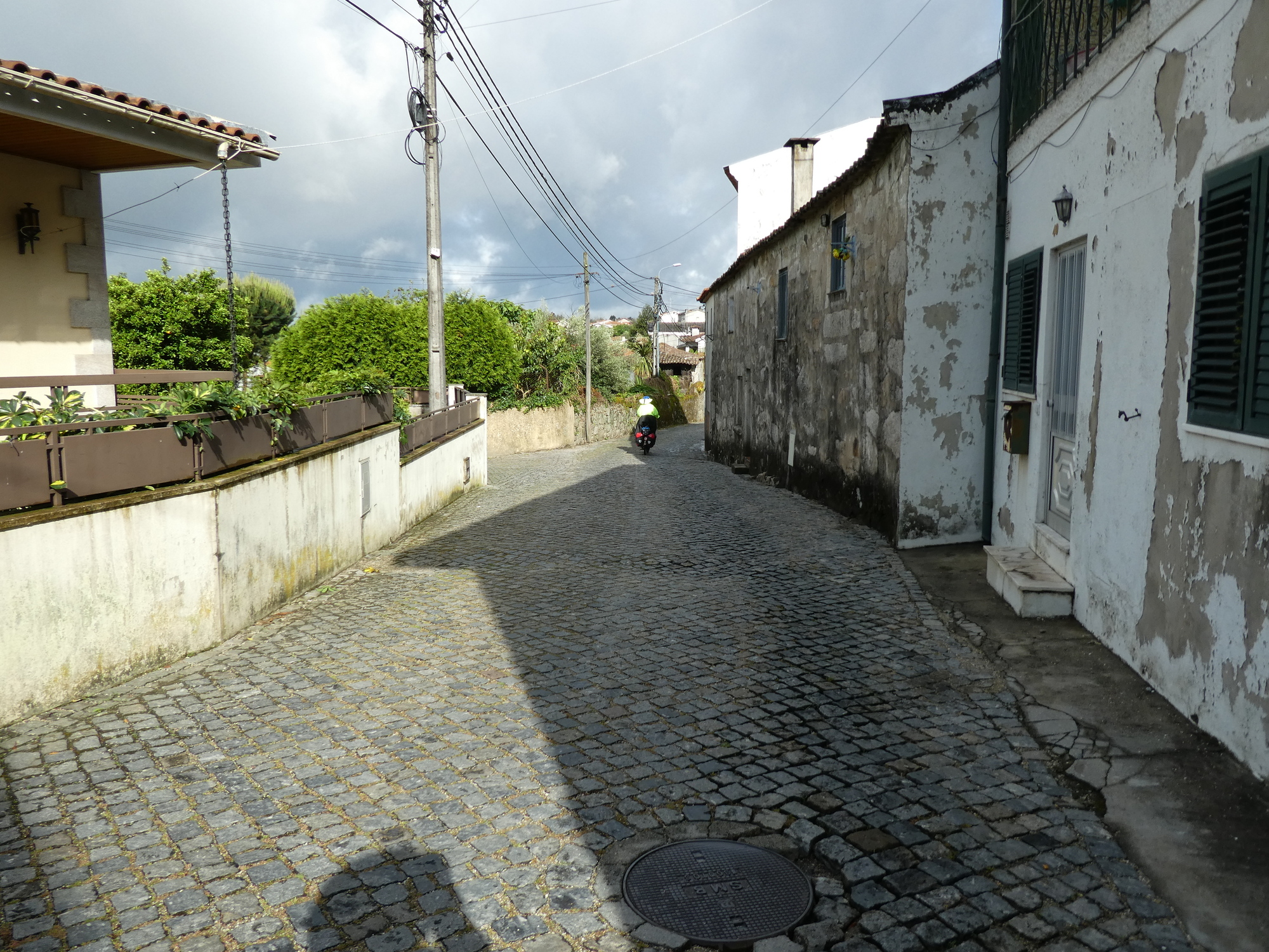 We have read of the frustration of cyclists with the extensive use of cobbles for the roads in northern Portugal towns, and even between towns. We feel that too, particularly with the small wheels and no shock absorbers. But narrow roads with no shoulders and moderate traffic are even more of a consideration. So it was that we looked at three possible routes from Braga to Barcelos, and chose one that we hoped would have less traffic, but where Street View (commonly known to us as Little Yellow Man) revealed a lot of cobbles. Our thinking was affected by the weather forecast too, because if the rain that had been falling in the night continued, the cobbles might be very slippery. In any event, we had to start with the road (N103) and could decide on cobbles when the turnoff came.