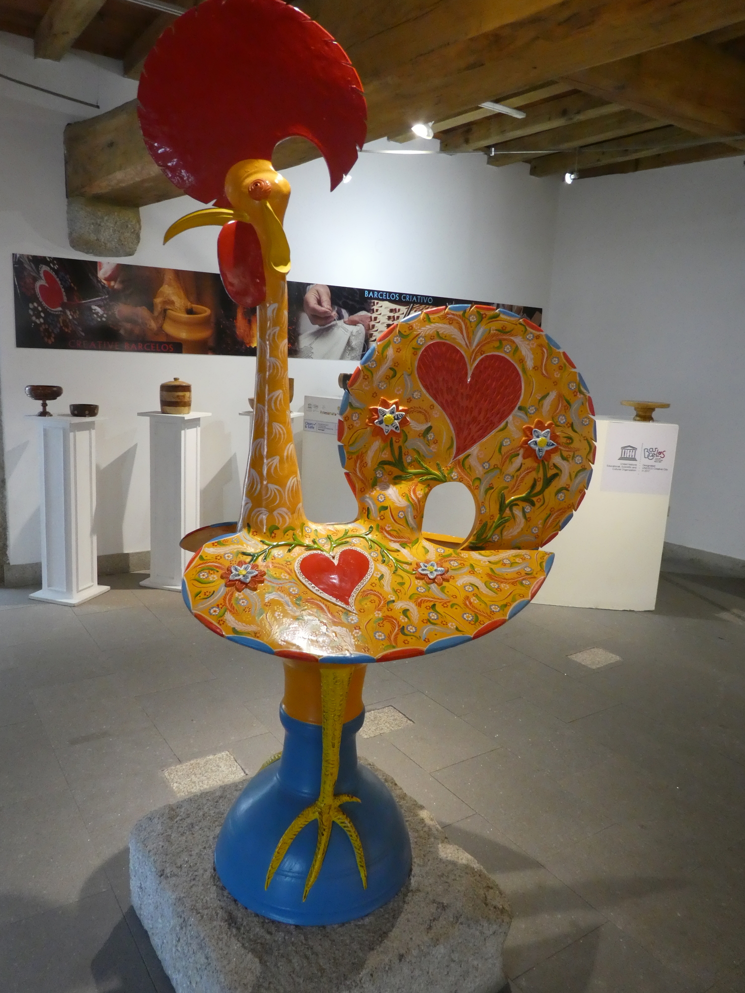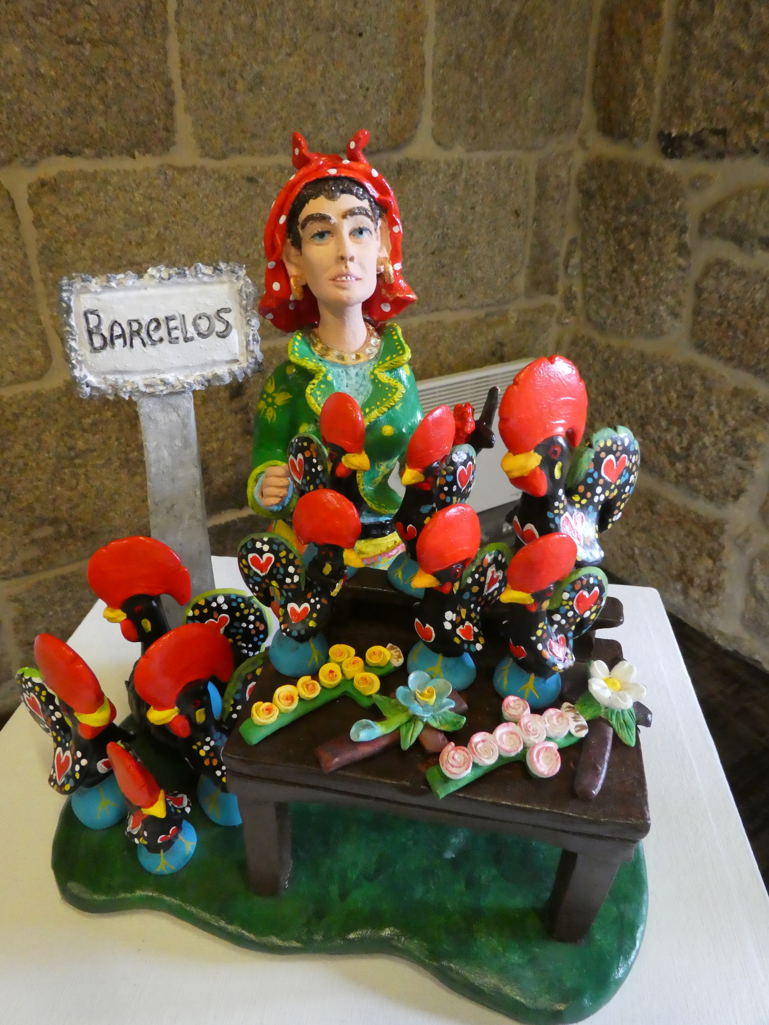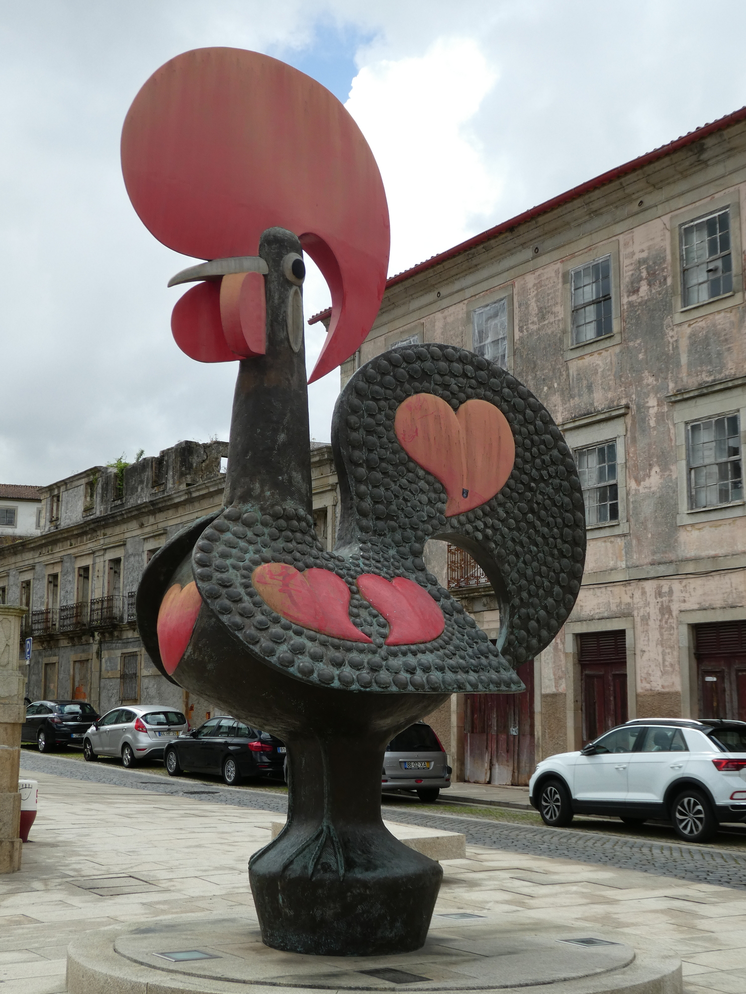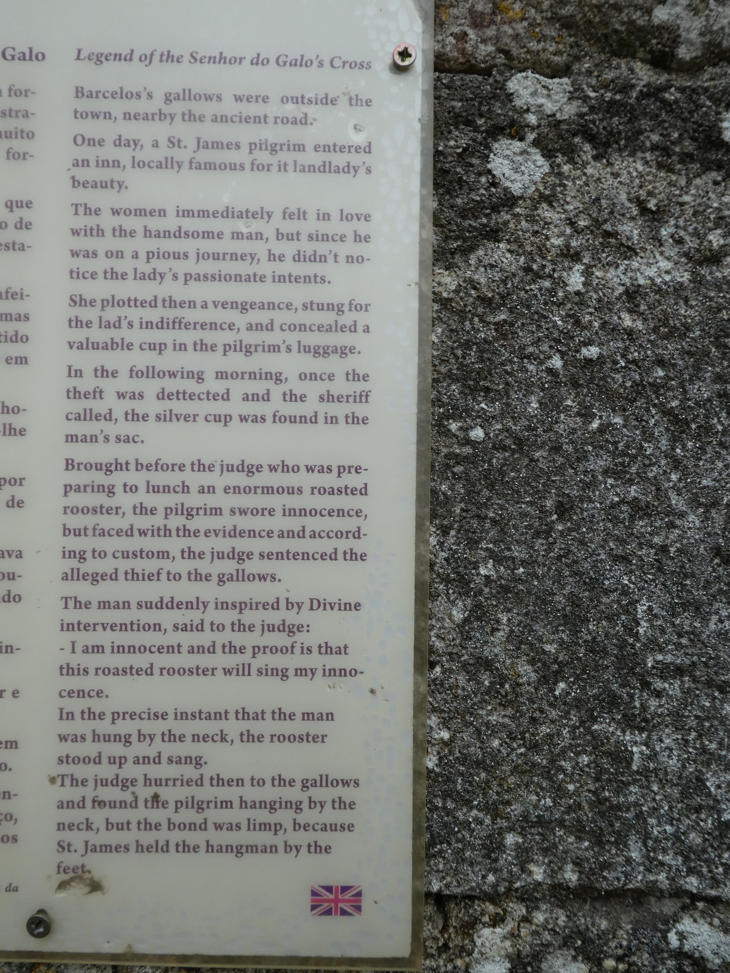 There is a castle (or palace) above the river bridge, dating from 1400. It is mostly a ruin now. But it does have the story of the Barcelos rooster posted on its wall. There are very many versions of this story floating about, many reproduced on post cards. The basic idea is that a pilgrim from Galicia (where Santiago is) is falsely accused and convicted of a crime. He goes to the judge, who is eating a rooster, and tells him that if he is unjustly hanged the rooster will jump up and crow. The pilgrim is hanged, the rooster crows, and the judge rushes to the gallows, to find the pilgrim did not die. In the story on the wall here, the pilgrim is saved by Santiago, who is supporting him under the feet. In other versions, the noose was too loose. However, and this is news (even to the people at Tourist Information!), the rooster in this story is not the colourful rooster on sale in all the souvenir shops. Who is that rooster? Stay tuned for the surprising answer.
