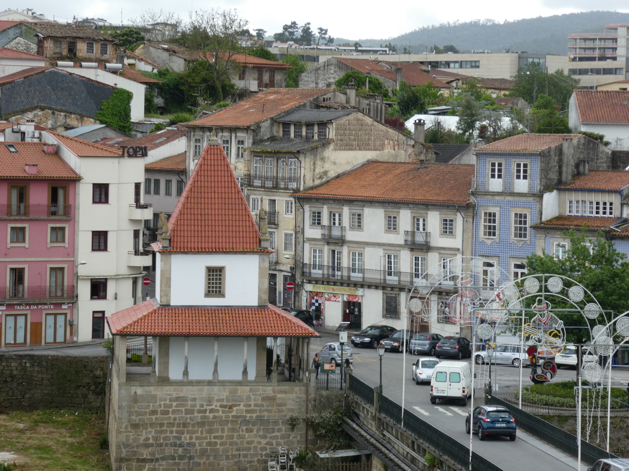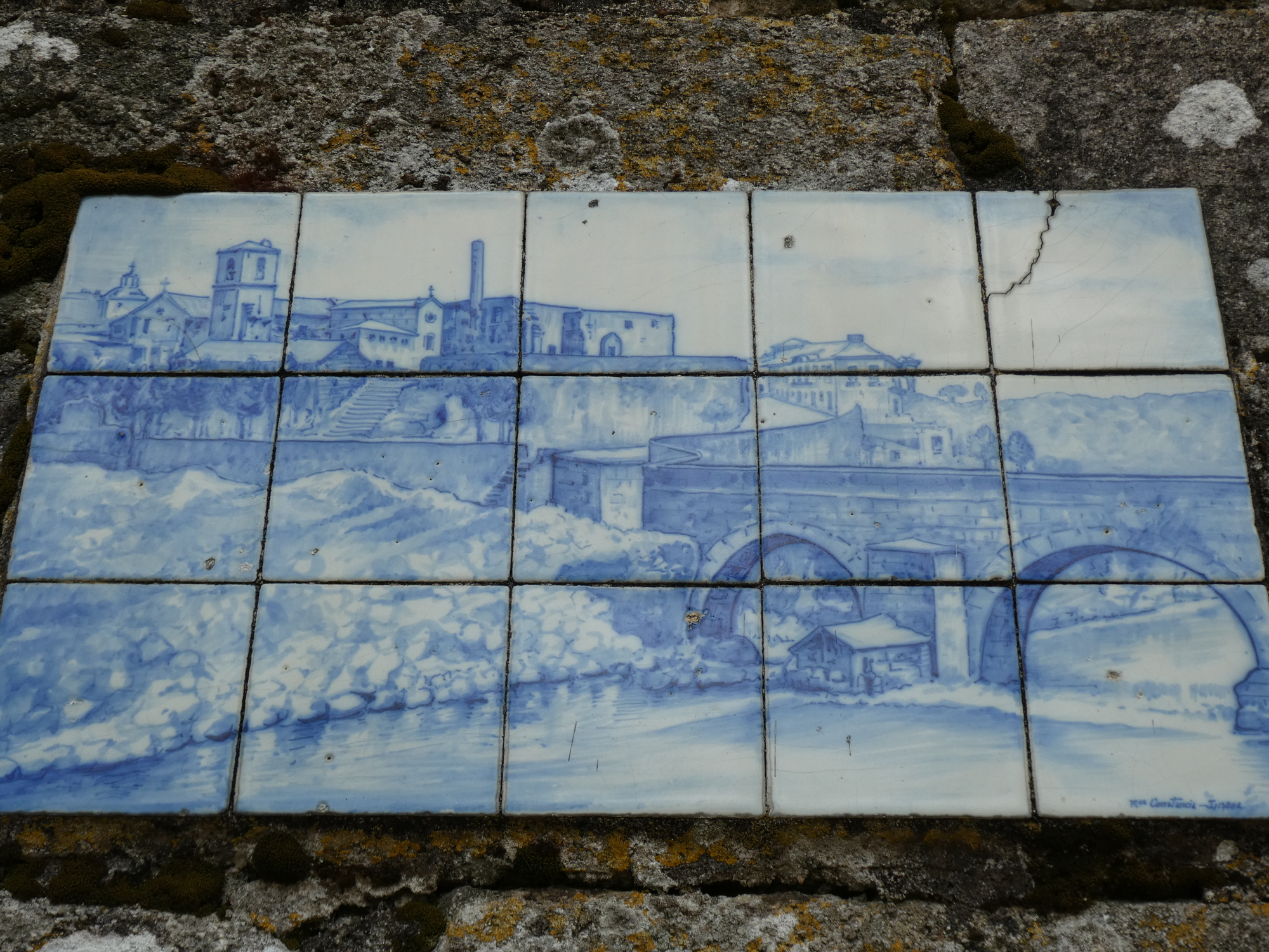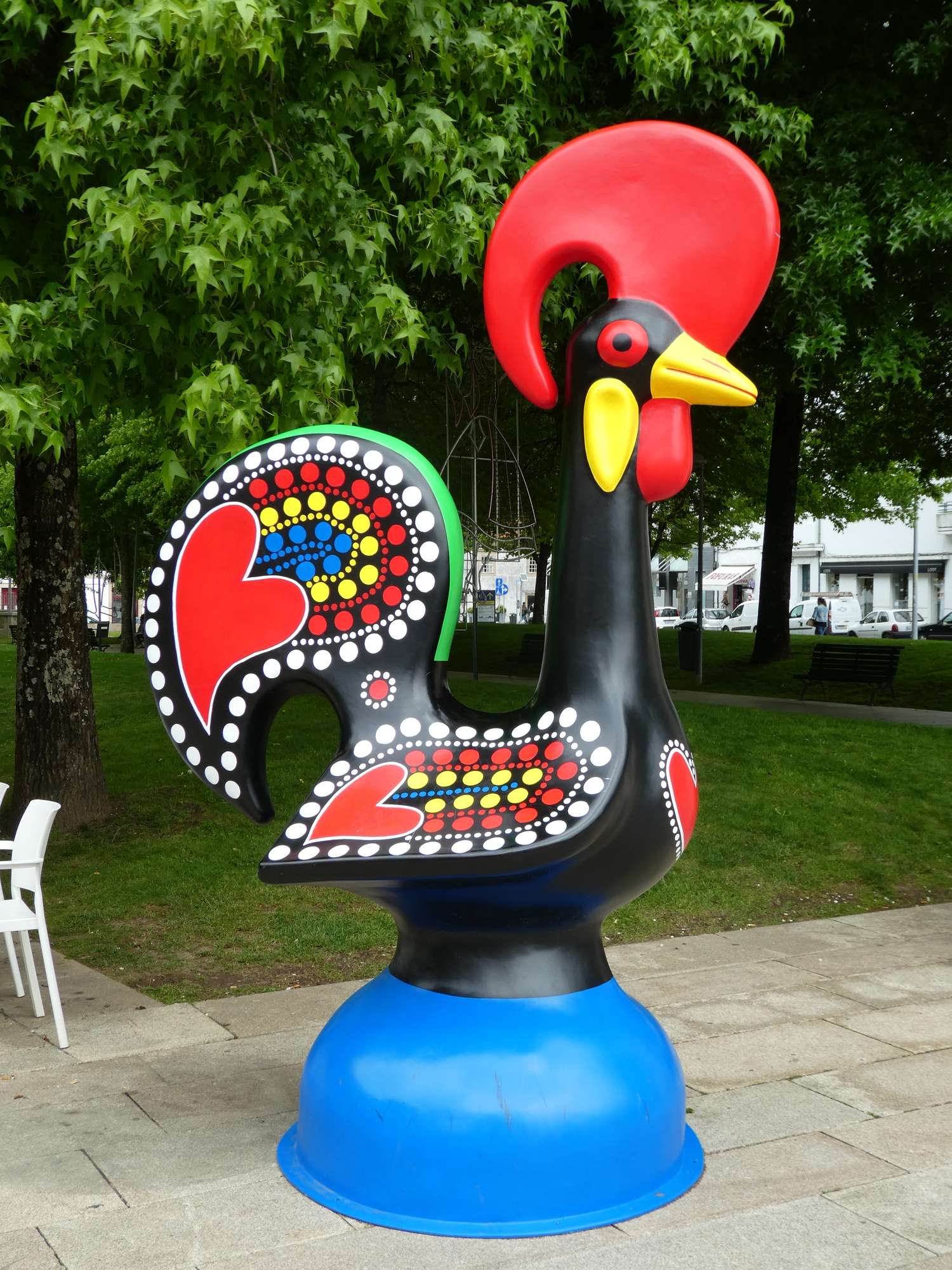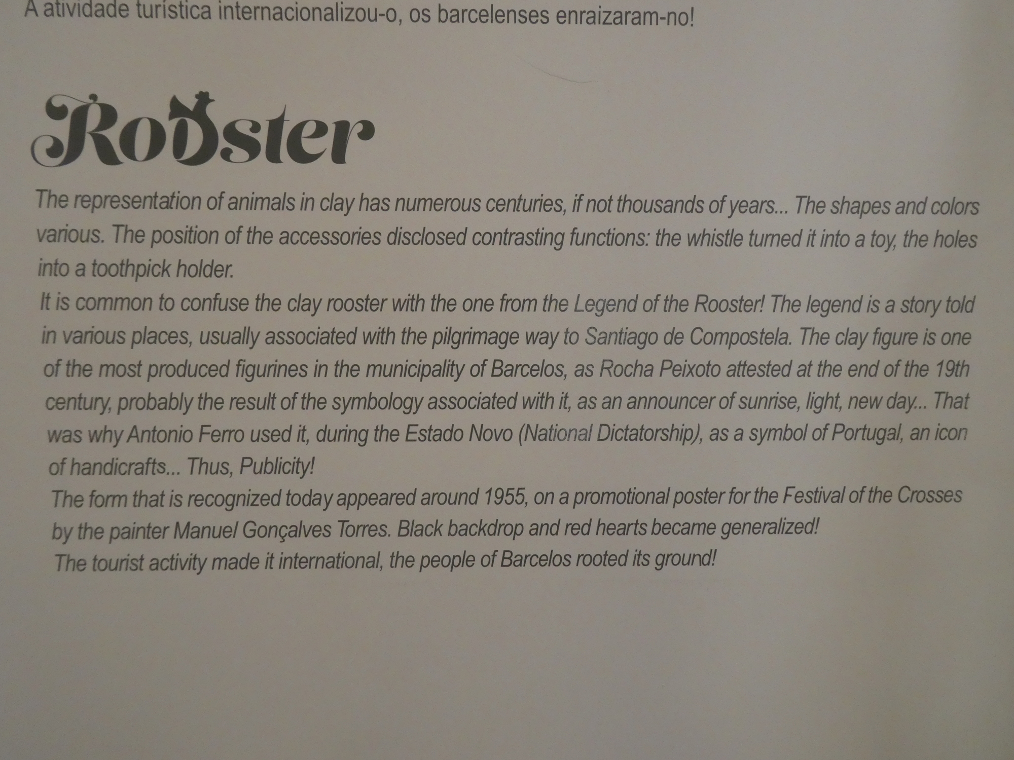 There is a castle (or palace) above the river bridge, dating from 1400. It is mostly a ruin now. But it does have the story of the Barcelos rooster posted on its wall. There are very many versions of this story floating about, many reproduced on post cards. The basic idea is that a pilgrim from Galicia (where Santiago is) is falsely accused and convicted of a crime. He goes to the judge, who is eating a rooster, and tells him that if he is unjustly hanged the rooster will jump up and crow. The pilgrim is hanged, the rooster crows, and the judge rushes to the gallows, to find the pilgrim did not die. In the story on the wall here, the pilgrim is saved by Santiago, who is supporting him under the feet. In other versions, the noose was too loose. However, and this is news (even to the people at Tourist Information!), the rooster in this story is not the colourful rooster on sale in all the souvenir shops. Who is that rooster? Stay tuned for the surprising answer.