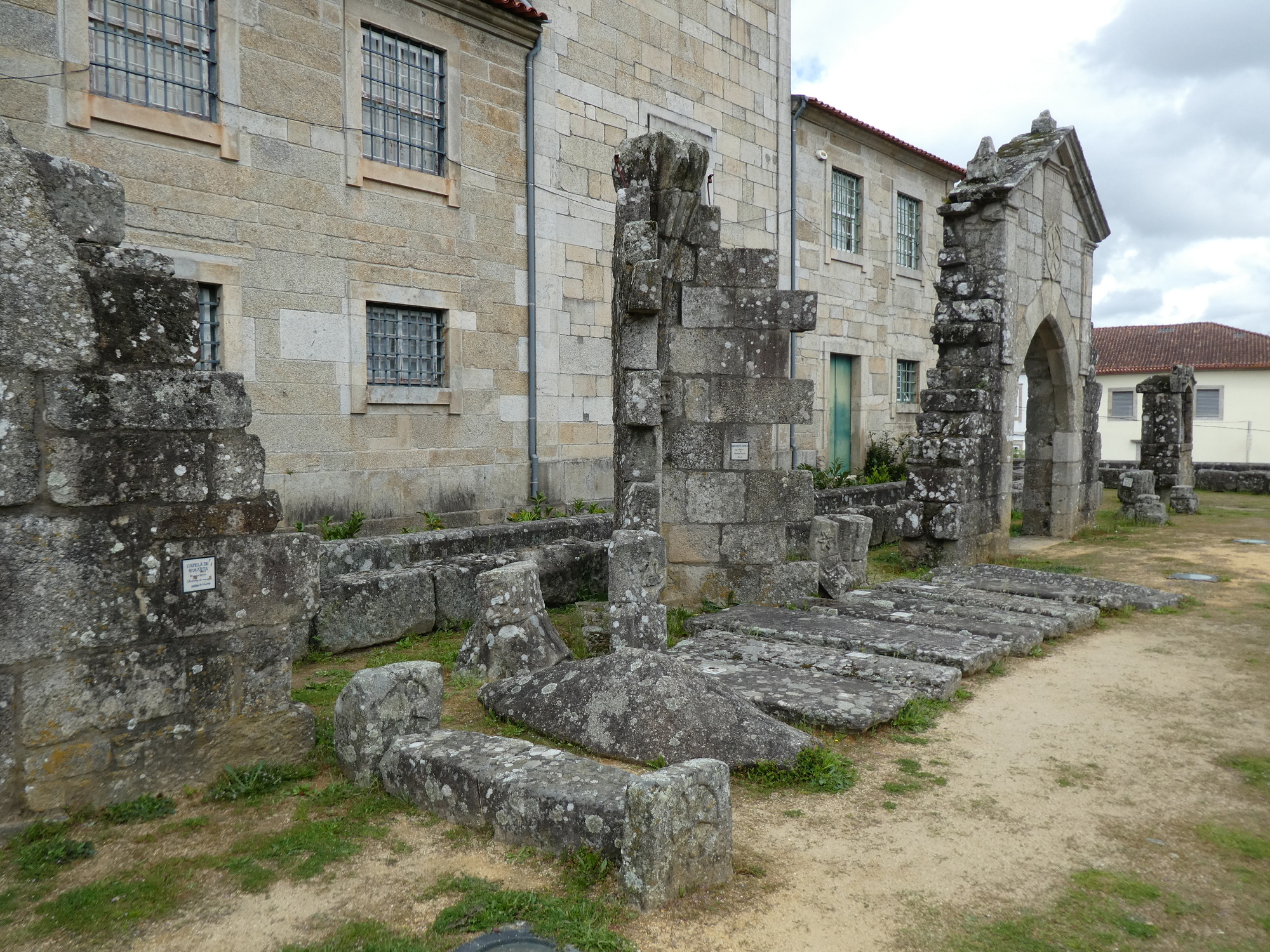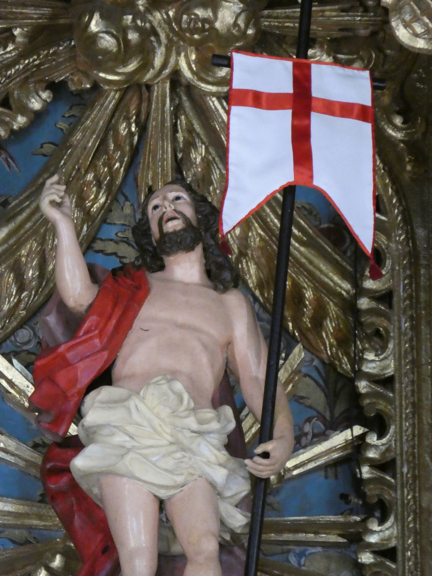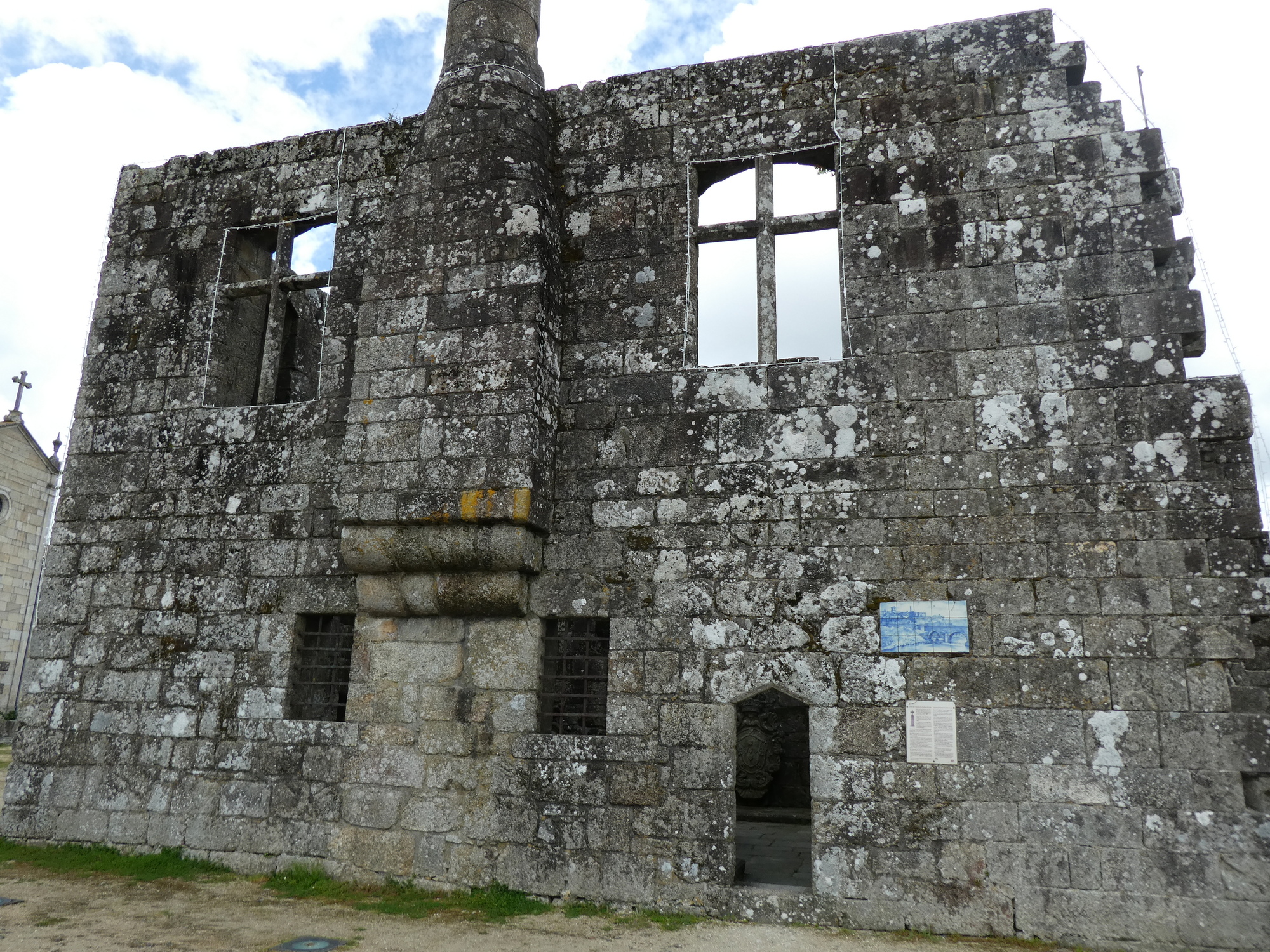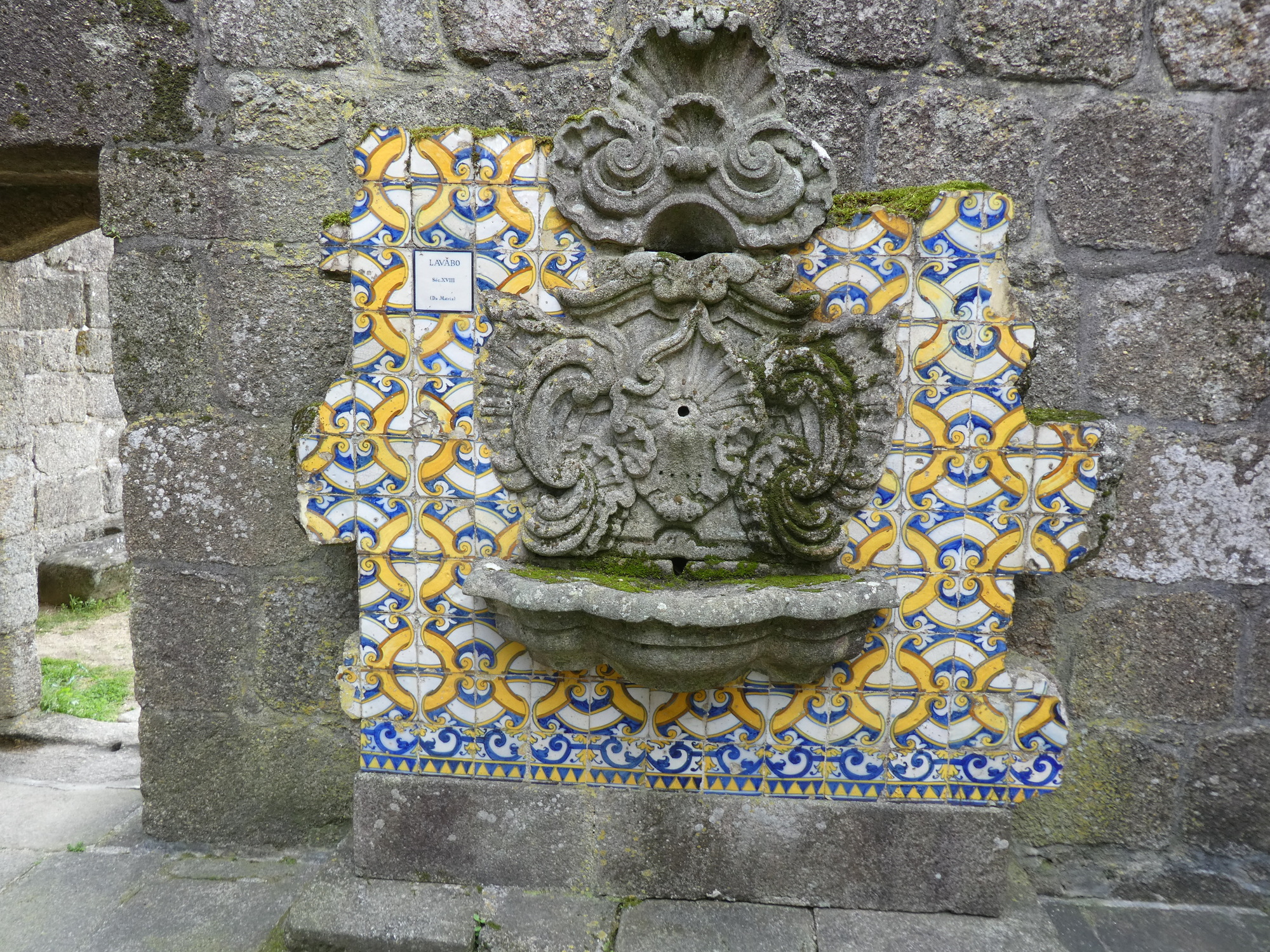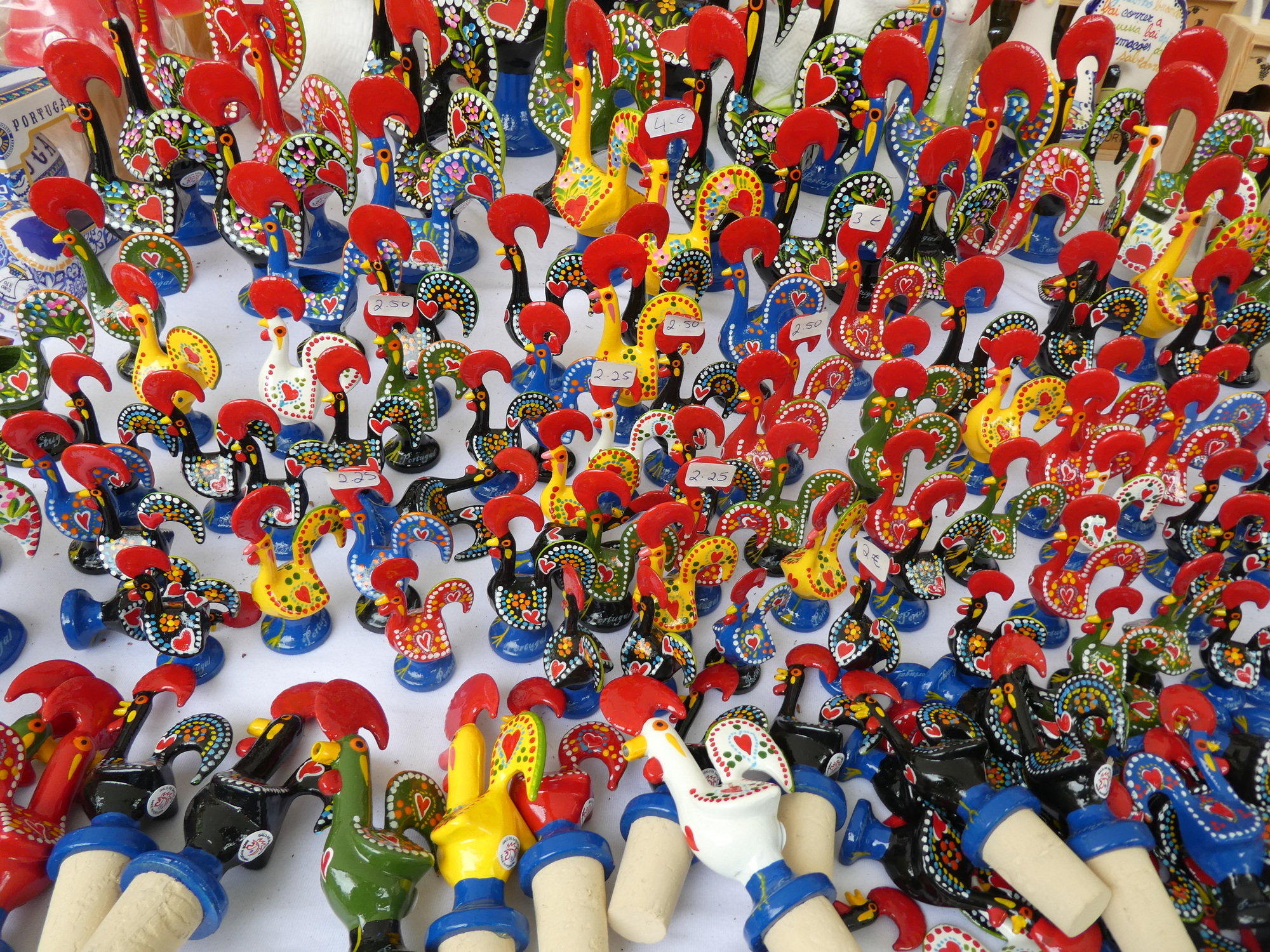 There is a castle (or palace) above the river bridge, dating from 1400. It is mostly a ruin now. But it does have the story of the Barcelos rooster posted on its wall. There are very many versions of this story floating about, many reproduced on post cards. The basic idea is that a pilgrim from Galicia (where Santiago is) is falsely accused and convicted of a crime. He goes to the judge, who is eating a rooster, and tells him that if he is unjustly hanged the rooster will jump up and crow. The pilgrim is hanged, the rooster crows, and the judge rushes to the gallows, to find the pilgrim did not die. In the story on the wall here, the pilgrim is saved by Santiago, who is supporting him under the feet. In other versions, the noose was too loose. However, and this is news (even to the people at Tourist Information!), the rooster in this story is not the colourful rooster on sale in all the souvenir shops. Who is that rooster? Stay tuned for the surprising answer.