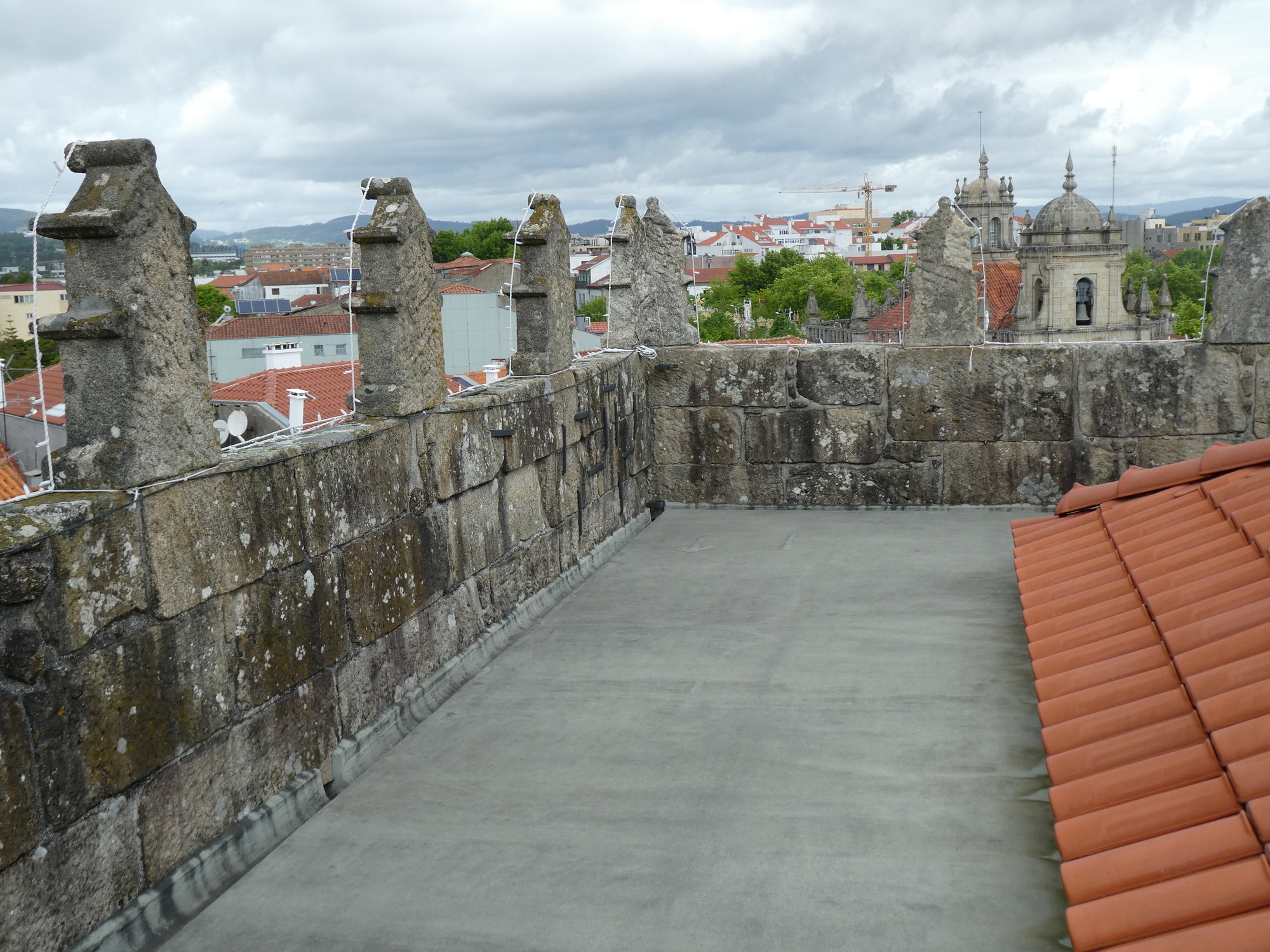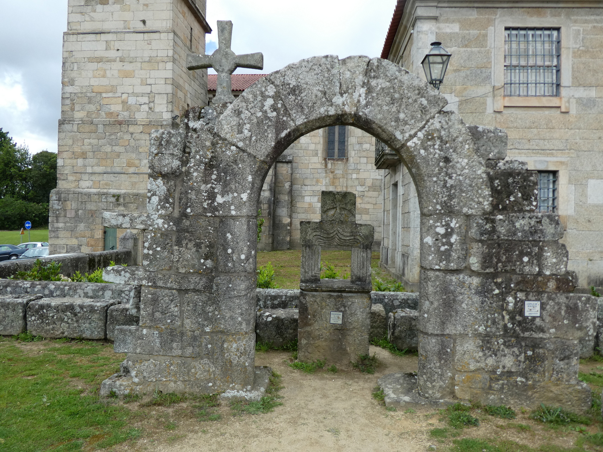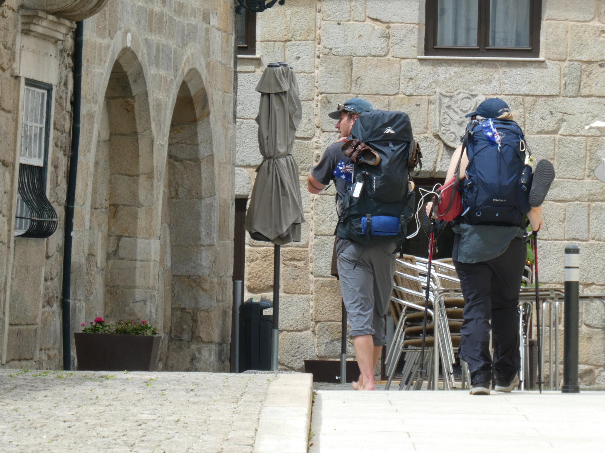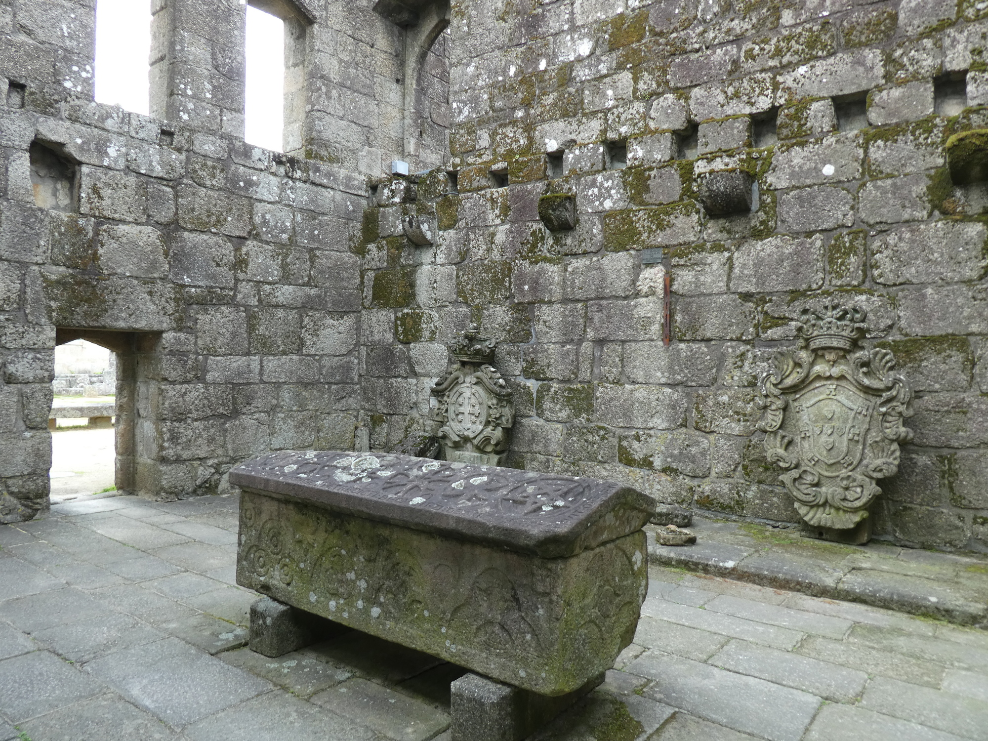 There is a castle (or palace) above the river bridge, dating from 1400. It is mostly a ruin now. But it does have the story of the Barcelos rooster posted on its wall. There are very many versions of this story floating about, many reproduced on post cards. The basic idea is that a pilgrim from Galicia (where Santiago is) is falsely accused and convicted of a crime. He goes to the judge, who is eating a rooster, and tells him that if he is unjustly hanged the rooster will jump up and crow. The pilgrim is hanged, the rooster crows, and the judge rushes to the gallows, to find the pilgrim did not die. In the story on the wall here, the pilgrim is saved by Santiago, who is supporting him under the feet. In other versions, the noose was too loose. However, and this is news (even to the people at Tourist Information!), the rooster in this story is not the colourful rooster on sale in all the souvenir shops. Who is that rooster? Stay tuned for the surprising answer.