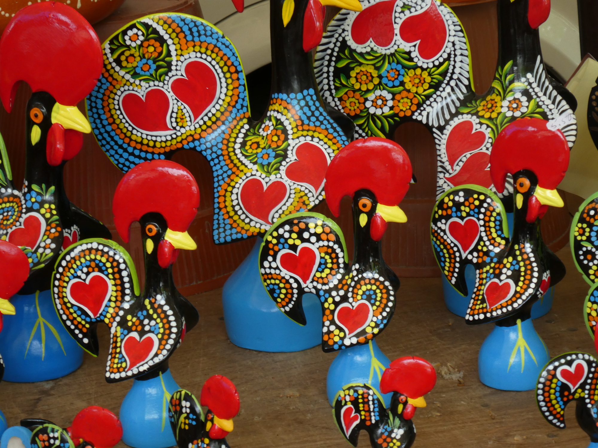 But now at last the truth about the rooster. The rooster image has traditional folk roots in Portugal. It's hard to see in the second photo below, but there were various rooster portrayals, dating at least to 1906. Rooster designs evolved over the decades, but the whole rooster thing took off when the symbol was grabbed by the approximately 40 year long dictatorship (Estafdo Novo), as a symbol of a new day. That dictatorship was still in full flight in the mid 20th century, when an artist, Manuel Torres, came up with the black background, red hearts version in a poster for the , wait for it, Bom Jesus Festival of Crosses for 1955. Between Bom Jesus and the Estado Novo, the Rooster took off!