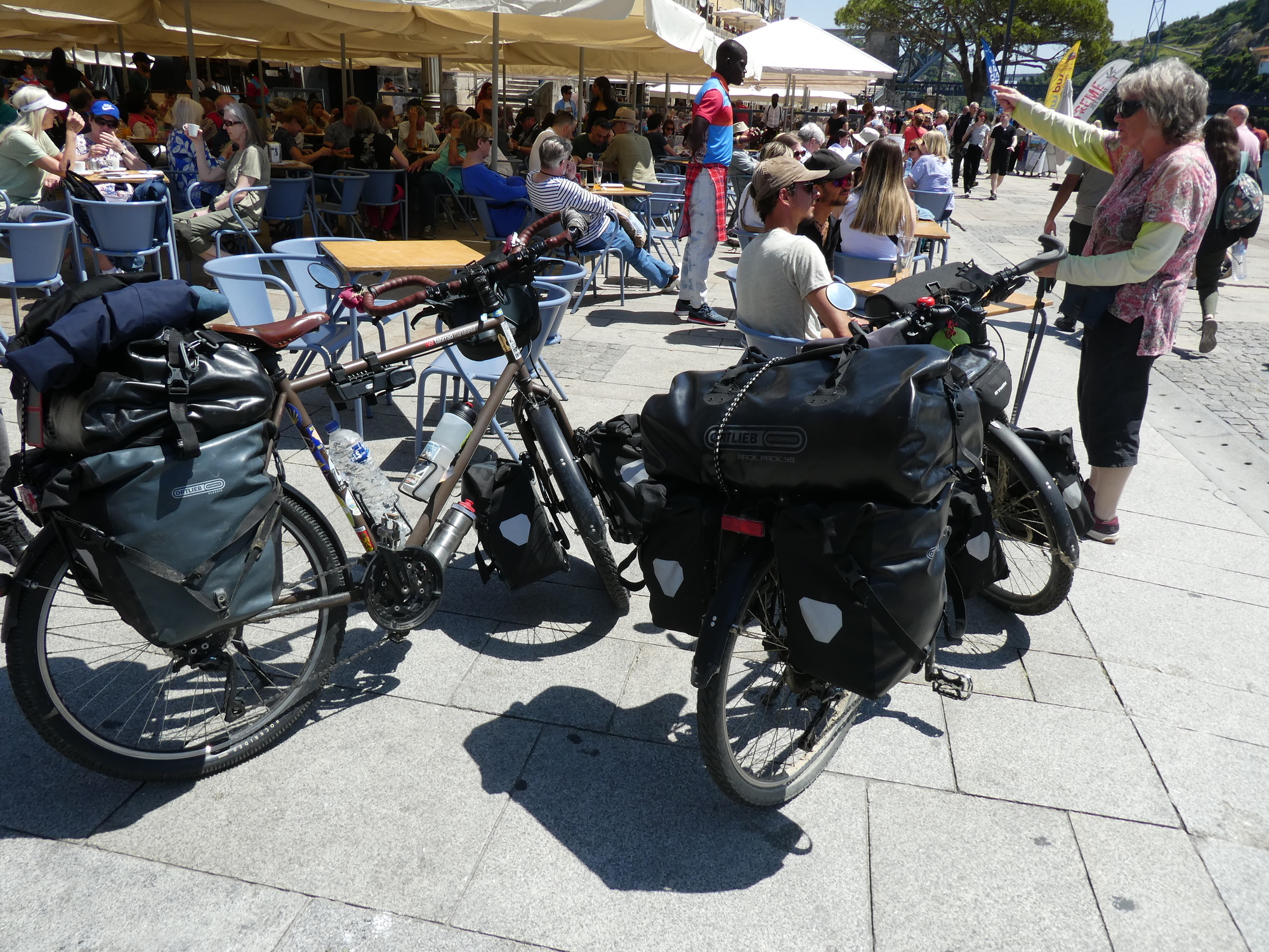 In the square we came across two fully loaded cyclists from Paris. They had already passed through Santiago and were headed for Morocco. They were delighted to speak to us in French. I was thinking that it showed true Paris skill for them to find the central table in the central square, and to hang out there in the sun.