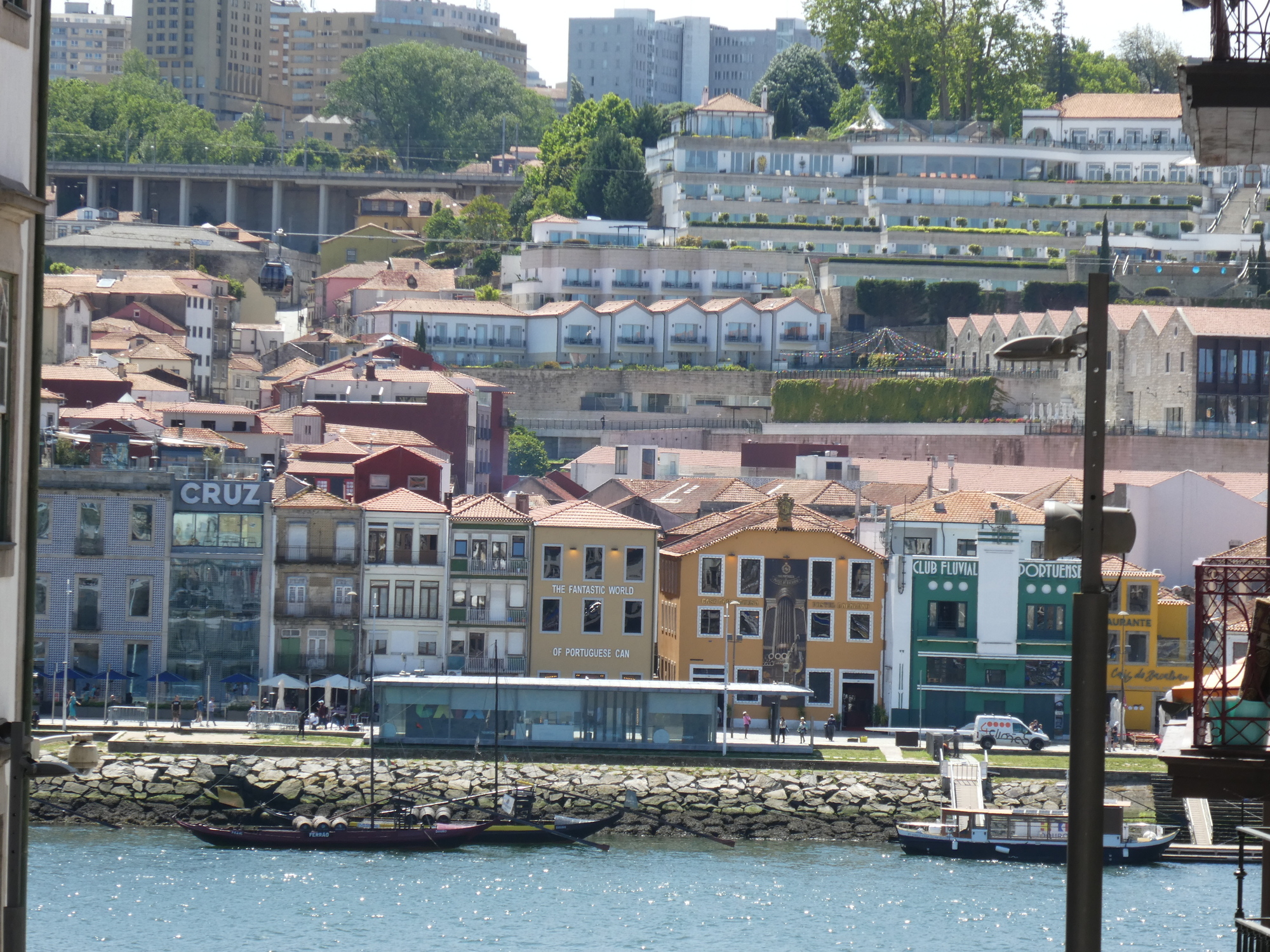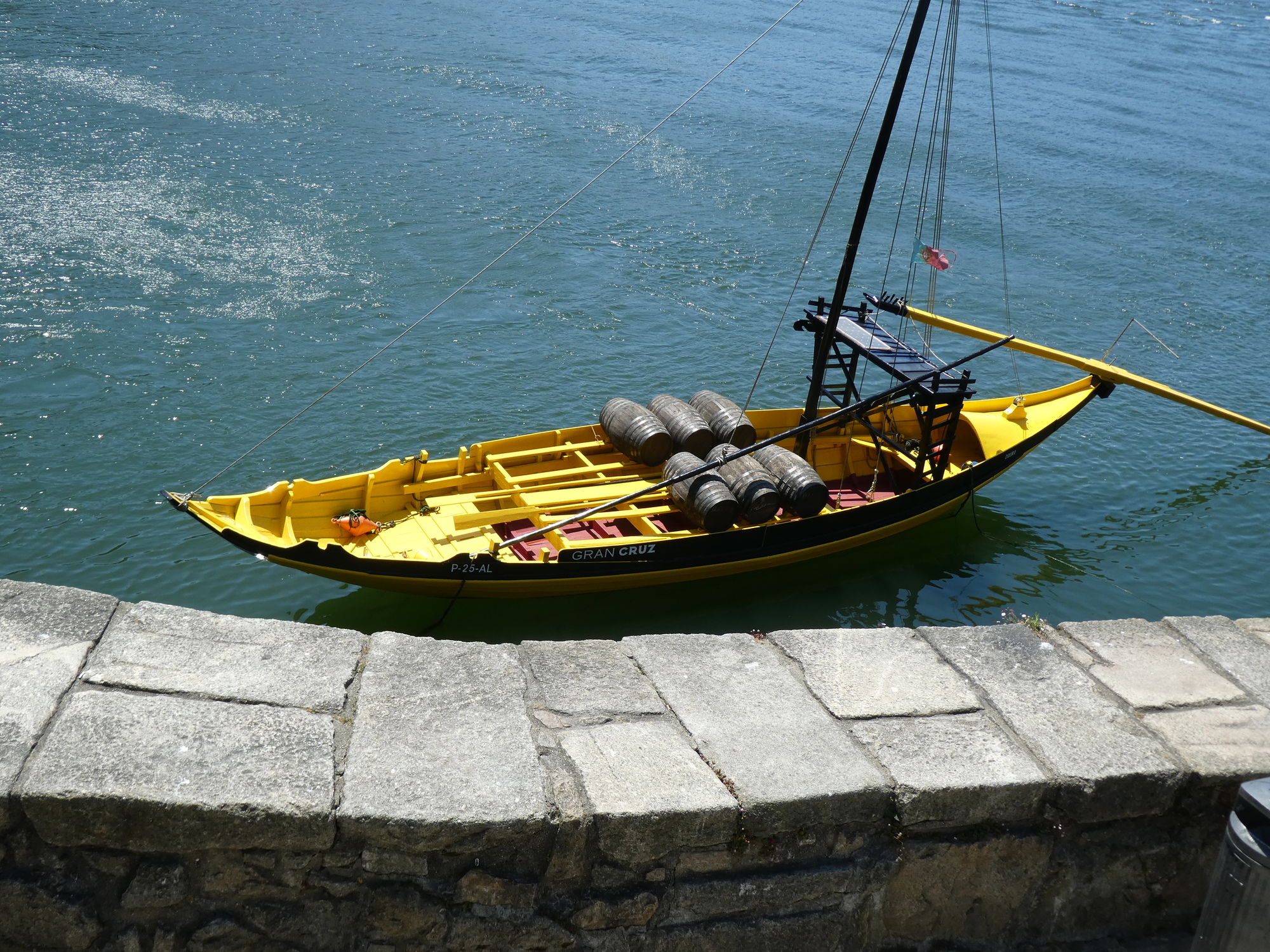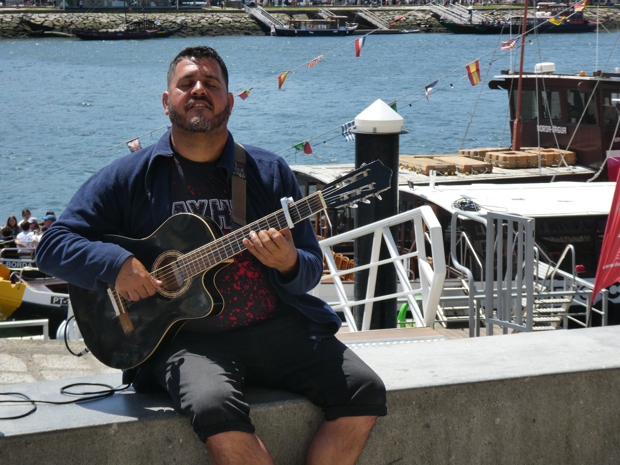 There are a reasonable number of street musicians in Porto, many playing solo guitar. This one was really into it, and his playing really added to the feeling of the place. I like this photo, with the boat and river background.