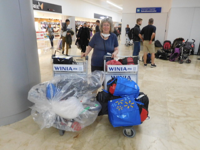 Call us ugly Canadians, but to ward off the possibility that they would have no food in Mexico, we brought along some emergency supplies. This included dried apples and tomatoes from our farm, and what we call "cat food", which is tuna or chicken salad in a kit with crackers. The cat food did not go down well with security, who decided to call it a "gel". The cans got a lot of scrutiny, and finally passed because it all fit on one of those bags they have for your liquids. We then continued our criminal ways by "forgetting" the apples and tomatoes for the Mexican ag authorities!