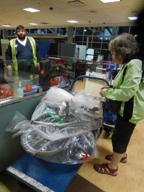 The three hour lead time turned out to be about right, and we were glad to have arrived just before the main bulk of passengers. They, however, were not so glad to see the Westjet agents struggling to book us in, up at the front of the line. There was not really any problem about the check in, it's just that they wanted to do things like weigh the little bikes, and debate where on the mess of metal parts they wanted to put their tags and stickers. They also worked on finding us two seats together, and did come up with ones at the very back of the plane. This turned put to be not so great - I'll get to that.