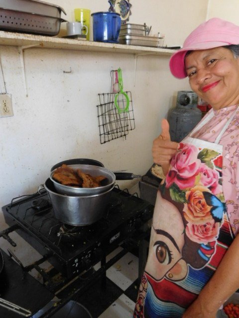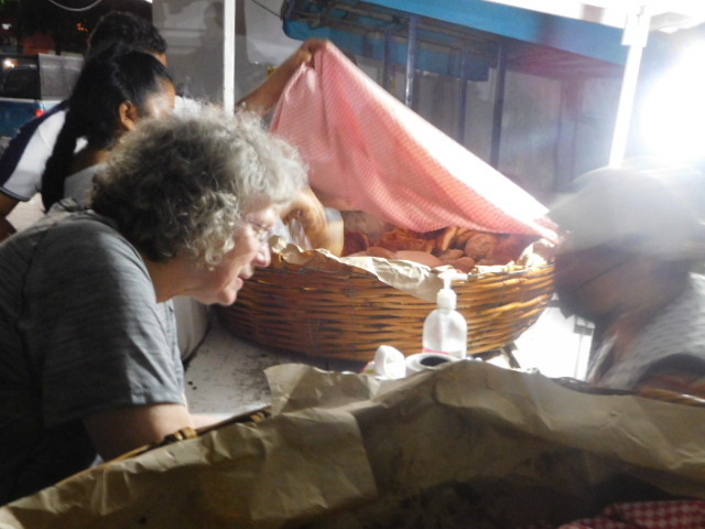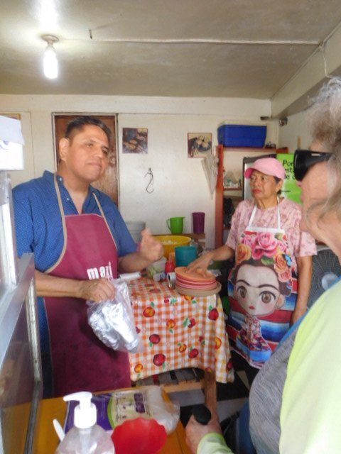 Certainly our bakery was closed, and the fruit store and the juice place. But a couple of the groceries were open, and two of the hole in the wall torta shops. We stopped at a torta shop, run by a cute old couple much younger than us!). They invited us into their cubby hole to see what was cooking. We find the people here so sweet!