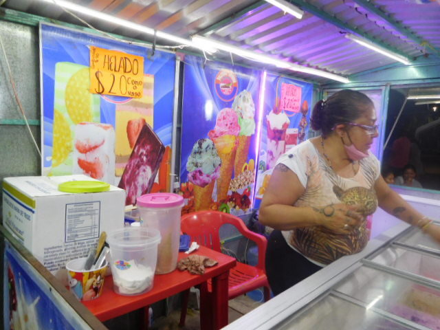 At last the bikes were assembled, and I went out for a test spin. Down by the local bandshell several stalls were set up, some with dry goods and one with bakery. And one in particular with helado - ice cream. I went home and grabbed Dodie. A (sort of) cool evening stroll in a (sort of) market is lots of fun.