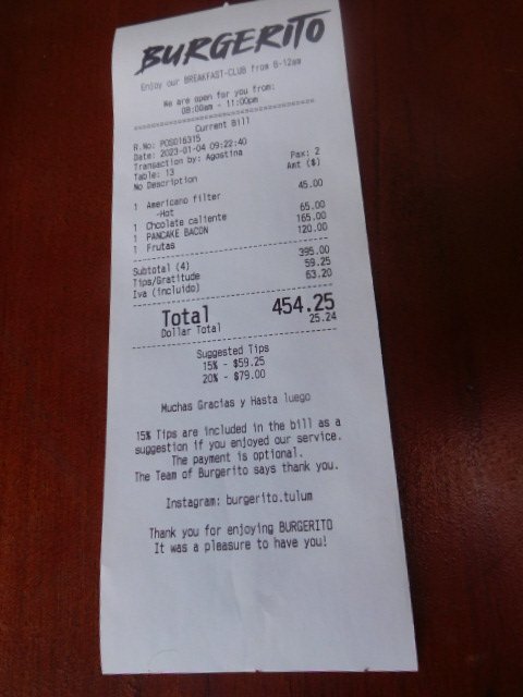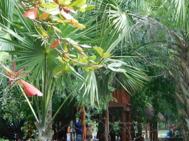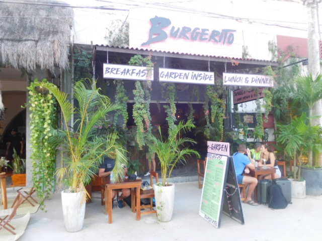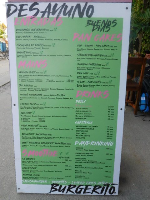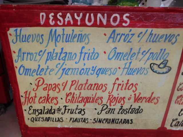 The Tulum tourist strip is no more than 1/2 km long. For that distance, there are tourist shops, and restaurants, many featuring leafy decor with cane or teak furniture, and perhaps thatched roofs. Beyond the strip, things devolve back to the more commonly dusty, sort of industrial, Mexican town motif. The restaurant we chose was at the beginning of the south end of the strip, and was suitably leafy. And the menu featured the desired pancakes!
