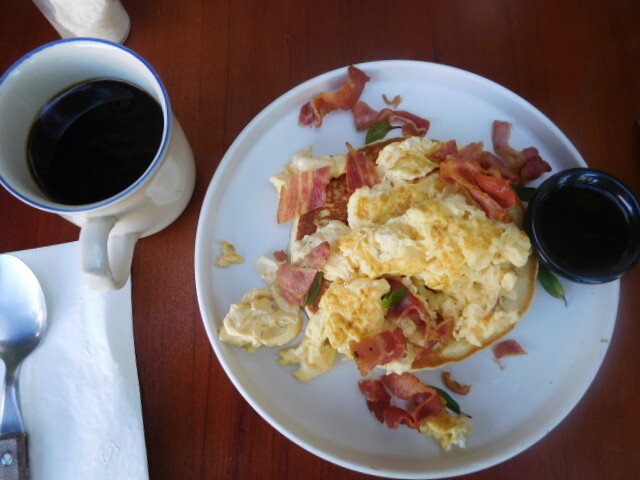This morning we again passed up the roadside stalls and cycled to the tourist strip. Where else could crybaby Steve get pancakes, eggs, bacon, and coffee, his native power food? And, he argued, power would be needed to lounge in a cenote all day.