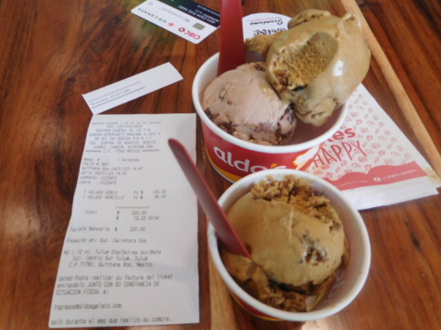 We got home to the hotel, but soon turned around and went to the gelato store, which is a chain called Aldo's. There are two just on the short strip here, and scads in Playa. The gelato was very good, but for some reason did not create the total joy that the German, Austrian, and Italian variants do. We thought maybe it is too sweet. The ice cream from the market lady in Cancun actually went down better.