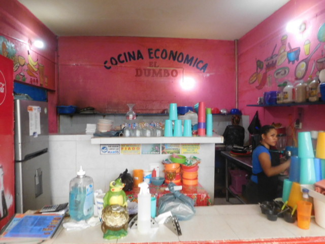 OK, so I started to trudge home. But not before stopping in at a fruit store. At home just before leaving I had done a double take to see that grapefruit was something like $3 each, and I mentally scratched them off my menu - forever? But here was pink grapefruit, for 15 pesos per kilo. Was that a lot? From this point in the afternoon - the heatstroke point maybe - we can trace a growing inability to cope with the currency and the prices. Watch it happen: I picked up a grapefruit and a starfruit. Total price, 9 pesos. - Well under a dollar. Cool. Next, having failed to see an OXXO, I stopped in to a little restaurant in a market building. I asked if they could fill my thermos with coffee. Oh, oh, I seem to remember falling foul with the same request in a Tabac in France.
