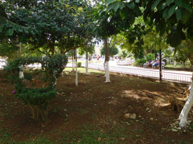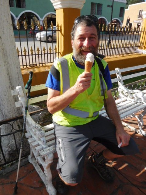 Just outside of Tikuch, we did finally come to an OXXO., and this one even had a little shaded picnic ground. This was good, because the temperature had now risen from that 17 degrees to about 40. Dodie was really wilting. But a cold coffee drink from OXXO helped. There was also a water tap by the tables, and we were able to soak our heads stuff wet washcloths in our clothes - almost as good as a cenote!