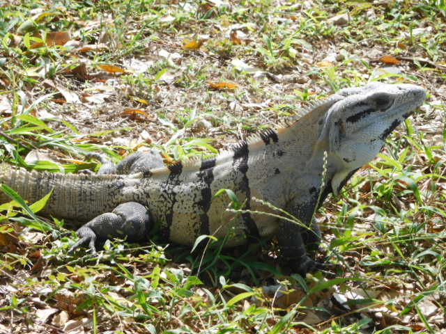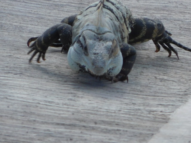 As we sat, vigilant Dodie spotted a nearby male iguana, with a female in the distance on a rock. We threw the male some carrot chunks and he thrilled us by coming to eat them. So I followed with some of my Nutella sandwich. He actually licked the Nutella before gobbling the bread. Quite a discerning iguana!