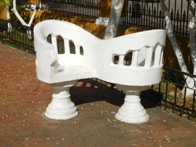 A popular local legend tells the story of a man who had a daughter he adored who was being courted by a young man of the village. The father, jealous, asked them as a condition of their courtship that they only venture as far as the benches in the park. They accepted, but the father then realized that the traditional park bench gave them plenty of opportunity to physically close to each other, so he decided to create the “silla tú y yo”, which allowed them to speak to each other and look into each other’s eyes while always maintaining a discreet distance."