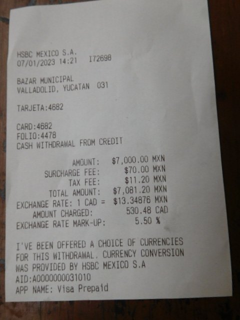 This was our first try with an ATM, since we had brought a fair amount of cash that our bank back home had sent to us in the mail. Now we were using a new 10 currency pre-paid credit card, that we had loaded with pesos, Canadian dollars, and euros. The machine proposed to concert the Canadian dollars to pesos, and I missed the button that would have stopped that. So it had a field day, with all the great fees and charges you see on the receipt. After we had studied that, we went back in and got the thing to just straight withdraw pesos from the card. Even with this, converting currency and taking it from an ATM is never cheap. Except for the risk of carrying a lot of cash, the best is really to bring it from home.