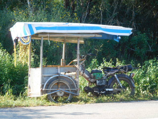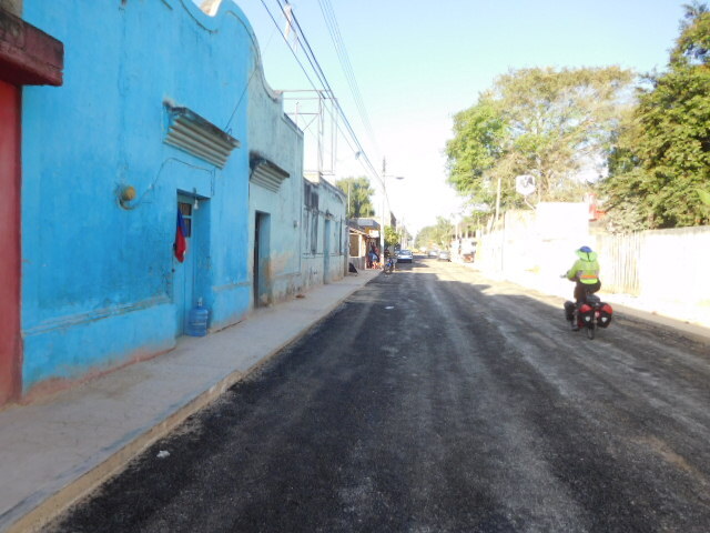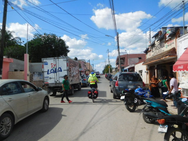 The turnoff to Chemax was totally unmarked, perhaps reflecting the small size of the town. We could have carried on without turning, but we had some kind of fantasy hope of finding an OXXO, or other source of food. It felt good to be on the Chemax road, because any fast cars or gravel trucks on the main road were replaced with slow moving cargo bikes or cargo bike/moto conversions. Typically these had abuela in the front and someone pedaling or driving from behind. Dodie thought this would be a good arrangement for her, although surely if we were doing it the vehicle would be a shiny Hase Pino.