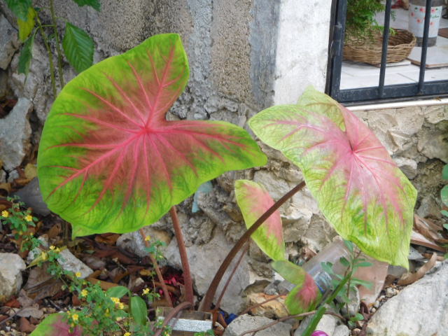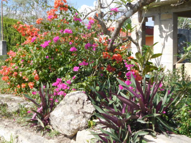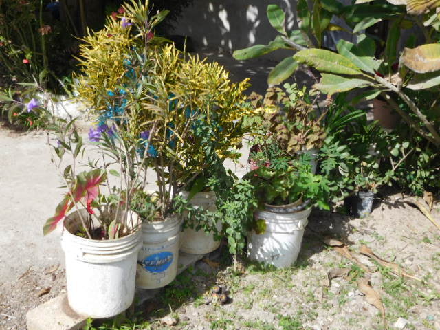 When we looked at the gorgeous planters for sale on the road from Tulum, I remarked that the local people do not seem to really raise plants in planters. Dodie said sure they do, and I countered with having seen not a single marigold or petunia (staples of container gardening out our way). Since then, Dodie has been noting container plantings and other flowers by houses. The photos below either make my case or hers. The caladium below is nice, but the pots in the next shot are just buckets!