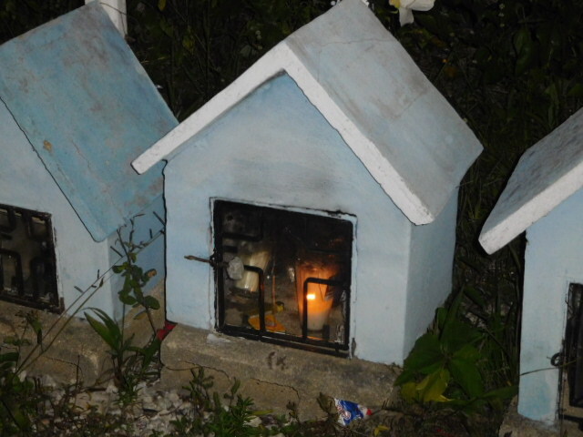 Out along the highway, there are often little shrines, which we assumes commemorate road accident victims. We came upon one of these in the dark and were surprised to find a candle burning inside. Clearly there is a mourner that is a really early riser, unless the candle was a 24 hour burning variety, which looked possible. Anyway, someone was on the job.