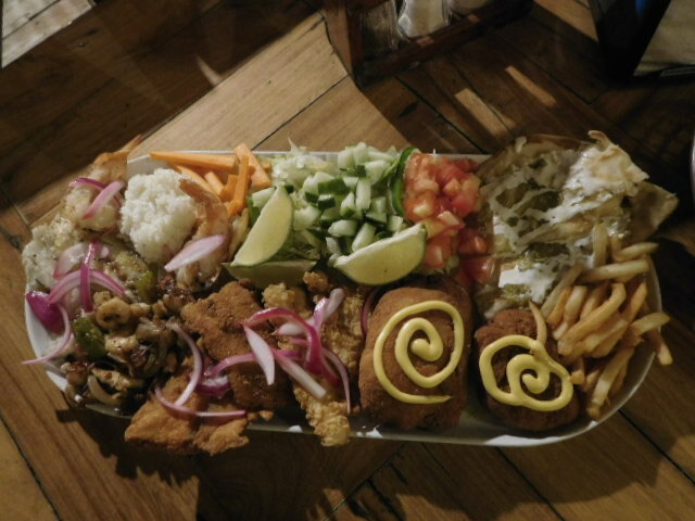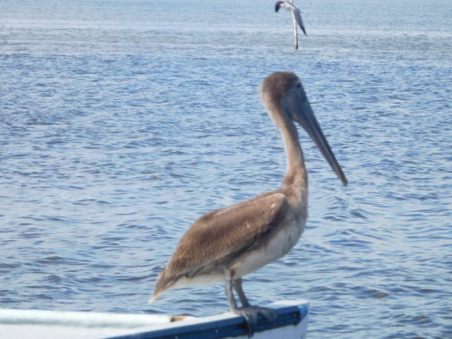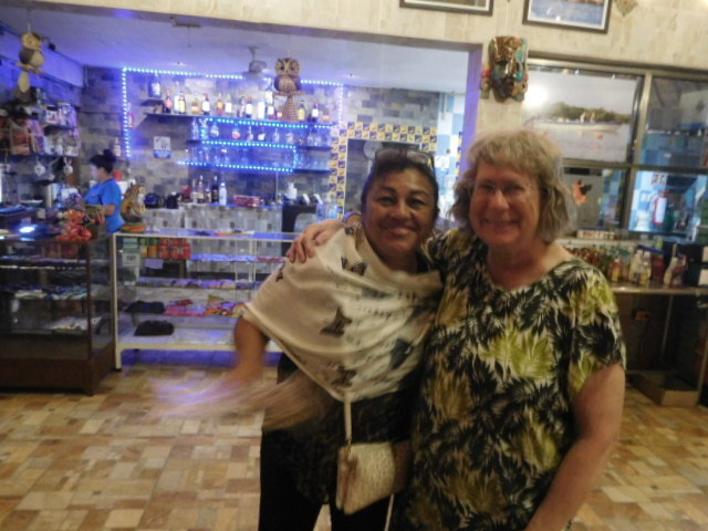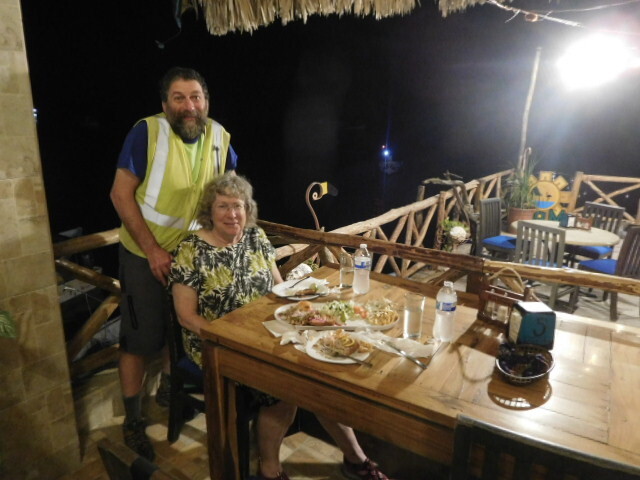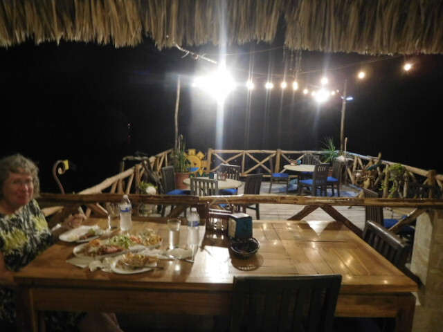 Our food consisted of a very large plate with five or more seafood preparations plus salad and fries. Normally we don't go for seafood, but this was really good, and even Dodie found things to like in it. Adding to the enjoyment was the knowledge that it all had been caught just here, inside or just beyond the lagoon. In fact as we watched, shrimp boats were cruising back and forth with nets just beyond our pier. Diego IV told us that the fish component was "sea trout", caught with rod and reel just here.