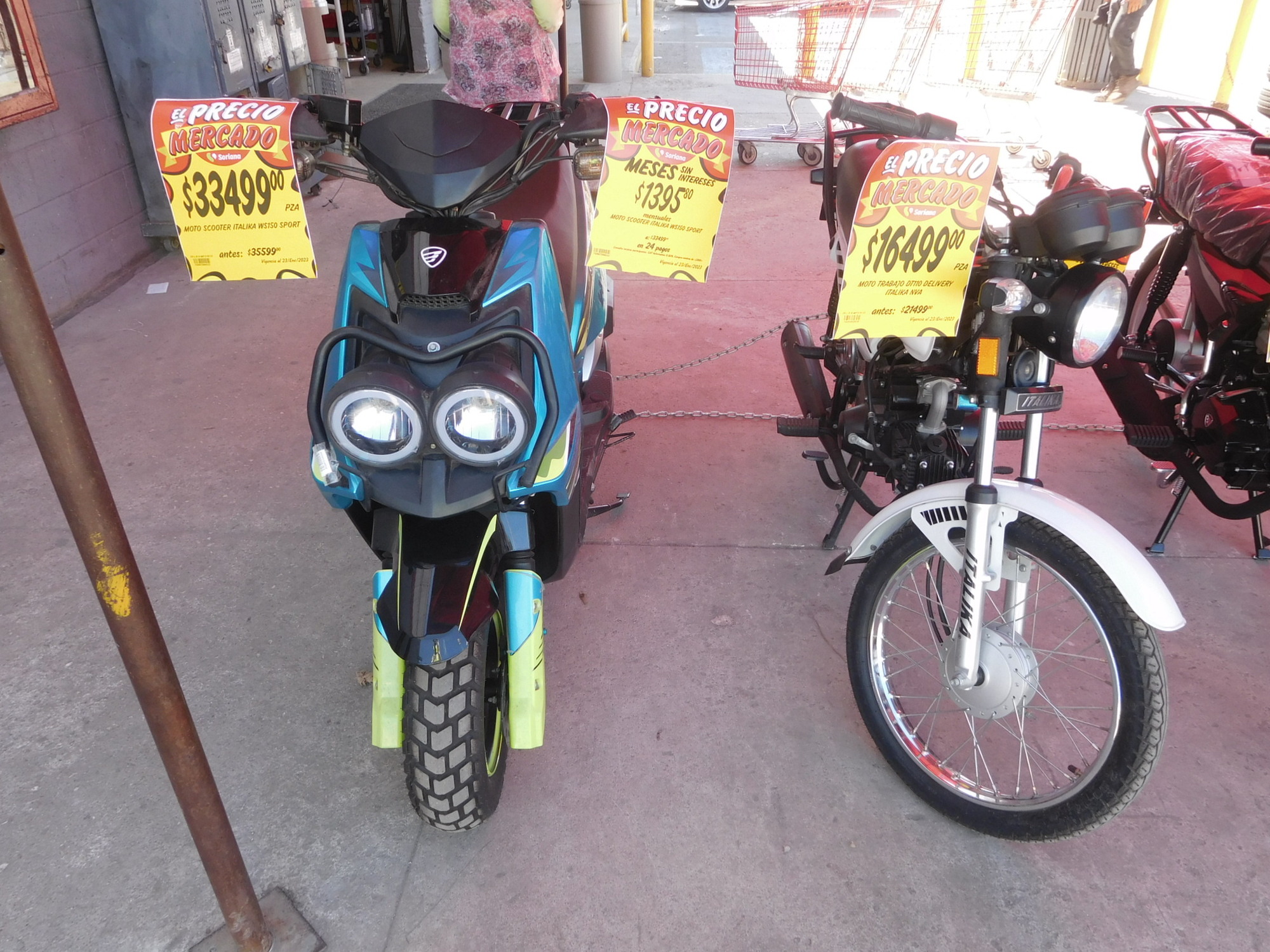 With the postal situation pretty well sorted out, we set off toward our hotel, to see if we could stash bikes and gear and then go walking. We first paused at Soriana market, noting that they have increased the number of motos for sale outside. It's still about 16,000 pesos to drive one off. Inside we saw that that is only a touch more than a large screen TV. In terms of good deals, I think the motos are the winners.