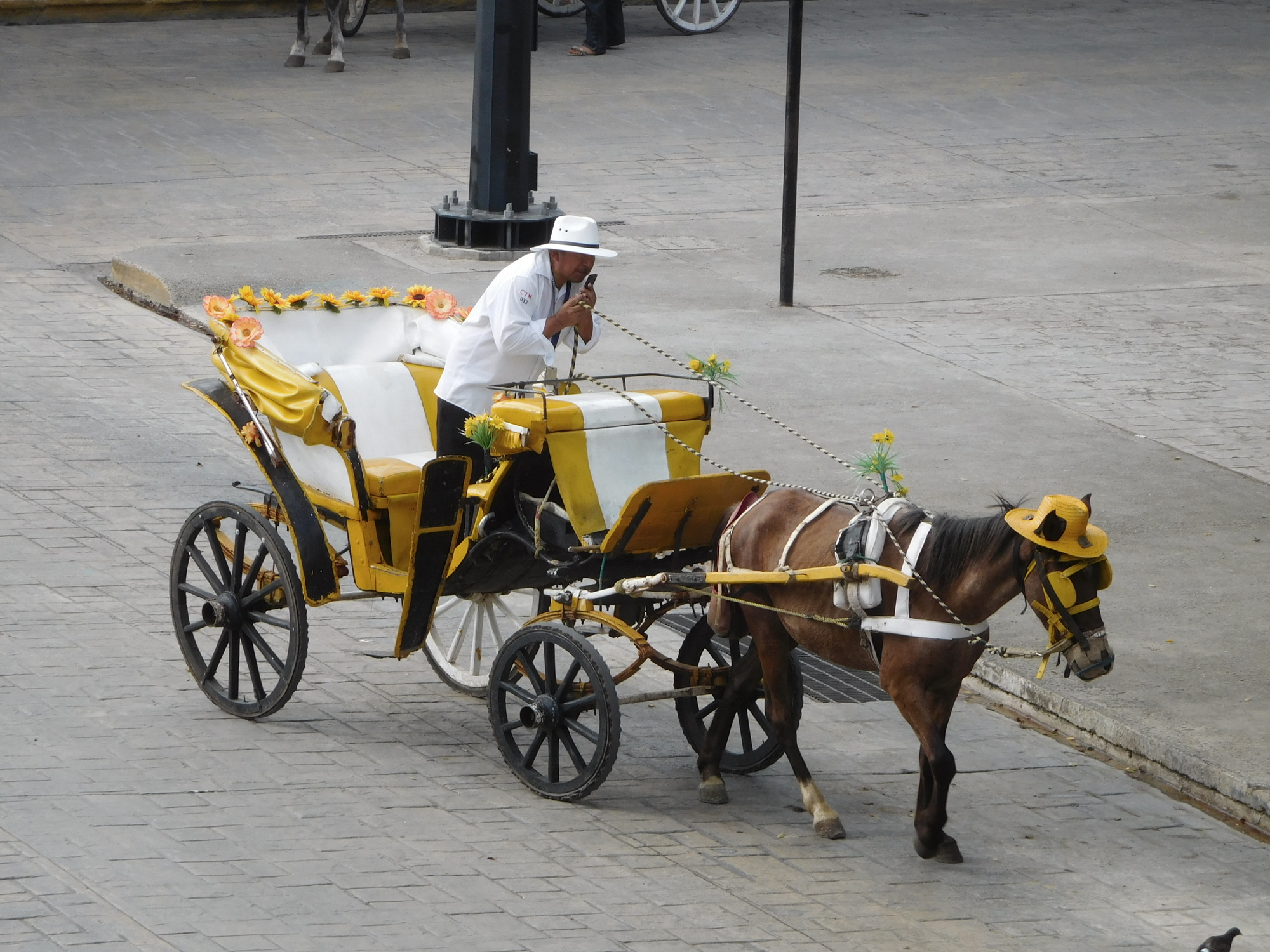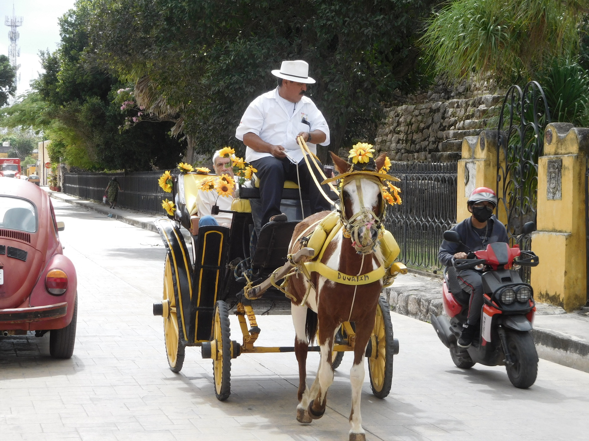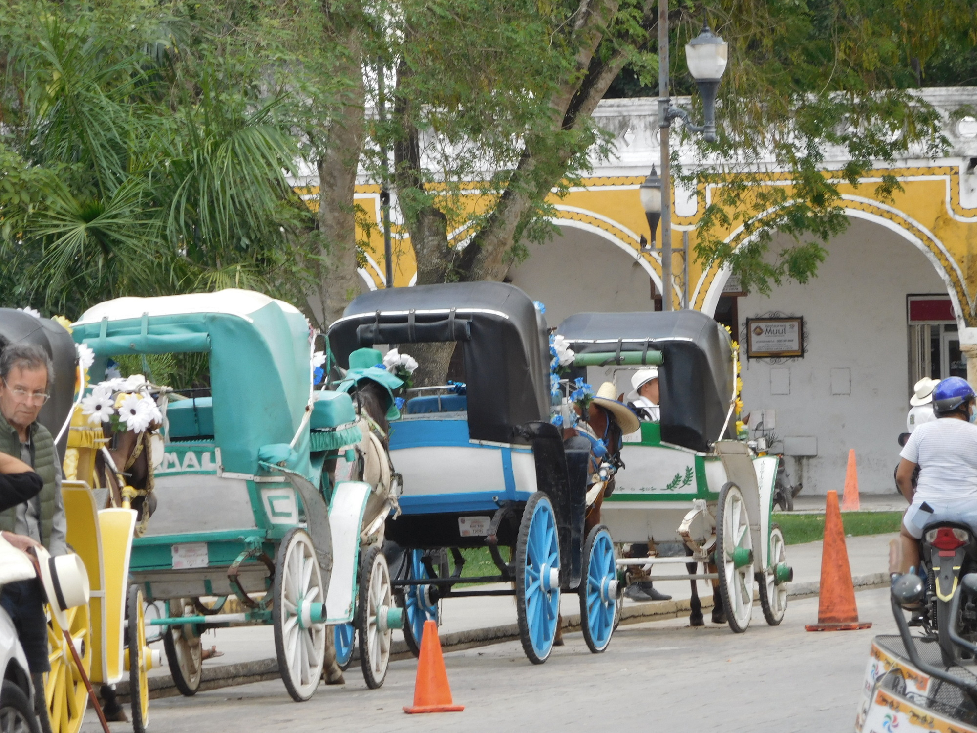We see our first Izamal caleche. We like the horses' hats!