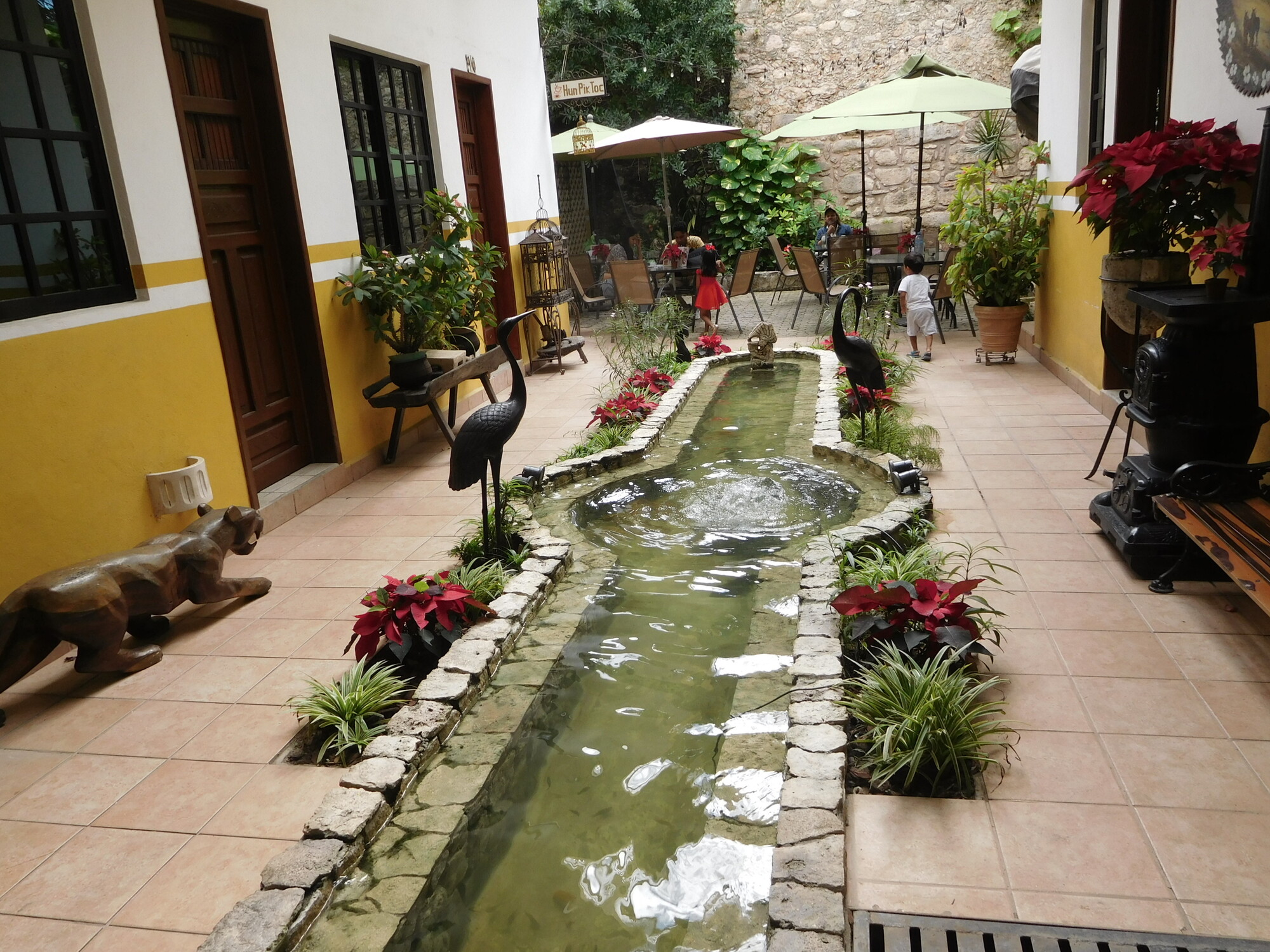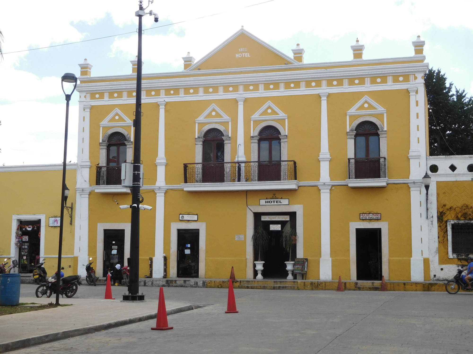 Another yellow landmark on the square is our hotel, the San Miguel Arcangel. We had stayed there before, and liked the central koi pod and general decoration. I lifted my bike up the stairs at the entrance and past reception and was fixing to go back for Dodie's, when the reception lady accosted me with you can't park your bike here. That quick attack always makes me see red, and when she followed with your can't take your bikes in the room, the war clouds were gathering fast. But Dodie smoothed things out, and soon we were rolling our bikes into our nice room on the ground floor.