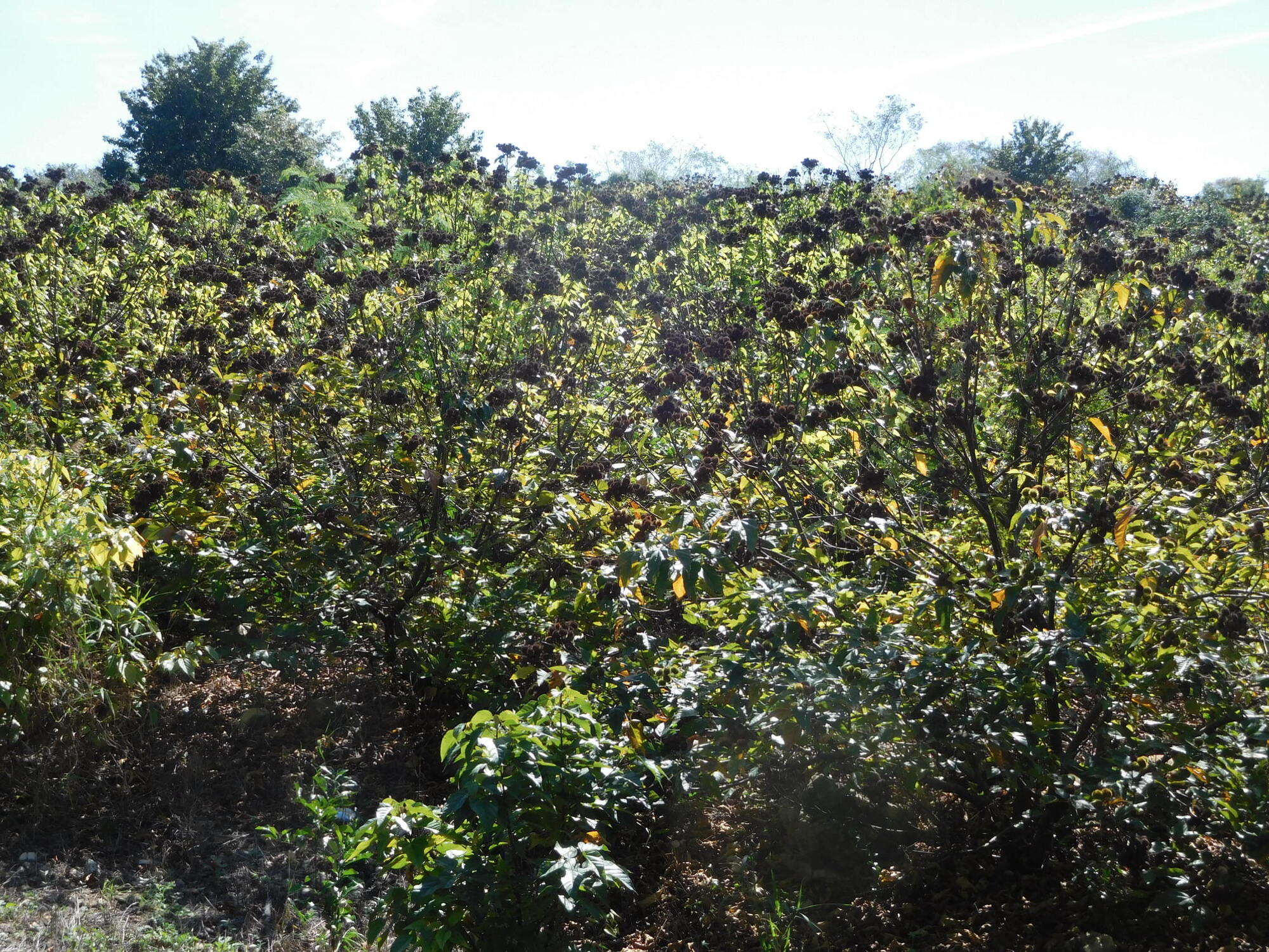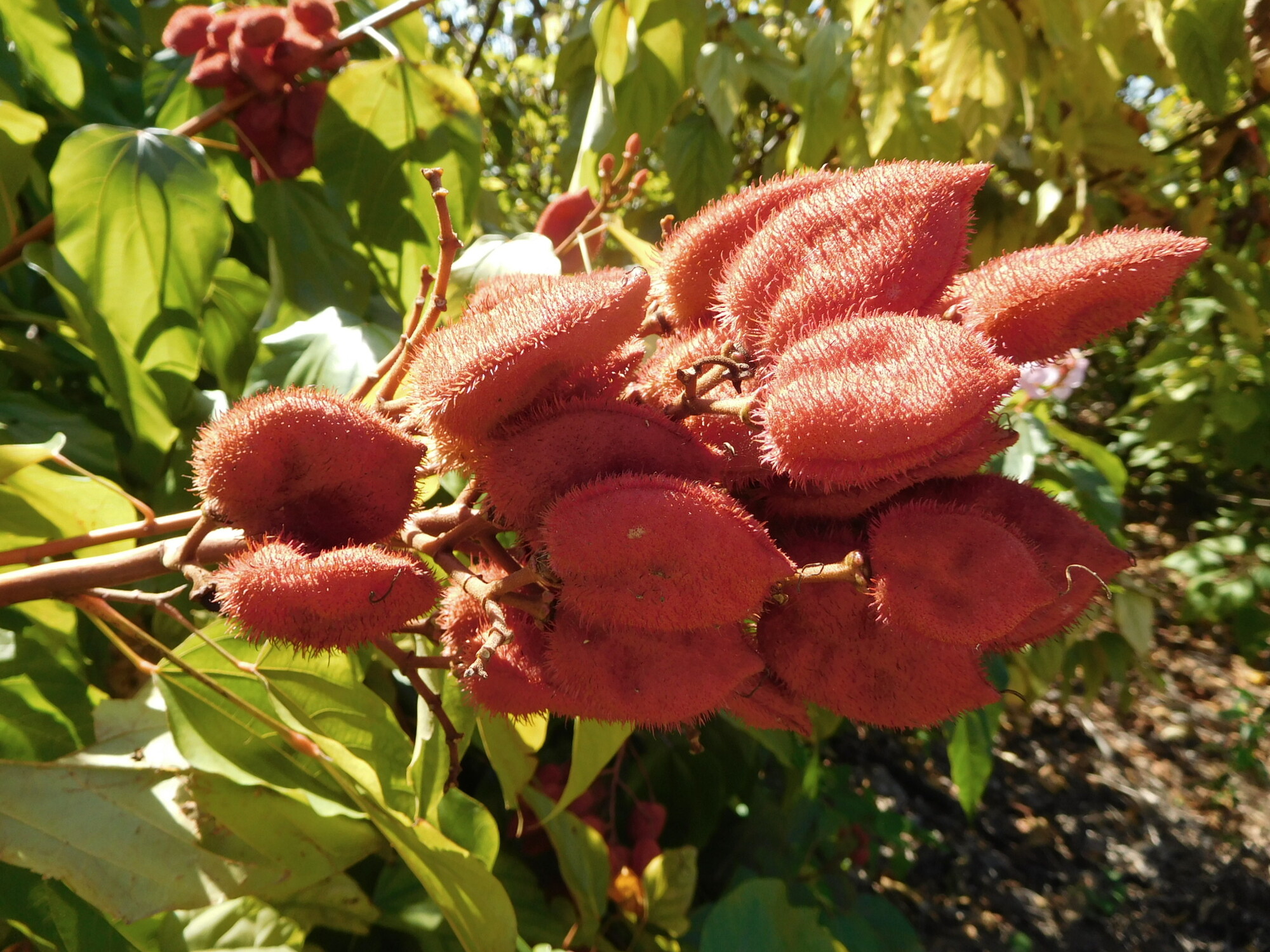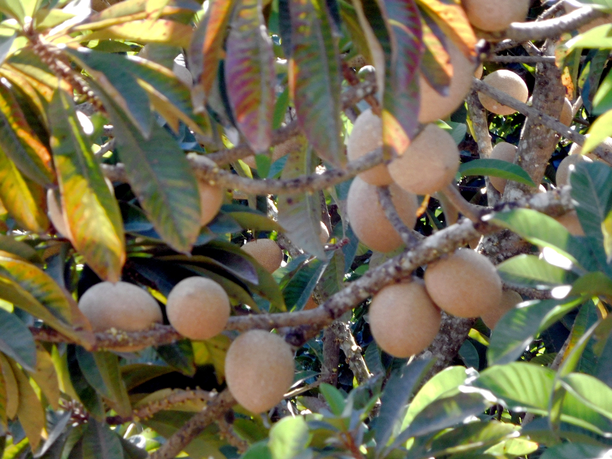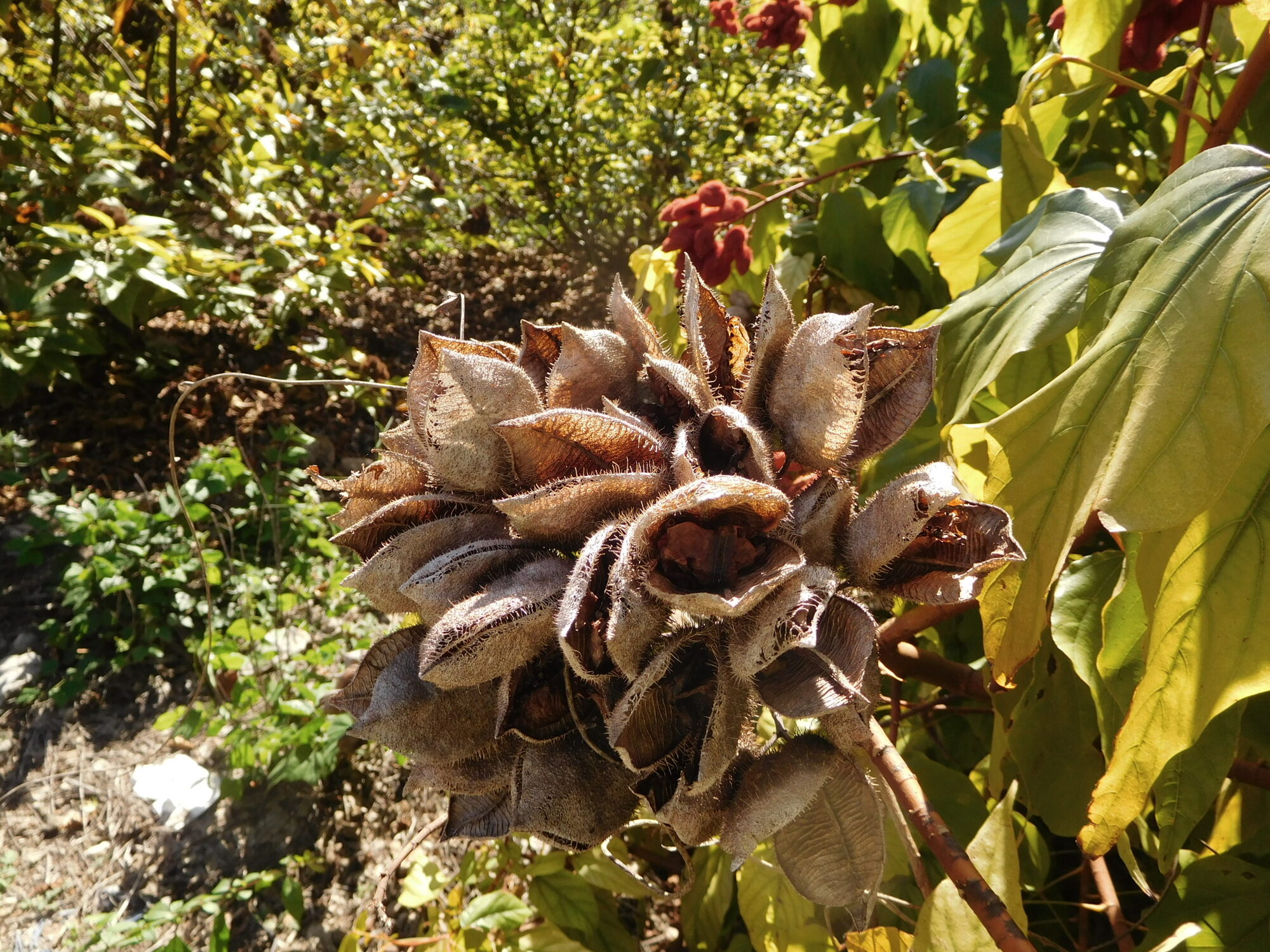 There did not seem to be any order as to whether a given tree would be an orange, tangerine, grapefruit, or pomelo, but at least we can tell these apart, given a chance (and a knife). But some trees were just a total mystery. For example, there were some large plantings of the thing shown below. The pods, or whatever, did not want to pull off and they seemed to dry and open to reveal seeds of some sort.